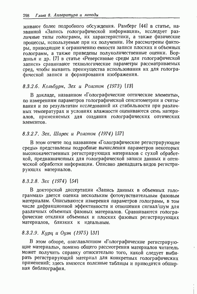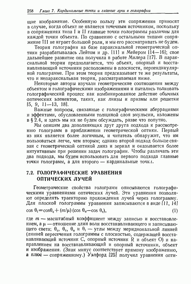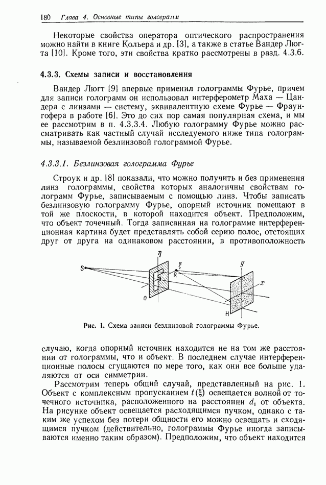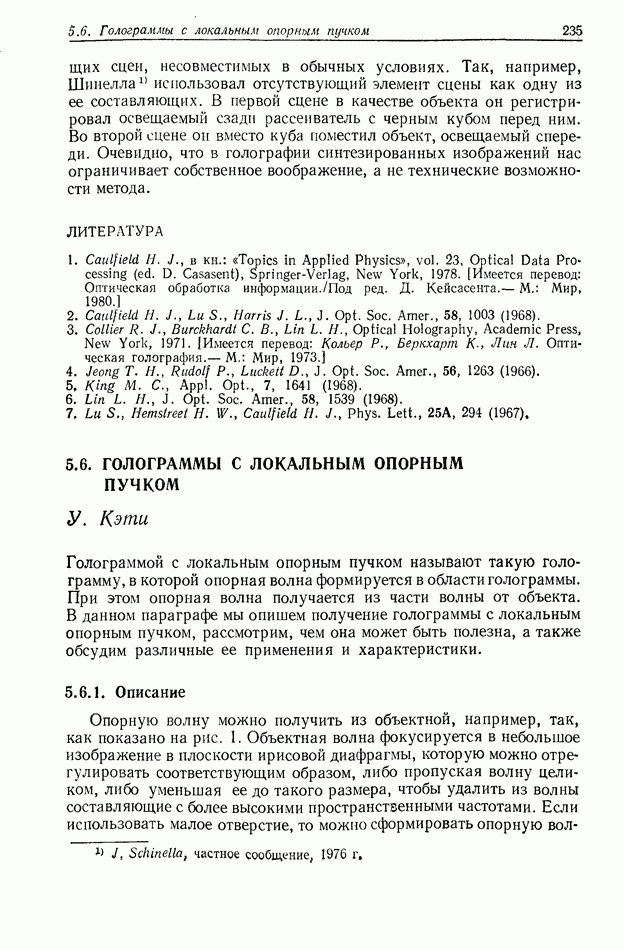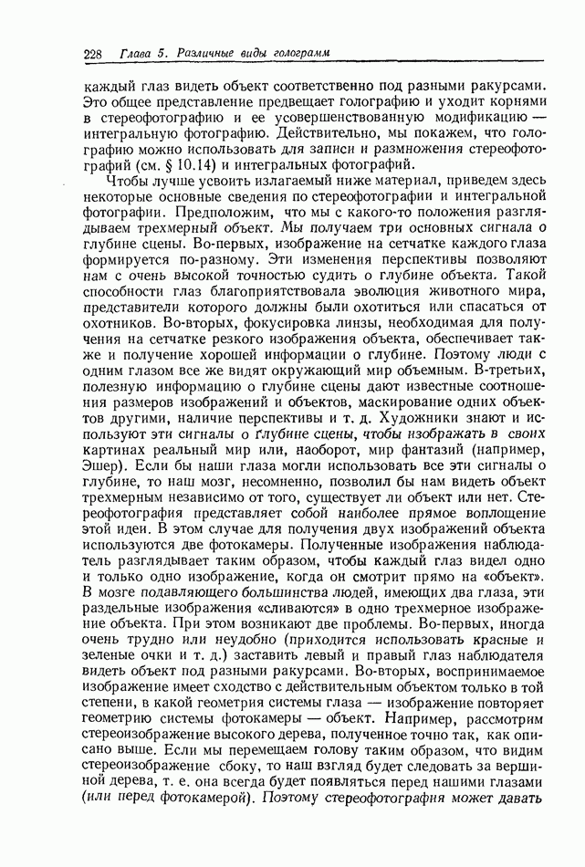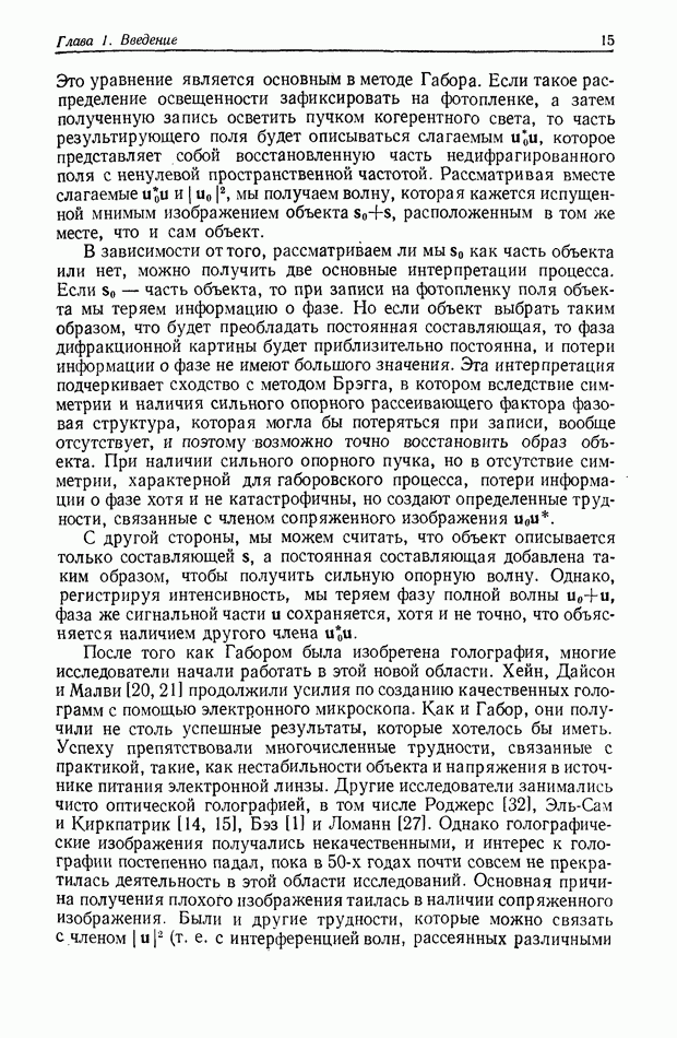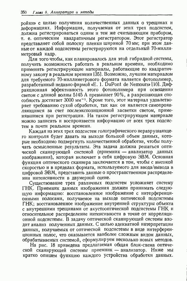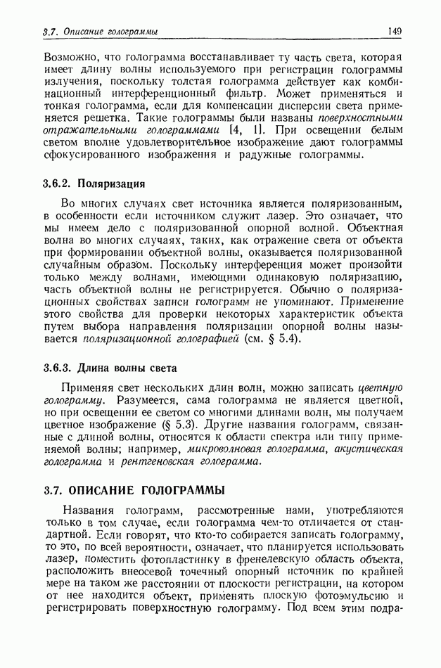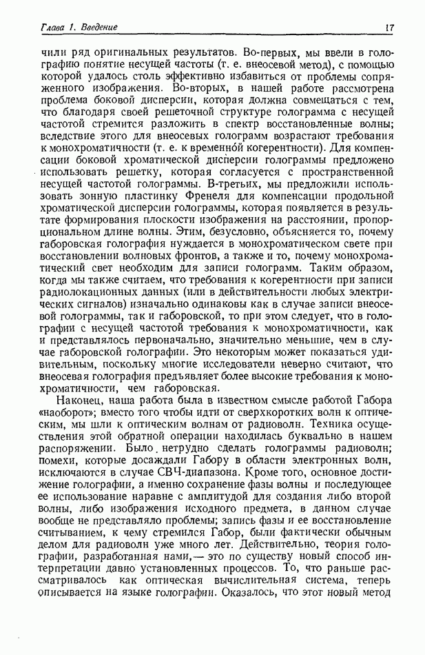 Предисловие редактора переводаВ последнее время голографические методы получения и анализа изображений находят все большее применение в различных областях науки и техники. Путь к использованию голографии отнюдь не был гладок. Хотя популярность она завоевала сразу же после появления лазерных голограмм в начале 60-х годов, прошло немало времени, прежде чем были преодолены многие технические трудности, разработаны и применены новые, основанные на принципах голографии, методы анализа и контроля явлений и объектов. Процесс расширения областей использования голографии продолжается и поныне. В научно-исследовательских институтах и научно-производственных объединениях возникло немало лабораторий, призванных распространять уже известные и разрабатывать новые голографические методы для различных областей науки и техники. Голография стала широко использоваться и как средство трехмерного отображения объектов. Возможности практического применения уже расширились настолько, что голография затронула и космические исследования, продемонстрировав целый ряд преимуществ голографических методов над традиционными. Интенсивное развитие голографии, расширение областей ее применения, постоянное увеличение числа специалистов, так или иначе связанных с голографией, — все это оказало влияние на рост интереса к литературе, рассматривающей те или иные аспекты голографии. За последние годы появилось немало книг по голографии. Одни из них (см. список литературы) посвящены проблеме в целом, другие — отдельным разделам голографии и конкретным областям ее приложения. Тем не менее вне поля зрения специальной голографической литературы осталось немало неосвещенных вопросов. Кроме того, назрела необходимость в подробном справочнике по голографии, в котором с достаточной полнотой были бы рассмотрены все главные разделы голографии. Наиболее близко удовлетворяла этим требованиям изданная в 1970 г. в русском переводе книга Р. Кольера, К Беркхарта и Л. Лина «Оптическая голография» [5]. Однако материал ее частично устарел, он уже не является достаточно полным и не отражает современного уровня развития голографии. Предлагаемая читателю книга представляет собой своего рода энциклопедический справочник, охватывающий как оптическую голографию в целом, так и формирование изображений и оптическую обработку информации. Для написания этой книги привлечен авторский коллектив в составе 31 специалиста из различных научных учреждений США и Канады. В авторский коллектив входит большинство ученых США, наиболее активно работающих в области голографии, оптической обработки информации и их применений. Введение к книге написал Э. Лейт — один из основоположников лазерной голографии, внесший большой вклад в дело ее практического использования в разных областях науки и техники. В переводном издании в книгу внесены некоторые изменения. Во-первых, она разбита на два тома и, во-вторых, с любезного разрешения редактора американского издания проф. Г. Колфилда, в т. 2 помещено «Дополнение», написанное крупнейшим советским специалистом в области голографии и оптики чл.-кор. АН СССР Ю. Н. Денисюком. Необходимость введения «Дополнения» обусловлена тем, что в американском издании весьма слабо отражены работы советских авторов и недостаточно освещен важный разде