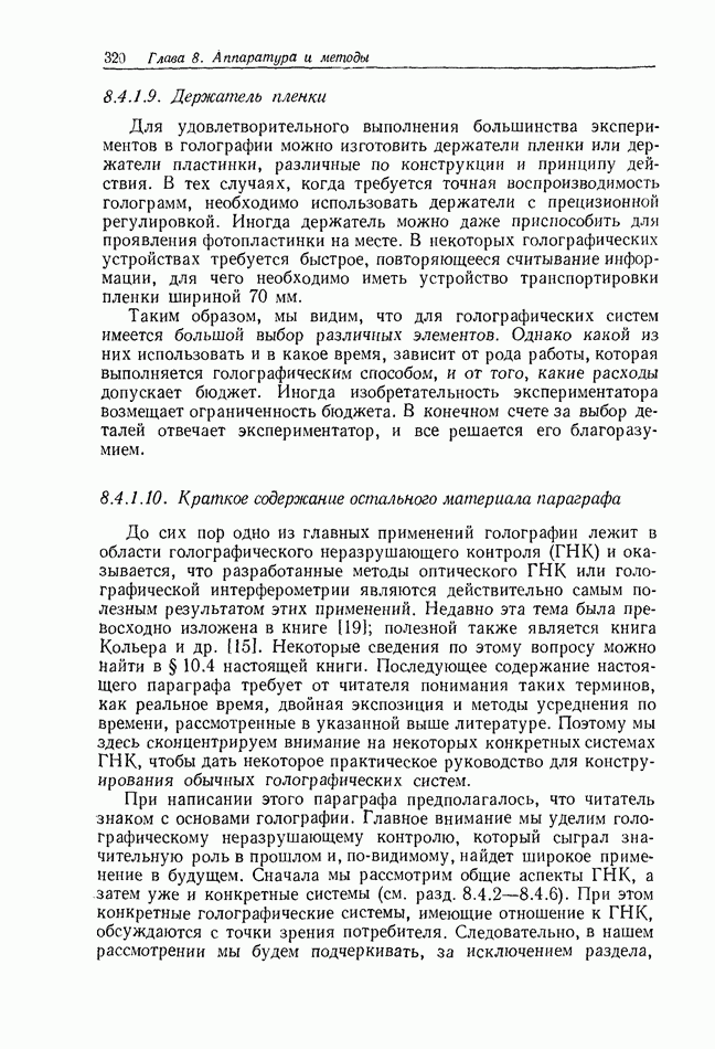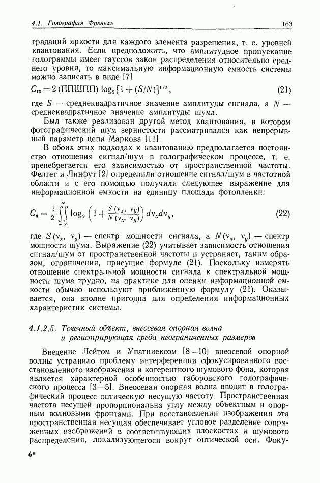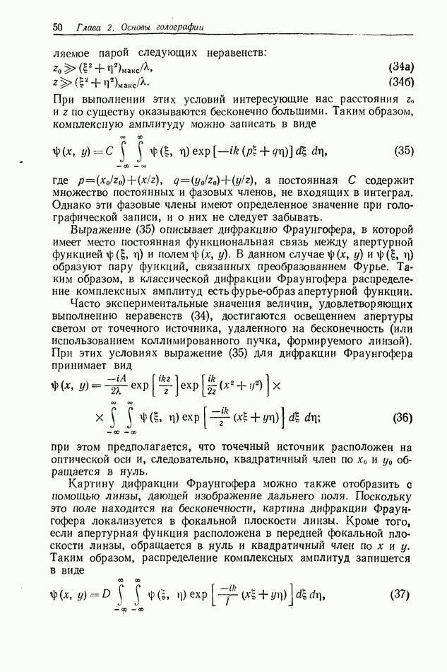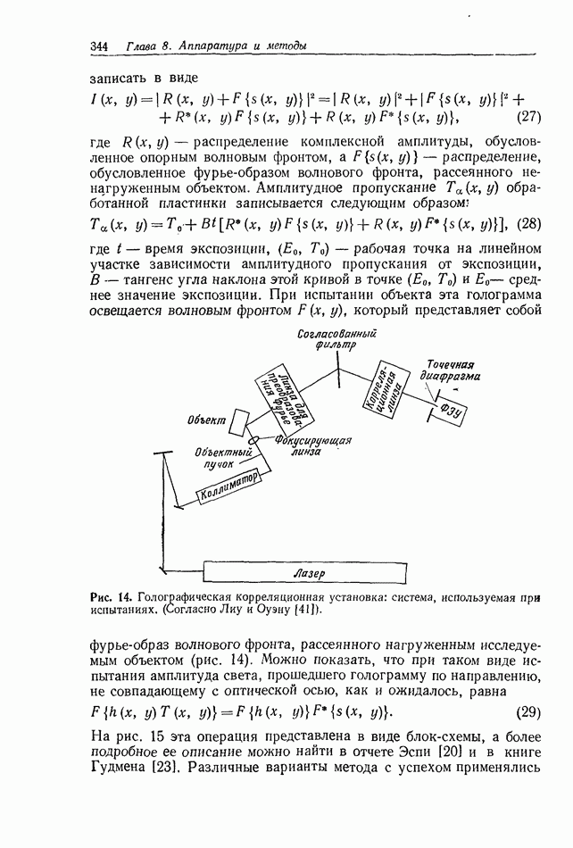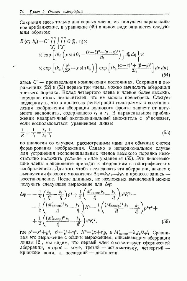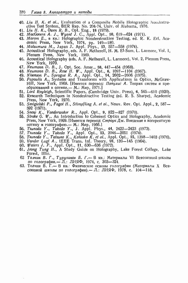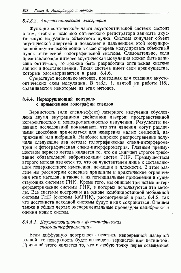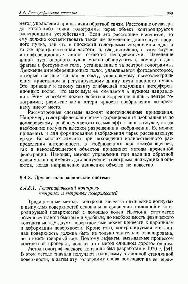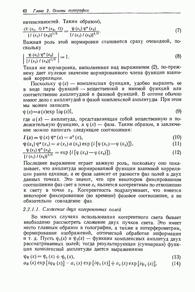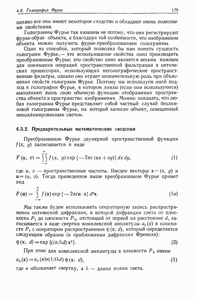 Предисловие редактора переводаВ последнее время голографические методы получения и анализа изображений находят все большее применение в различных областях науки и техники. Путь к использованию голографии отнюдь не был гладок. Хотя популярность она завоевала сразу же после появления лазерных голограмм в начале 60-х годов, прошло немало времени, прежде чем были преодолены многие технические трудности, разработаны и применены новые, основанные на принципах голографии, методы анализа и контроля явлений и объектов. Процесс расширения областей использования голографии продолжается и поныне. В научно-исследовательских институтах и научно-производственных объединениях возникло немало лабораторий, призванных распространять уже известные и разрабатывать новые голографические методы для различных областей науки и техники. Голография стала широко использоваться и как средство трехмерного отображения объектов. Возможности практического применения уже расширились настолько, что голография затронула и космические исследования, продемонстрировав целый ряд преимуществ голографических методов над традиционными. Интенсивное развитие голографии, расширение областей ее применения, постоянное увеличение числа специалистов, так или иначе связанных с голографией, — все это оказало влияние на рост интереса к литературе, рассматривающей те или иные аспекты голографии. За последние годы появилось немало книг по голографии. Одни из них (см. список литературы) посвящены проблеме в целом, другие — отдельным разделам голографии и конкретным областям ее приложения. Тем не менее вне поля зрения специальной голографической литературы осталось немало неосвещенных вопросов. Кроме того, назрела необходимость в подробном справочнике по голографии, в котором с достаточной полнотой были бы рассмотрены все главные разделы голографии. Наиболее близко удовлетворяла этим требованиям изданная в 1970 г. в русском переводе книга Р. Кольера, К Беркхарта и Л. Лина «Оптическая голография» [5]. Однако материал ее частично устарел, он уже не является достаточно полным и не отражает современного уровня развития голографии. Предлагаемая читателю книга представляет собой своего рода энциклопедический справочник, охватывающий как оптическую голографию в целом, так и формирование изображений и оптическую обработку информации. Для написания этой книги привлечен авторский коллектив в составе 31 специалиста из различных научных учреждений США и Канады. В авторский коллектив входит большинство ученых США, наиболее активно работающих в области голографии, оптической обработки информации и их применений. Введение к книге написал Э. Лейт — один из основоположников лазерной голографии, внесший большой вклад в дело ее практического использования в разных областях науки и техники. В переводном издании в книгу внесены некоторые изменения. Во-первых, она разбита на два тома и, во-вторых, с любезного разрешения редактора американского издания проф. Г. Колфилда, в т. 2 помещено «Дополнение», написанное крупнейшим советским специалистом в области голографии и оптики чл.-кор. АН СССР Ю. Н. Денисюком. Необходимость введения «Дополнения» обусловлена тем, что в американском издании весьма слабо отражены работы советских авторов и недостаточно освещен важный разде