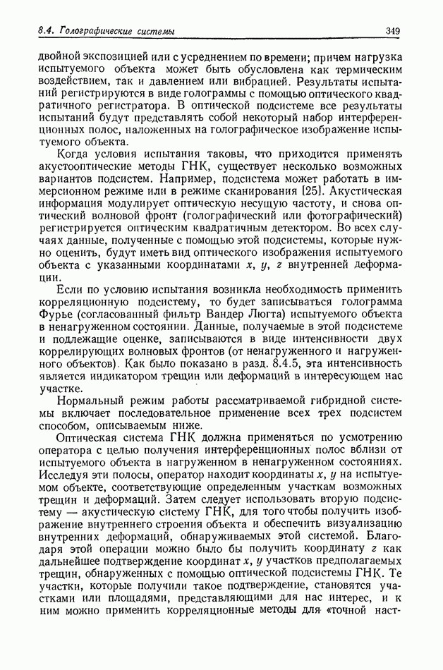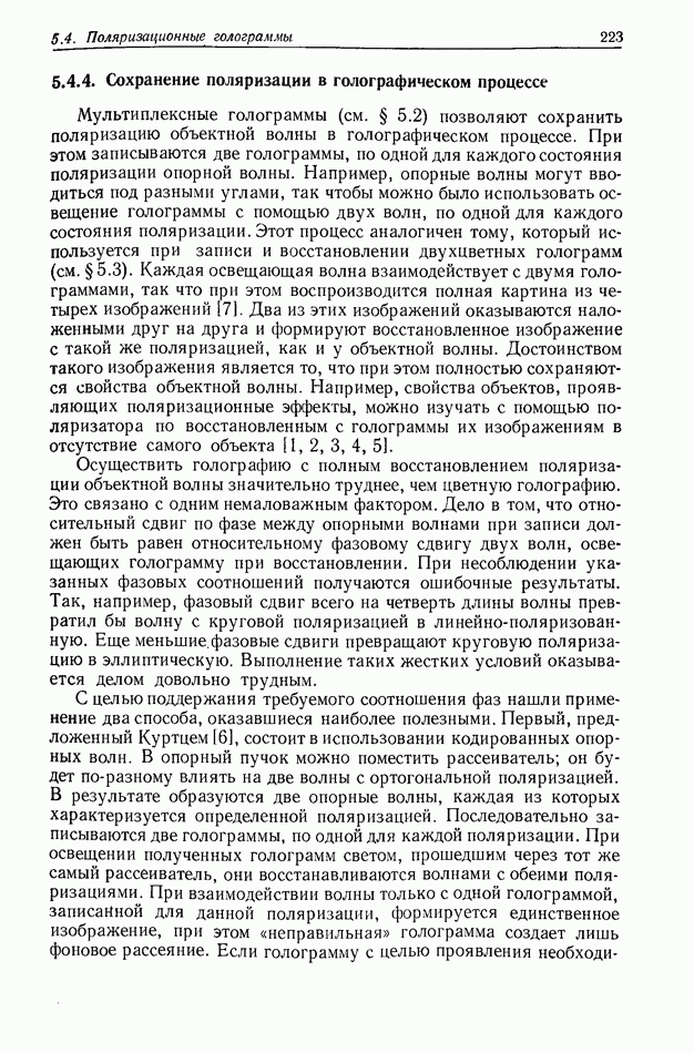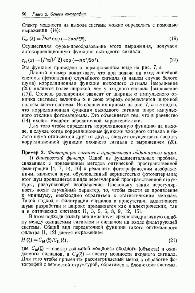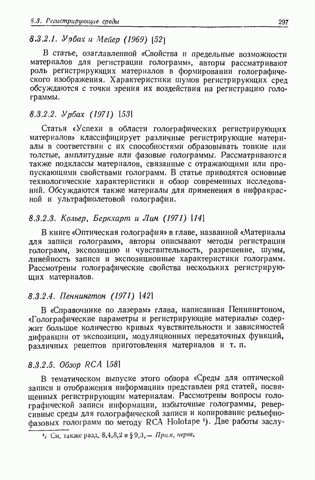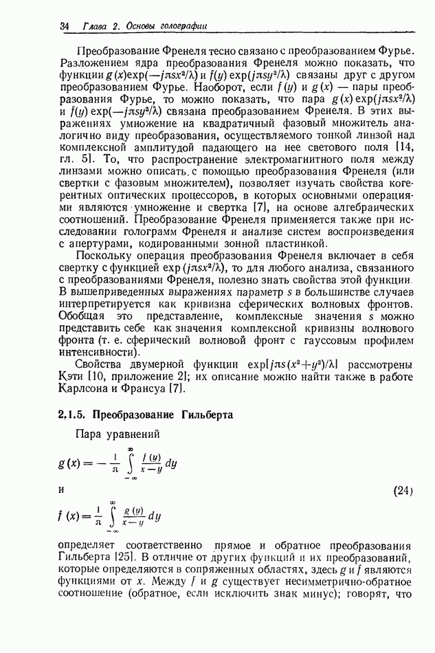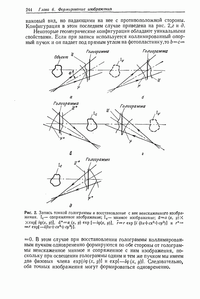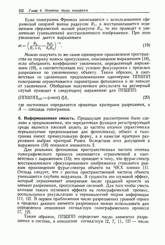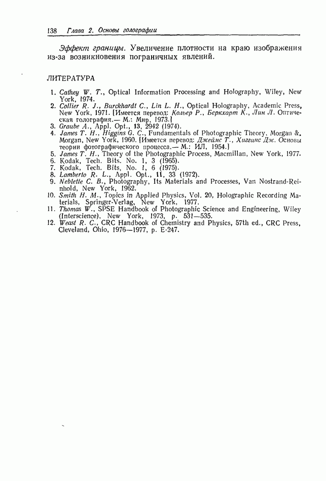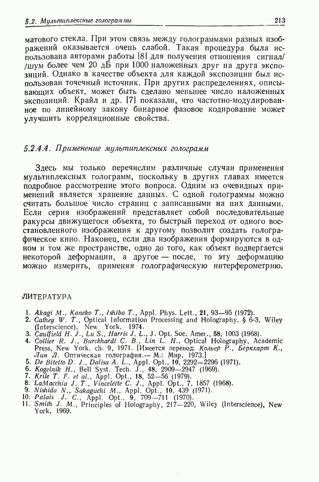Предисловие редактора переводаВ последнее время голографические методы получения и анализа изображений находят все большее применение в различных областях науки и техники. Путь к использованию голографии отнюдь не был гладок. Хотя популярность она завоевала сразу же после появления лазерных голограмм в начале 60-х годов, прошло немало времени, прежде чем были преодолены многие технические трудности, разработаны и применены новые, основанные на принципах голографии, методы анализа и контроля явлений и объектов. Процесс расширения областей использования голографии продолжается и поныне. В научно-исследовательских институтах и научно-производственных объединениях возникло немало лабораторий, призванных распространять уже известные и разрабатывать новые голографические методы для различных областей науки и техники. Голография стала широко использоваться и как средство трехмерного отображения объектов. Возможности практического применения уже расширились настолько, что голография затронула и космические исследования, продемонстрировав целый ряд преимуществ голографических методов над традиционными. Интенсивное развитие голографии, расширение областей ее применения, постоянное увеличение числа специалистов, так или иначе связанных с голографией, — все это оказало влияние на рост интереса к литературе, рассматривающей те или иные аспекты голографии. За последние годы появилось немало книг по голографии. Одни из них (см. список литературы) посвящены проблеме в целом, другие — отдельным разделам голографии и конкретным областям ее приложения. Тем не менее вне поля зрения специальной голографической литературы осталось немало неосвещенных вопросов. Кроме того, назрела необходимость в подробном справочнике по голографии, в котором с достаточной полнотой были бы рассмотрены все главные разделы голографии. Наиболее близко удовлетворяла этим требованиям изданная в 1970 г. в русском переводе книга Р. Кольера, К Беркхарта и Л. Лина «Оптическая голография» [5]. Однако материал ее частично устарел, он уже не является достаточно полным и не отражает современного уровня развития голографии. Предлагаемая читателю книга представляет собой своего рода энциклопедический справочник, охватывающий как оптическую голографию в целом, так и формирование изображений и оптическую обработку информации. Для написания этой книги привлечен авторский коллектив в составе 31 специалиста из различных научных учреждений США и Канады. В авторский коллектив входит большинство ученых США, наиболее активно работающих в области голографии, оптической обработки информации и их применений. Введение к книге написал Э. Лейт — один из основоположников лазерной голографии, внесший большой вклад в дело ее практического использования в разных областях науки и техники. В переводном издании в книгу внесены некоторые изменения. Во-первых, она разбита на два тома и, во-вторых, с любезного разрешения редактора американского издания проф. Г. Колфилда, в т. 2 помещено «Дополнение», написанное крупнейшим советским специалистом в области голографии и оптики чл.-кор. АН СССР Ю. Н. Денисюком. Необходимость введения «Дополнения» обусловлена тем, что в американском издании весьма слабо отражены работы советских авторов и недостаточно освещен важный разде