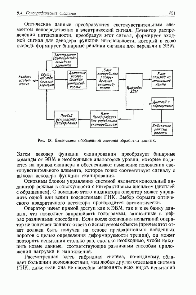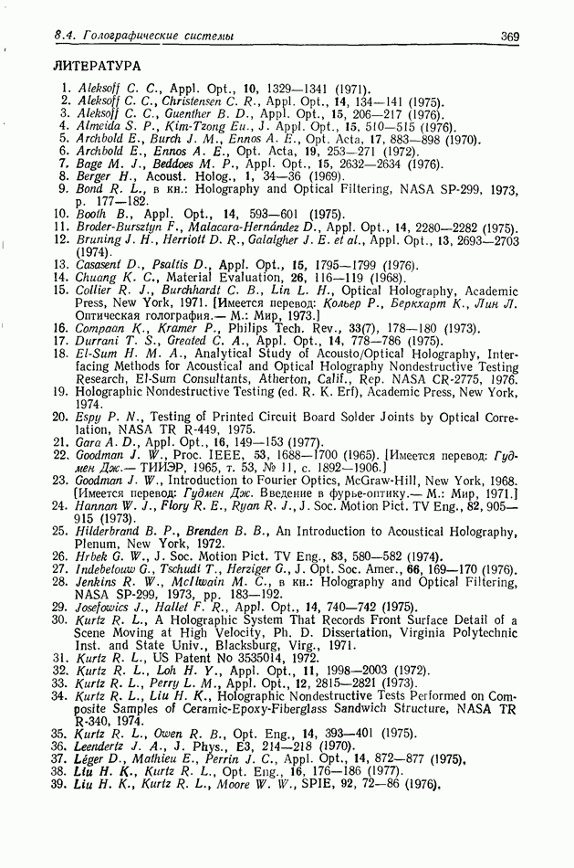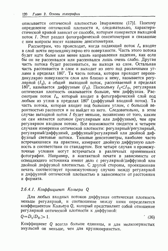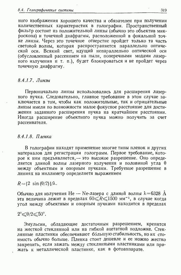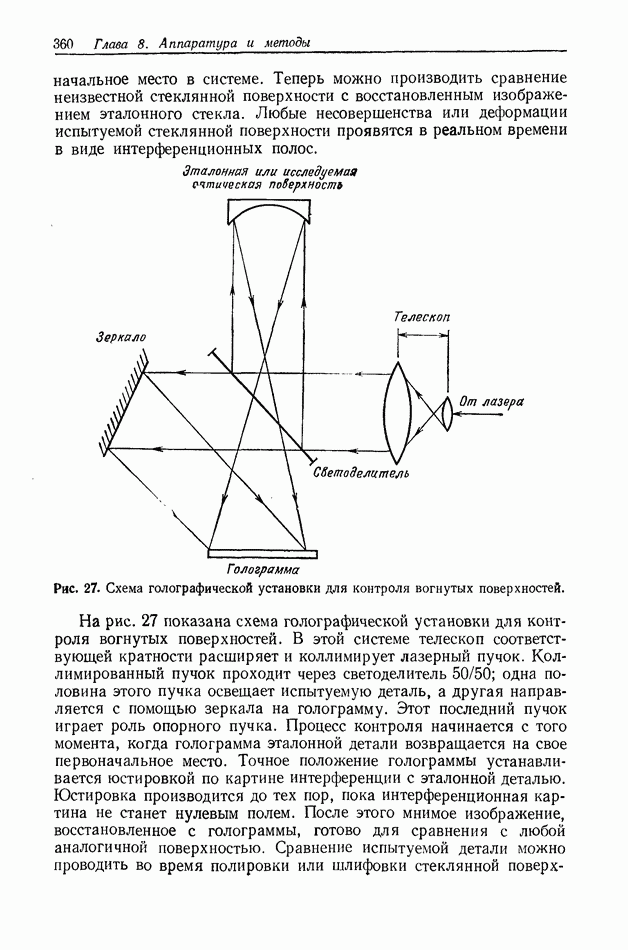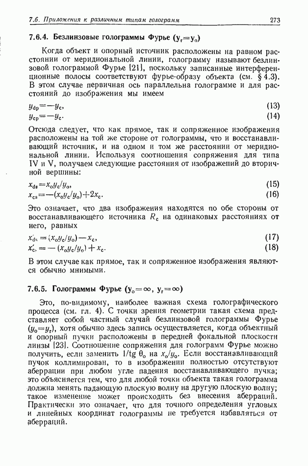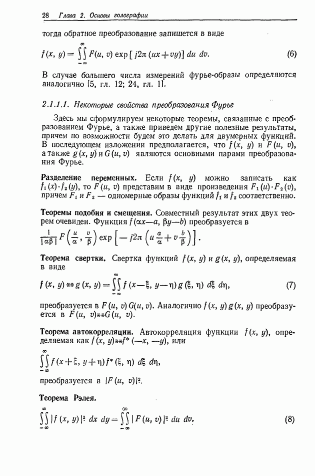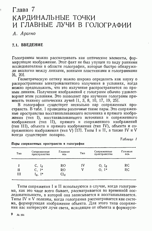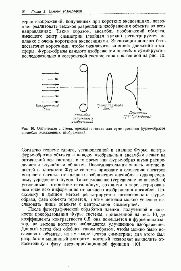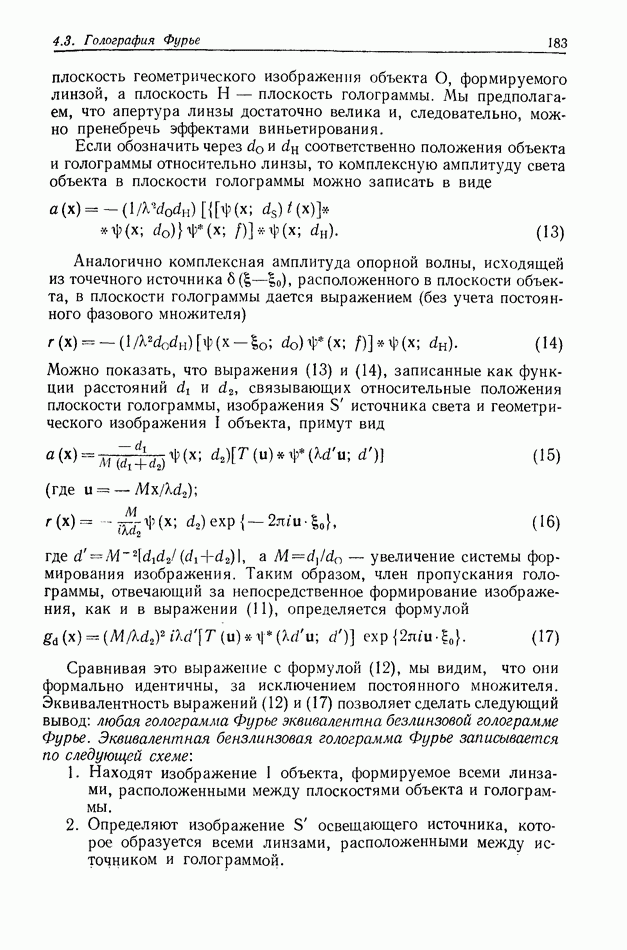 Предисловие редактора переводаВ последнее время голографические методы получения и анализа изображений находят все большее применение в различных областях науки и техники. Путь к использованию голографии отнюдь не был гладок. Хотя популярность она завоевала сразу же после появления лазерных голограмм в начале 60-х годов, прошло немало времени, прежде чем были преодолены многие технические трудности, разработаны и применены новые, основанные на принципах голографии, методы анализа и контроля явлений и объектов. Процесс расширения областей использования голографии продолжается и поныне. В научно-исследовательских институтах и научно-производственных объединениях возникло немало лабораторий, призванных распространять уже известные и разрабатывать новые голографические методы для различных областей науки и техники. Голография стала широко использоваться и как средство трехмерного отображения объектов. Возможности практического применения уже расширились настолько, что голография затронула и космические исследования, продемонстрировав целый ряд преимуществ голографических методов над традиционными. Интенсивное развитие голографии, расширение областей ее применения, постоянное увеличение числа специалистов, так или иначе связанных с голографией, — все это оказало влияние на рост интереса к литературе, рассматривающей те или иные аспекты голографии. За последние годы появилось немало книг по голографии. Одни из них (см. список литературы) посвящены проблеме в целом, другие — отдельным разделам голографии и конкретным областям ее приложения. Тем не менее вне поля зрения специальной голографической литературы осталось немало неосвещенных вопросов. Кроме того, назрела необходимость в подробном справочнике по голографии, в котором с достаточной полнотой были бы рассмотрены все главные разделы голографии. Наиболее близко удовлетворяла этим требованиям изданная в 1970 г. в русском переводе книга Р. Кольера, К Беркхарта и Л. Лина «Оптическая голография» [5]. Однако материал ее частично устарел, он уже не является достаточно полным и не отражает современного уровня развития голографии. Предлагаемая читателю книга представляет собой своего рода энциклопедический справочник, охватывающий как оптическую голографию в целом, так и формирование изображений и оптическую обработку информации. Для написания этой книги привлечен авторский коллектив в составе 31 специалиста из различных научных учреждений США и Канады. В авторский коллектив входит большинство ученых США, наиболее активно работающих в области голографии, оптической обработки информации и их применений. Введение к книге написал Э. Лейт — один из основоположников лазерной голографии, внесший большой вклад в дело ее практического использования в разных областях науки и техники. В переводном издании в книгу внесены некоторые изменения. Во-первых, она разбита на два тома и, во-вторых, с любезного разрешения редактора американского издания проф. Г. Колфилда, в т. 2 помещено «Дополнение», написанное крупнейшим советским специалистом в области голографии и оптики чл.-кор. АН СССР Ю. Н. Денисюком. Необходимость введения «Дополнения» обусловлена тем, что в американском издании весьма слабо отражены работы советских авторов и недостаточно освещен важный разде