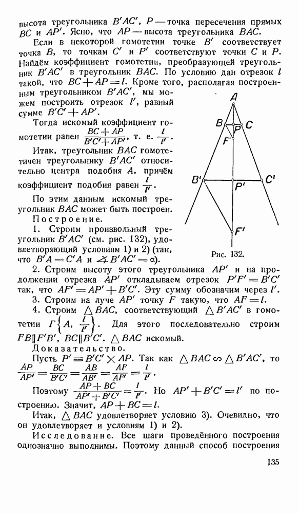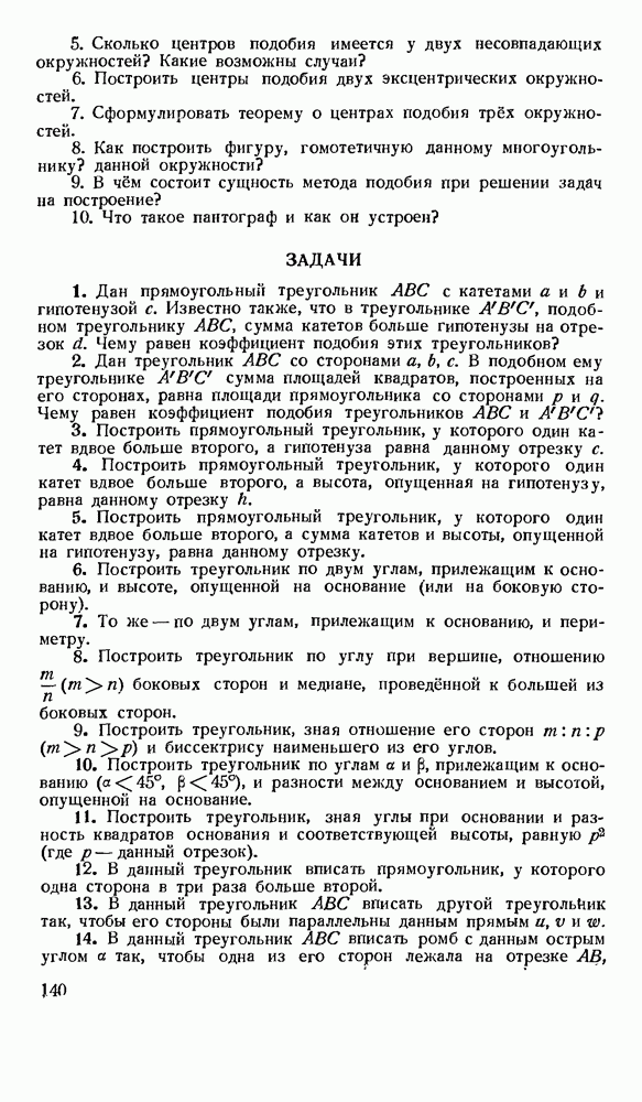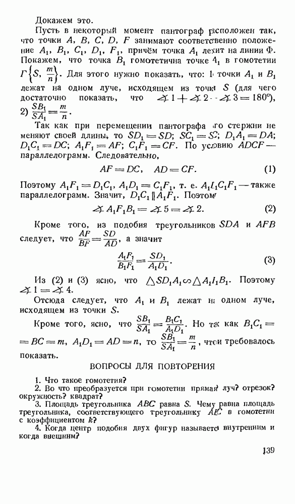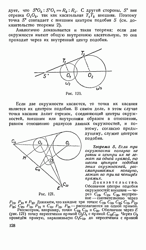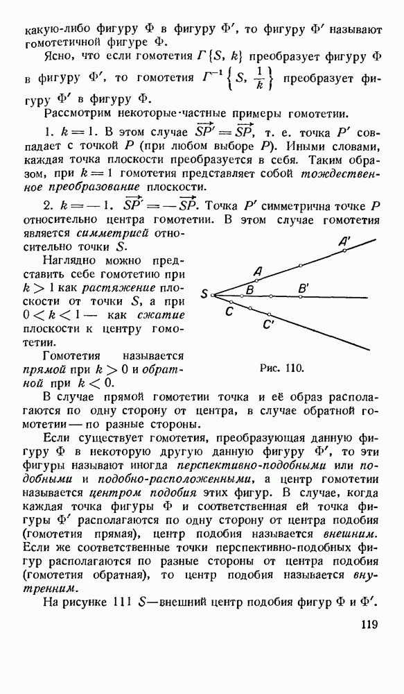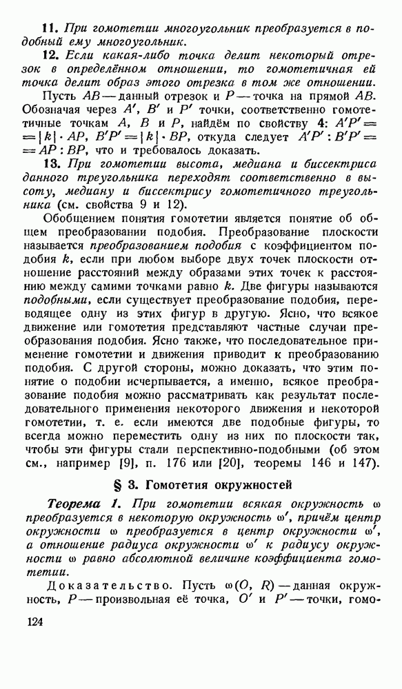 Две фигуры называются подобными, если существует преобразование подобия, переводящее одну из этих фигур в другую. Ясно, что всякое движение или гомотетия представляют частные случаи преобразования подобия. Ясно также, что последовательное применение гомотетии и движения приводит к преобразованию подобия. С другой стороны, можно доказать, что этим понятие о подобии исчерпывается, а именно, всякое преобразование подобия можно рассматривать как результат последовательного применения некоторого движения и некоторой гомотетии, т. е. если имеются две подобные фигуры, то всегда можно переместить одну из них по плоскости так, чтобы эти фигуры стали перспективно-подобными (об этом см., например [9], п. 176 или [20], теоремы 146 и 147).