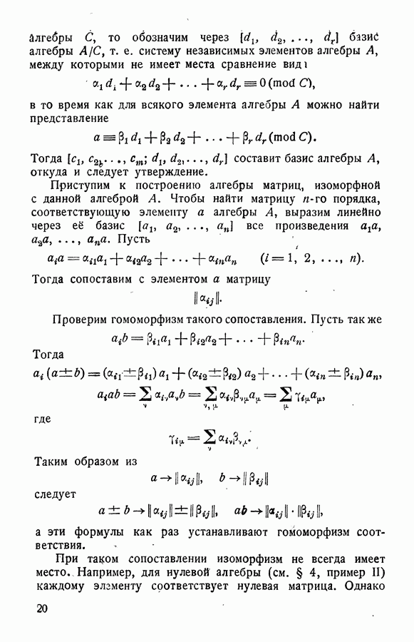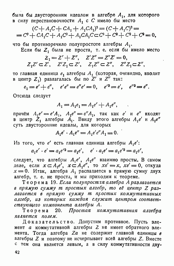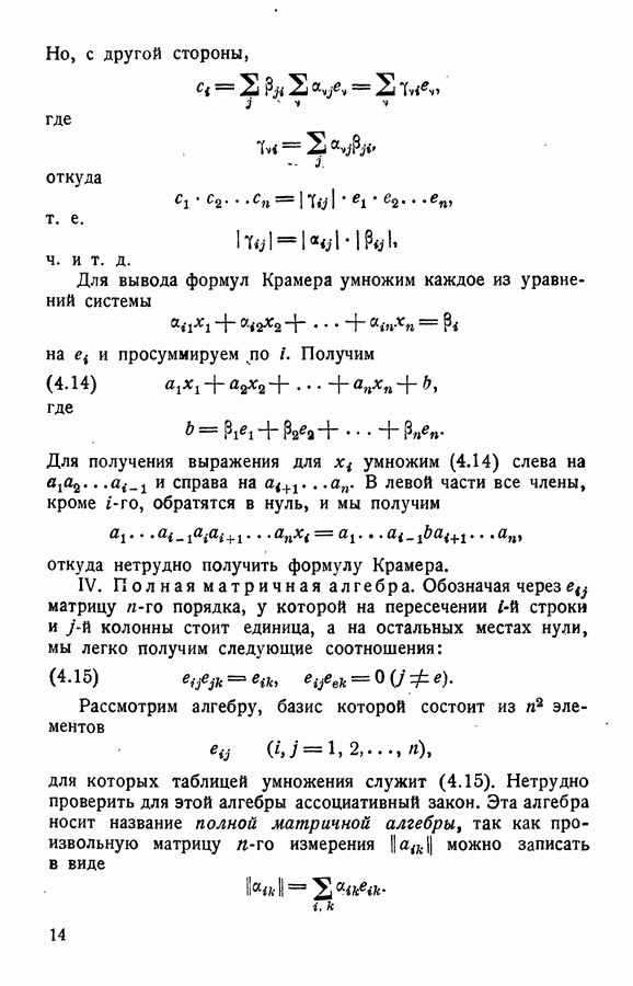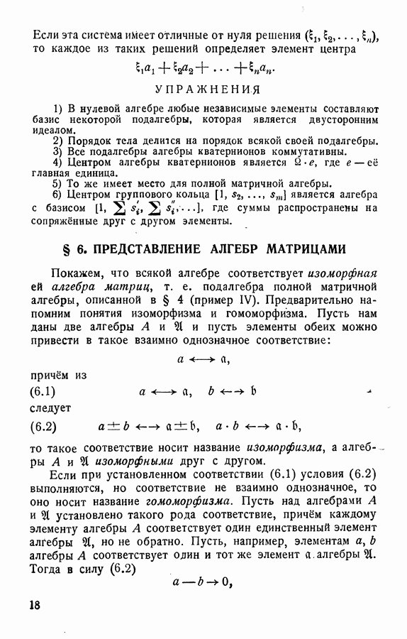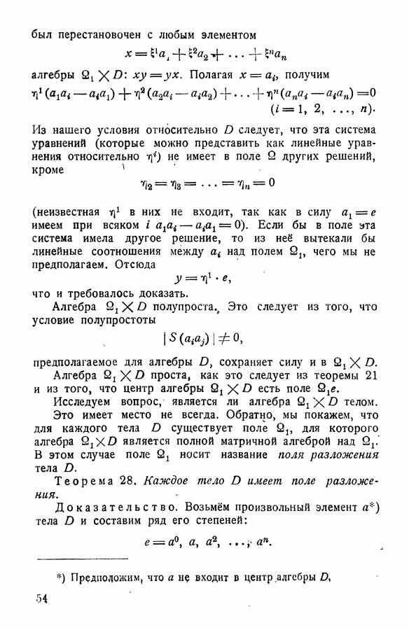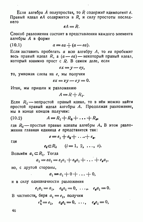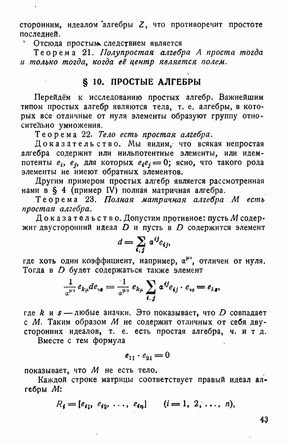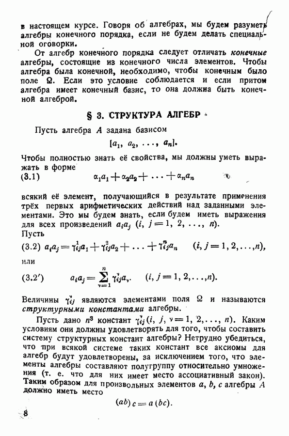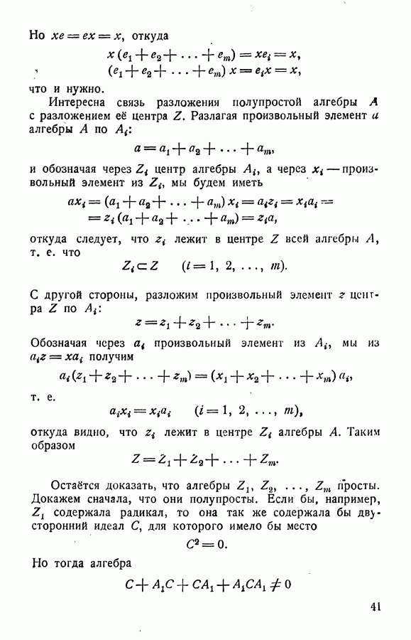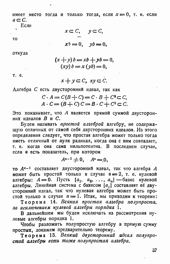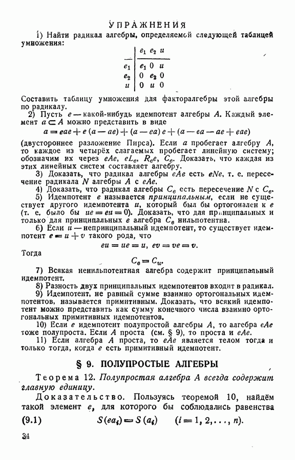 Таким образом Если алгебра не содержит отличного от нуля радикала, то она называется полупростой алгеброй. Приведённые рассзждения позволяют сформулировать следующую теорему: Теорема 9. Чтобы алгебра была полупростой, необходимо и достаточно, чтобы её дискриминант был отличен от нуля. Форма уравнений (8.3) показывает справедливость следующей теоремы: Теорема 10. В полупростой алгебре можно всегда найти элемент а, для которого величины