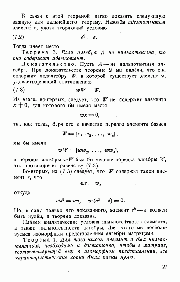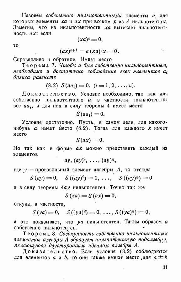 а это показывает, что Теорема 8. Совокупность собственно нильпотентных элементов алгебры А образует нильпотентную подалгебру, являющуюся двусторонним идеалом алгебры А, Доказательство. Если условия (8.2) соблюдаются для элементов а и то они также имеют место для