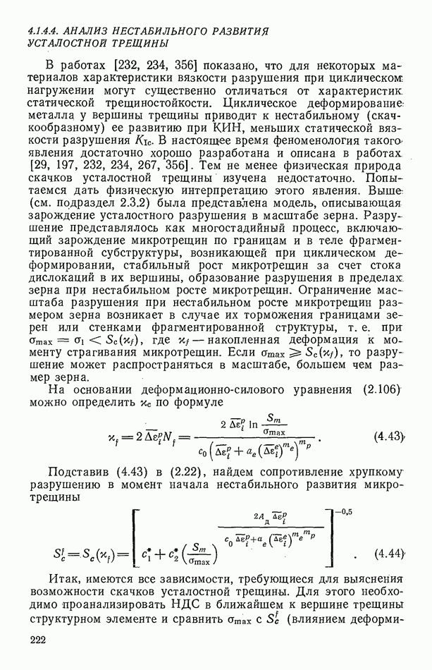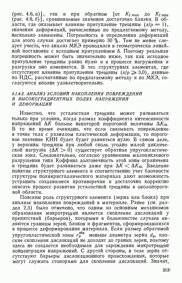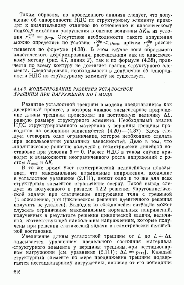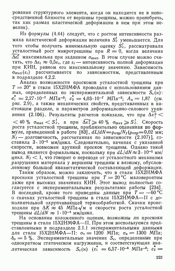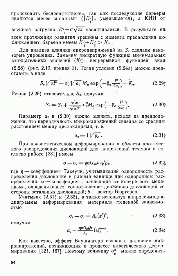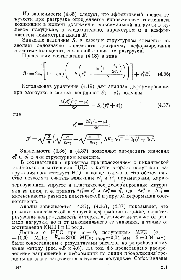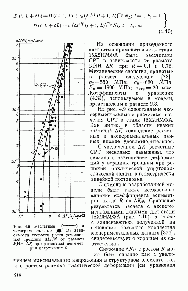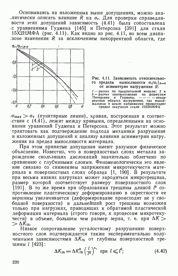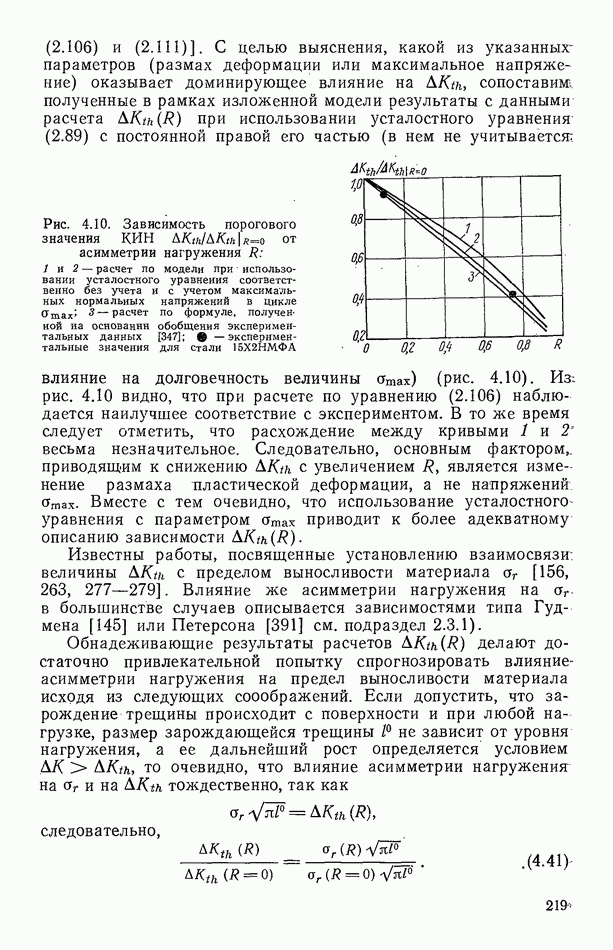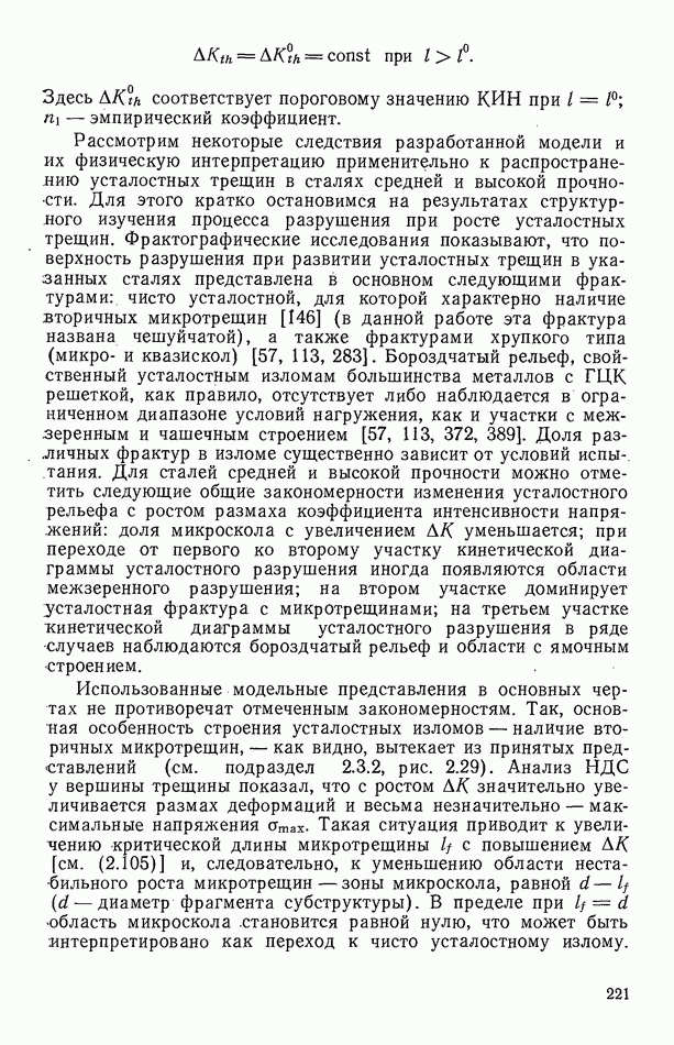 На основании полученного деформационно-силового уравнения усталостного разрушения (2.111) в гл. 4 выполнено моделирование кинетики - усталостных макротрещин в перлитных сталях, в частности, рассмотрено влияние асимметрии нагружения на пороговое значение коэффициента интенсивности, напряжений