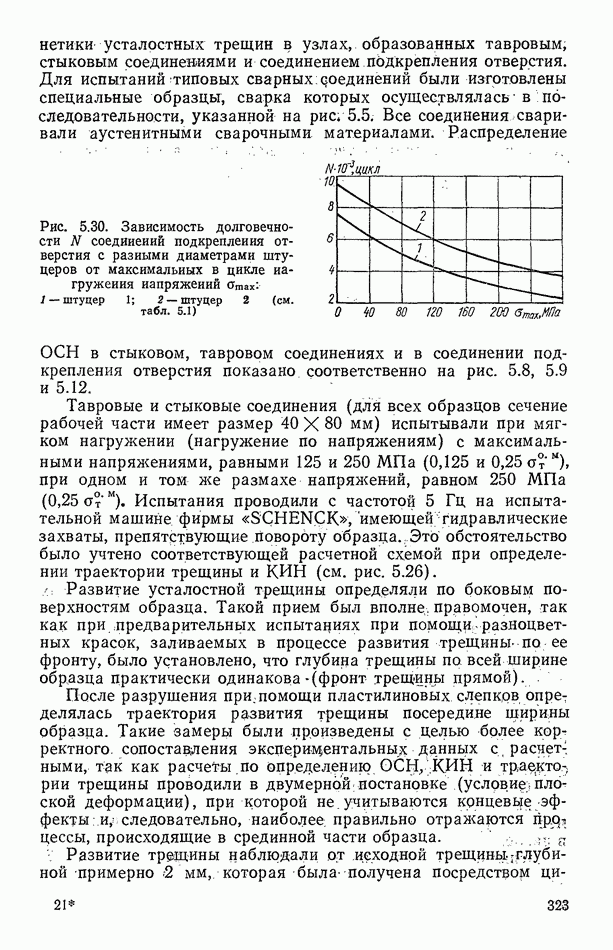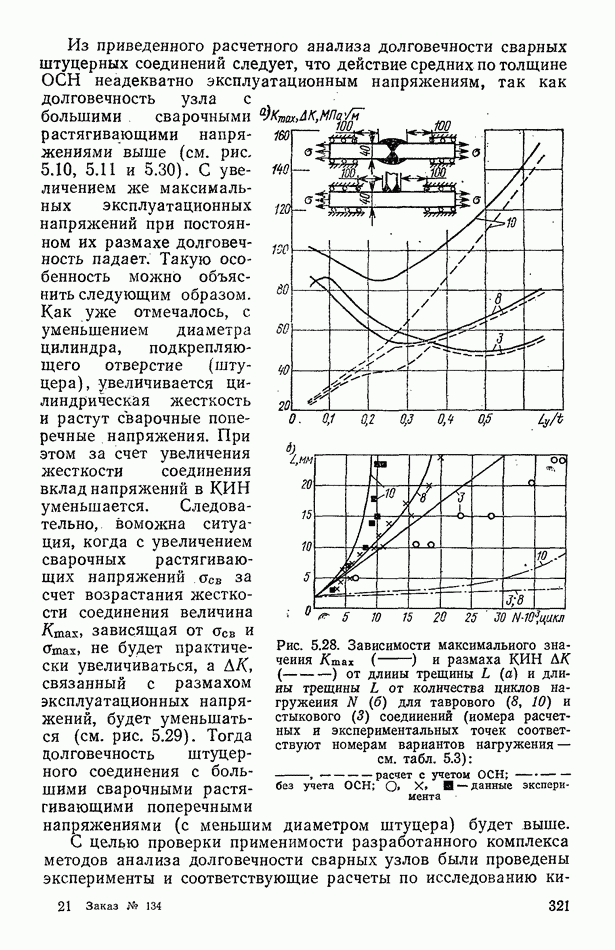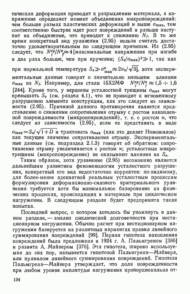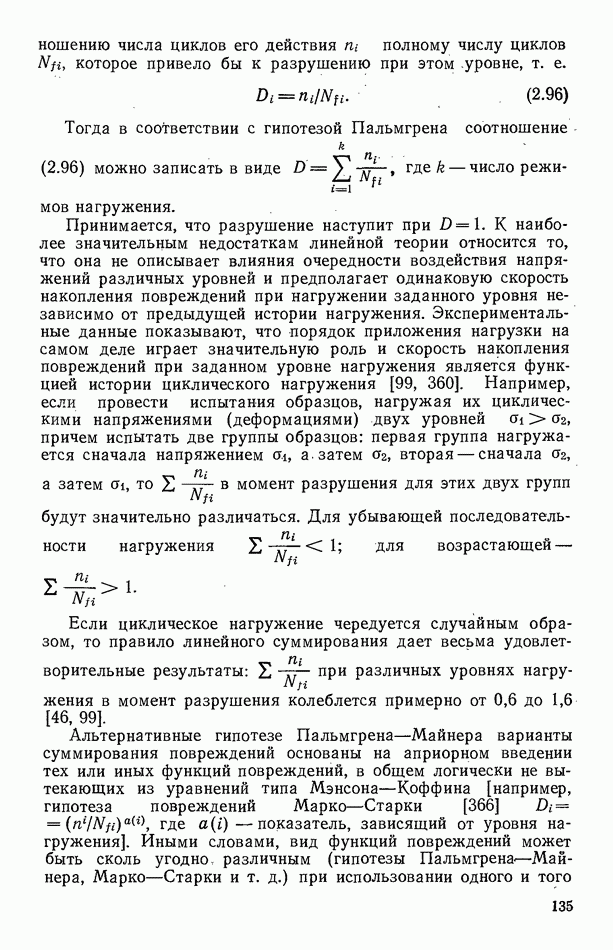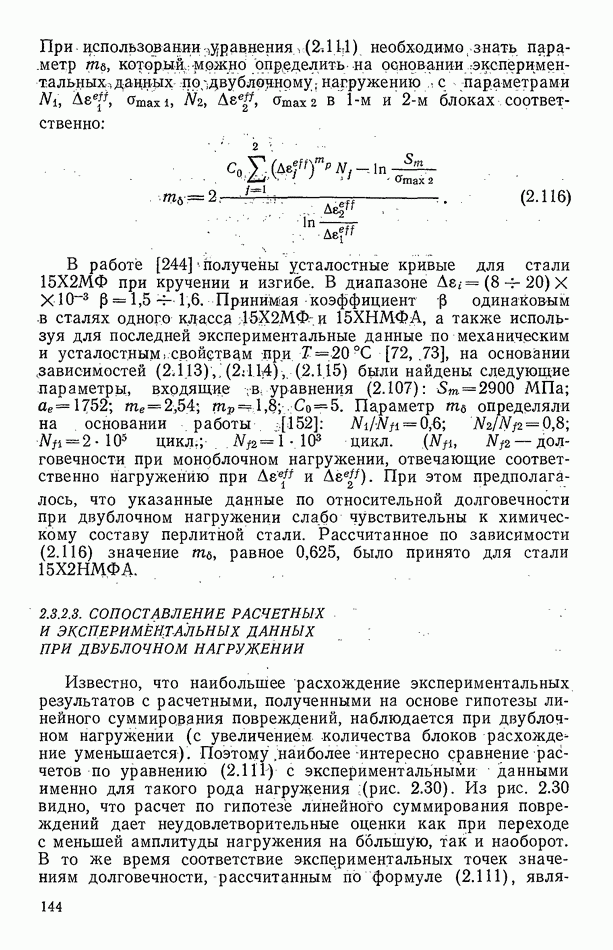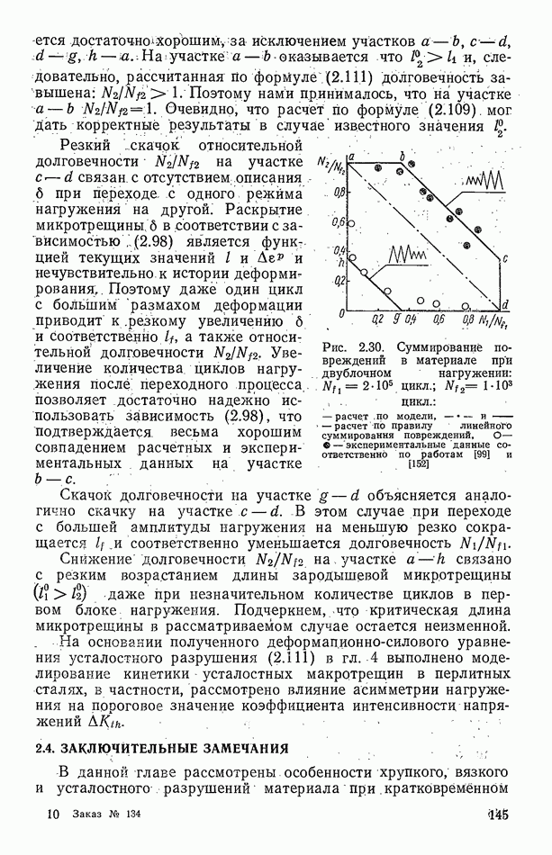Известно, что наибольшее расхождение экспериментальных результатов с расчетными, полученными на основе гипотезы линейного суммирования повреждений, наблюдается при двублочном нагружении (с увеличением количества блоков расхождение уменьшается). Поэтому наиболее интересно сравнение расчетов по уравнению (2.111) с экспериментальными данными именно для такого рода нагружения (рис. 2.30). Из рис. 2.30 видно, что расчет по гипотезе линейного суммирования повреждений дает неудовлетворительные оценки как при переходе с меньшей амплитуды нагружения на большую, так и наоборот. В то же время соответствие экспериментальных точек значениям долговечности, рассчитанным по формуле (2.111),