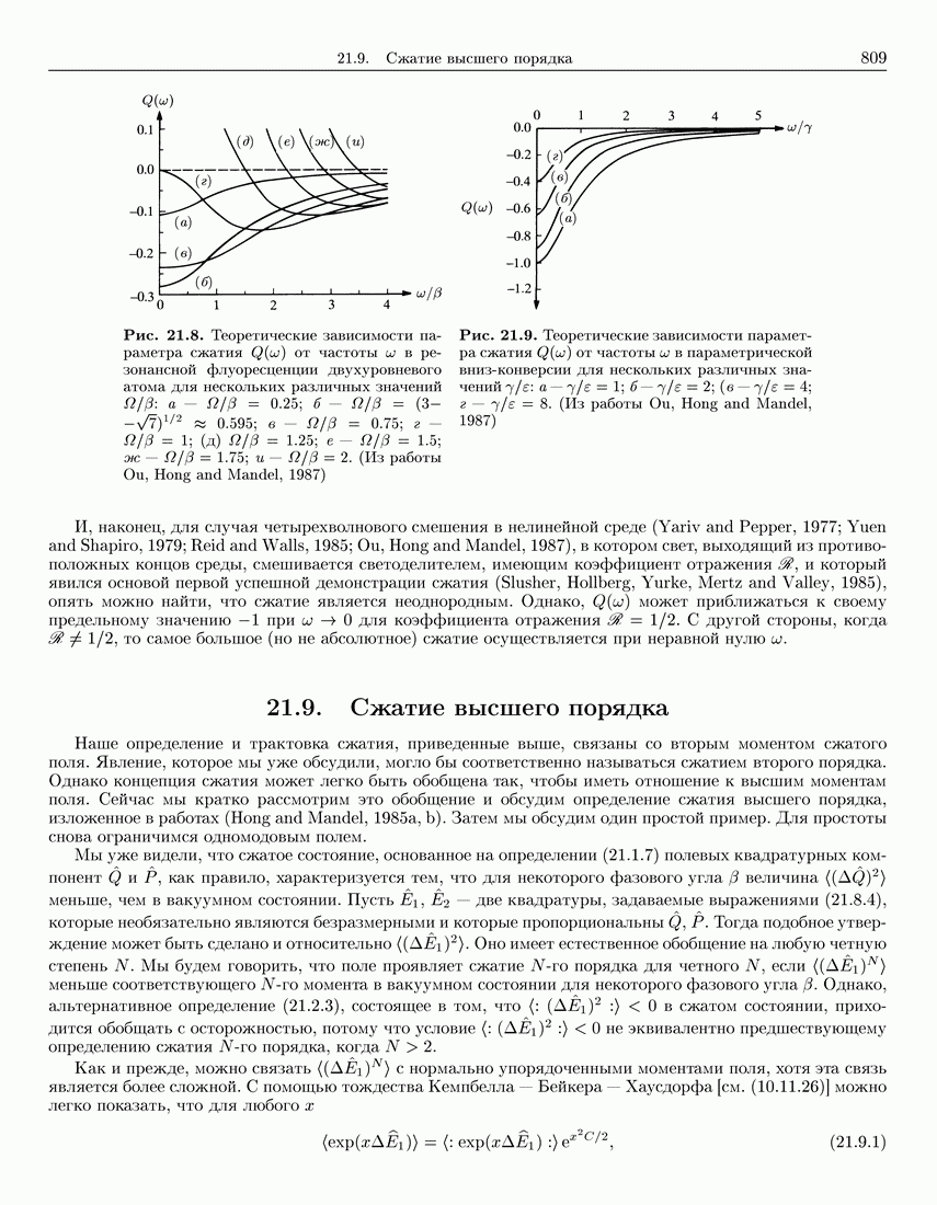 Наше определение и трактовка сжатия, приведенные выше, связаны со вторым моментом сжатого поля. Явление, которое мы уже обсудили, могло бы соответственно называться сжатием второго порядка. Однако концепция сжатия может легко быть обобщена так, чтобы иметь отношение к высшим моментам поля. Сейчас мы кратко рассмотрим это обобщение и обсудим определение сжатия высшего порядка, изложенное в работах (Hong and Mandel, 1985а, b). Затем мы обсудим один простой пример. Для простоты снова ограничимся одномодовым полем.
