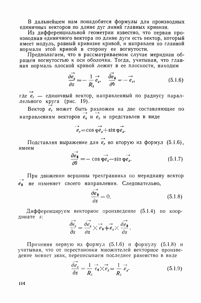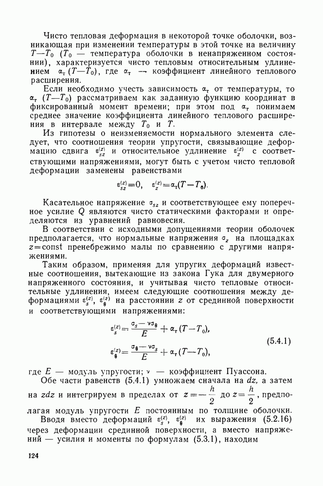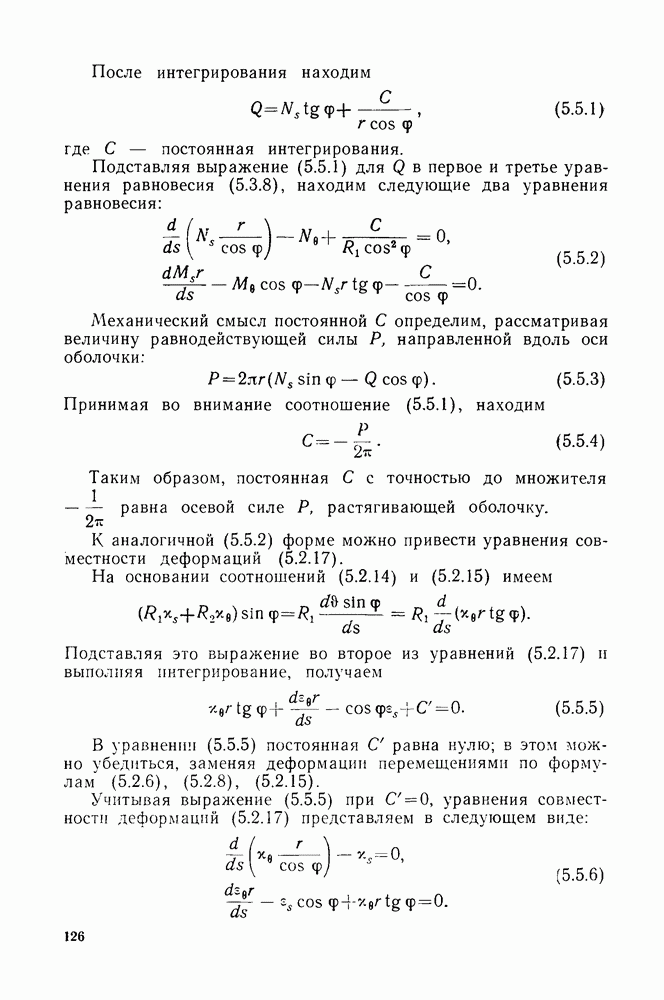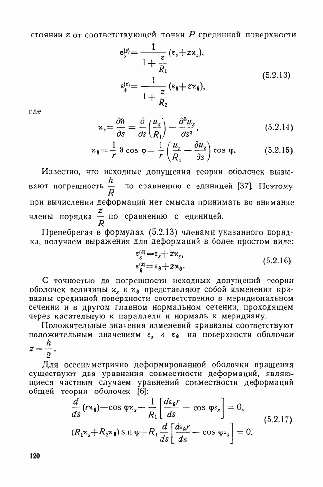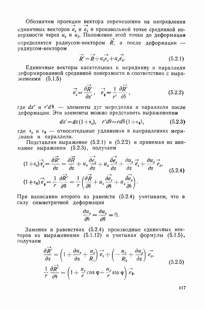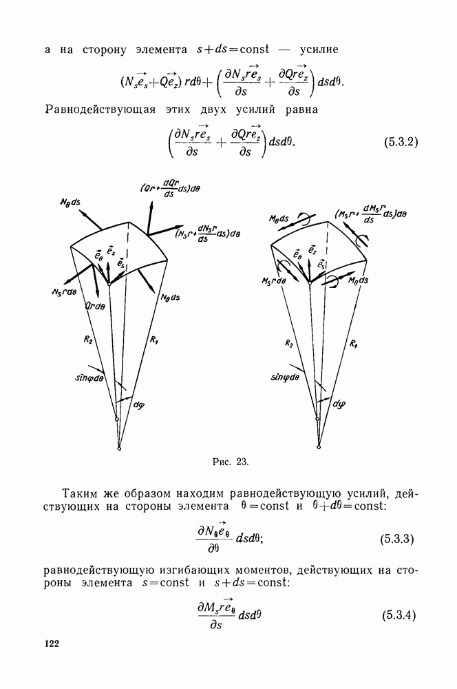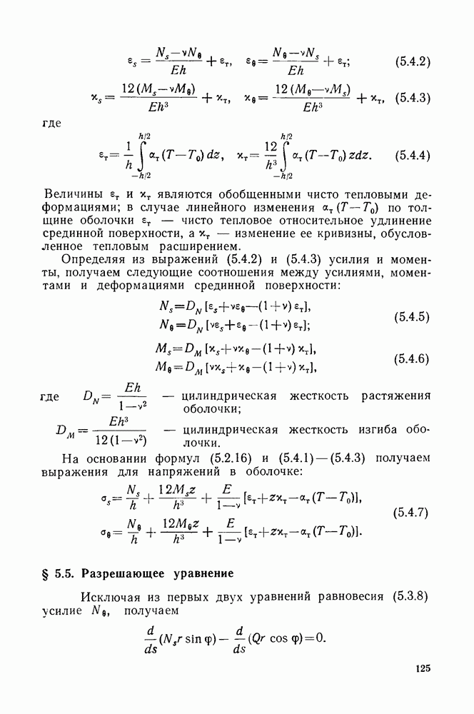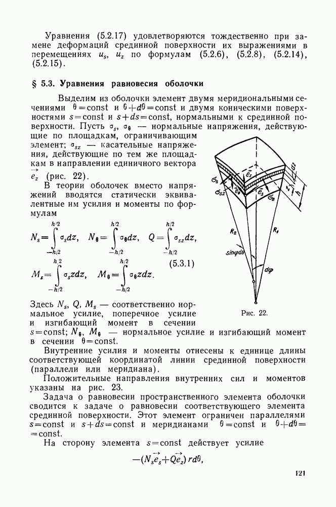 приравнивая затем нулю коэффициенты при  находим из двух векторных уравнений (5.3.7) три скалярных уравнения равновесия элемента оболочки: