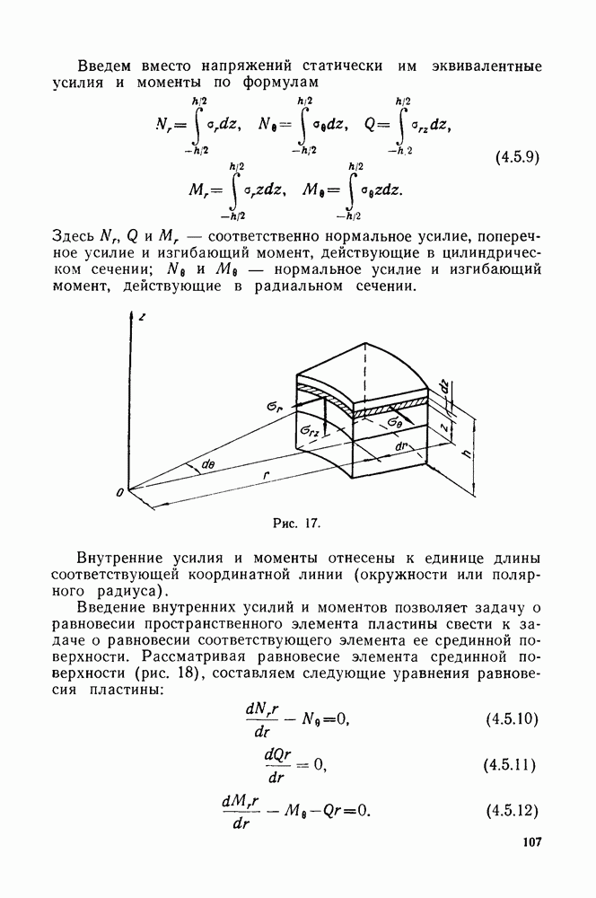 В теории оболочек вместо напряжений вводятся статически эквивалентные им усилия и моменты по формулам