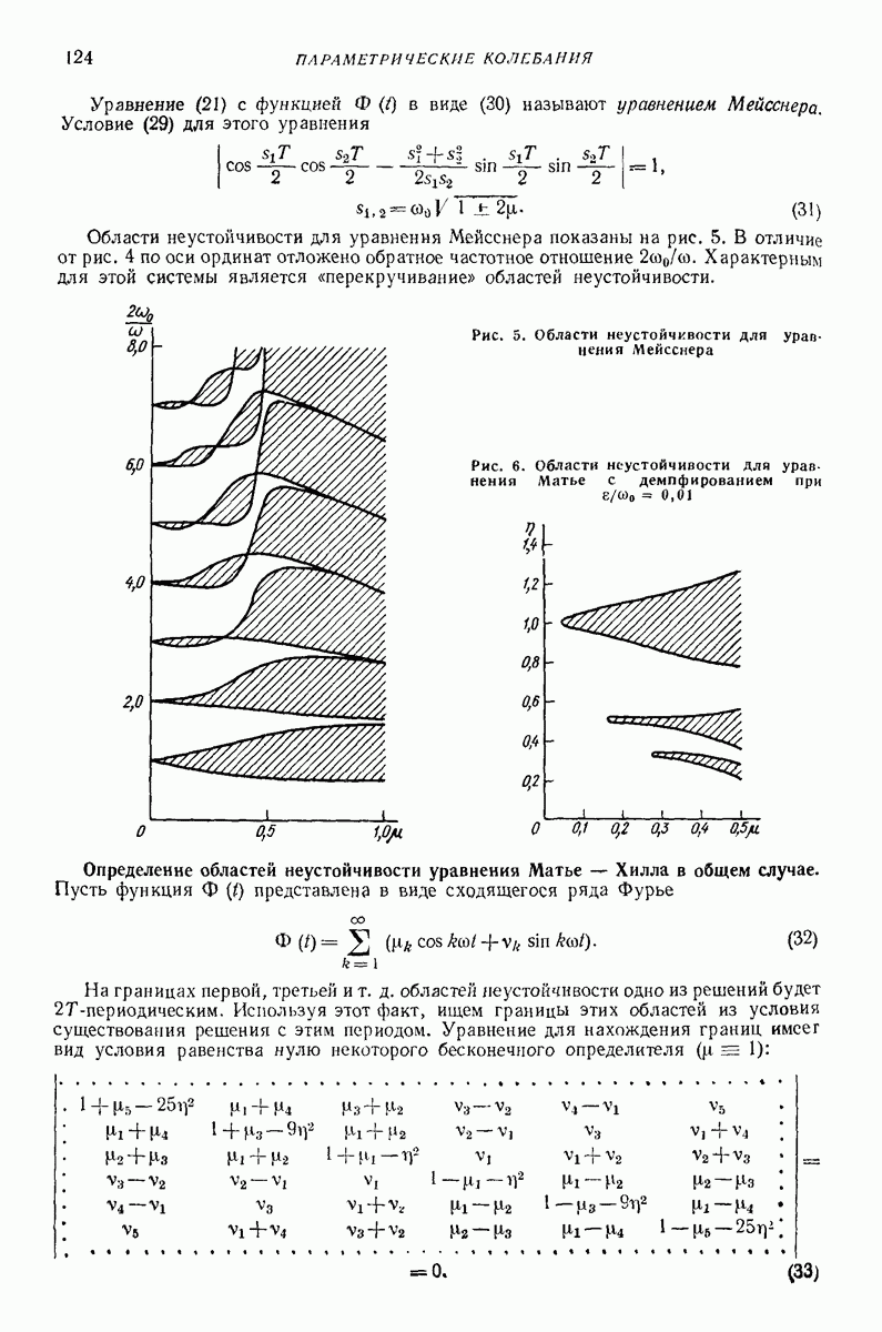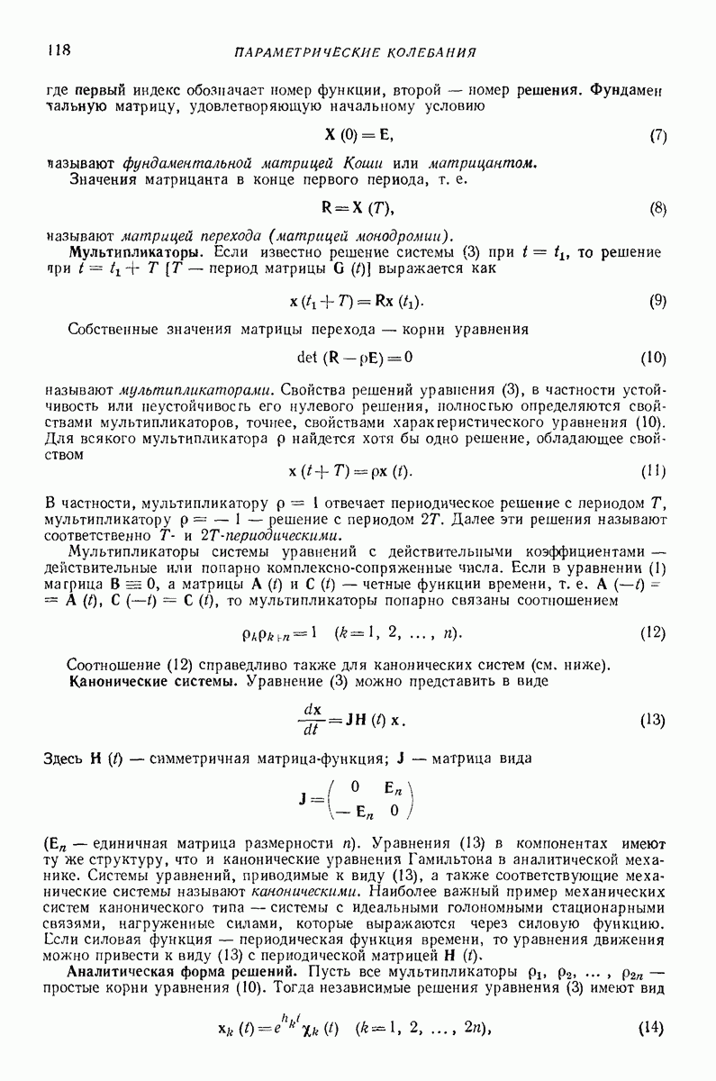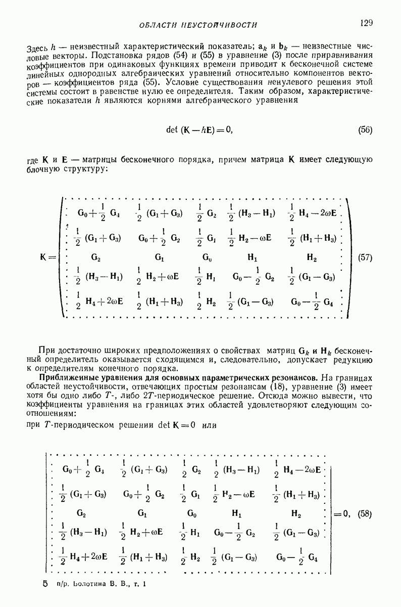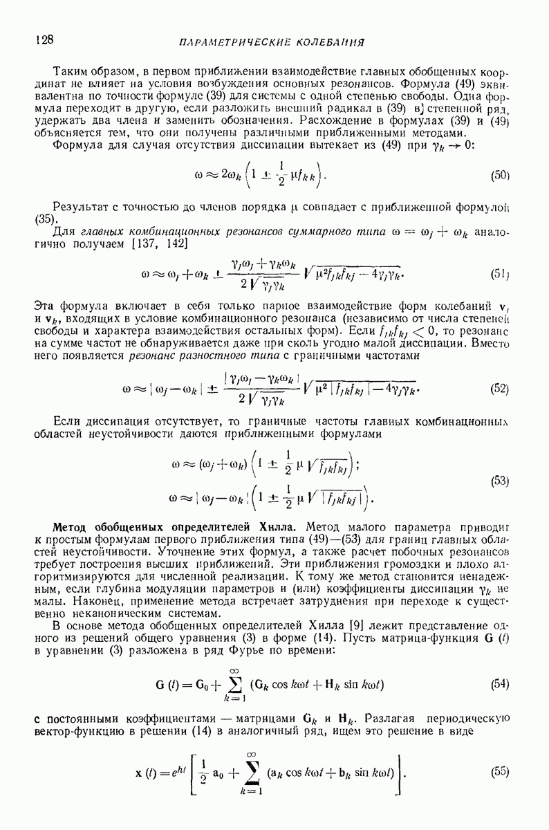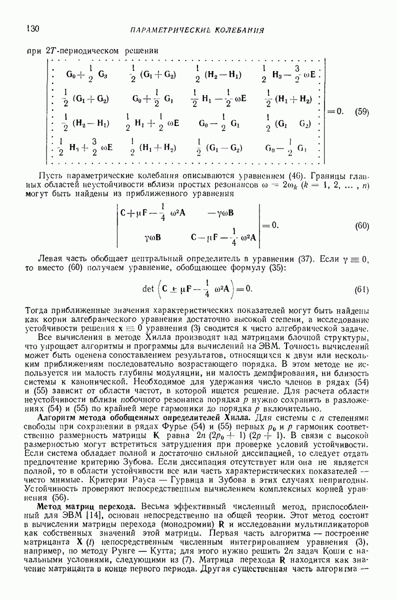 Метод обобщенных определителей Хилла. Метод малого параметра приводит к простым формулам первого приближения типа (49)-(53) для границ главных областей неустойчивости. Уточнение этих формул, а также расчет побочных резонансов требует построения высших приближений. Эти приближения громоздки и плохо алгоритмизируются для численной реализации. К тому же метод становится ненадежным, если глубина модуляции параметров и (или) коэффициенты диссипации В основе метода обобщенных определителей Хилла [9] лежит представление одного из решений общего уравнения (3) в форме (14). Пусть матрица-функция
