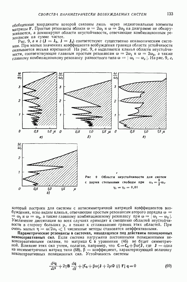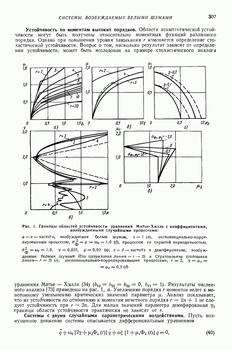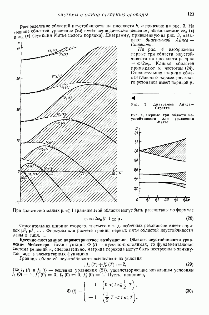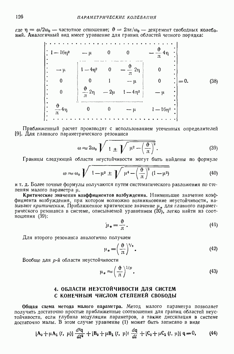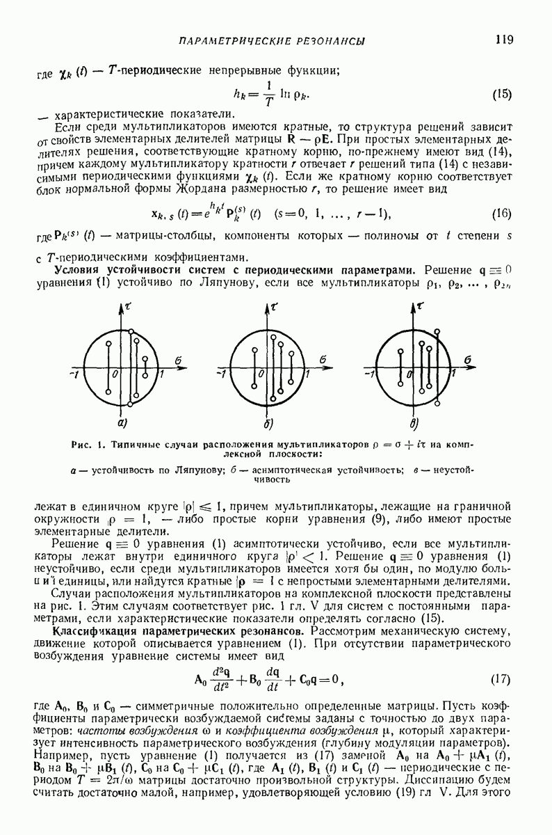 Тогда приближенные значения характеристических показателей могут быть найдены как корни алгебраического уравнения достаточно высокой степени, а исследование устойчивости решения Все вычисления в методе Хилла производят над матрицами блочной структуры, что упрощает алгоритмы и программы для вычислений на ЭВМ. Точность вычислений может быть оценена сопоставлением результатов, относящихся к двум или нескольким приближениям последовательно возрастающего порядка. В этом методе не используется ни малость глубины модуляции, ни малость демпфирования, ни близость системы к канонической. Необходимое для удержания число членов в рядах (54) и (55) зависит от области частот, в которой ищется решение. Для расчета области неустойчивости вблизи побочного резонанса порядка Алгоритм метода обобщенных определителей Хилла. Для системы с Метод матриц перехода. Весьма эффективный численный метод, приспособленный для ЭВМ [14], основан непосредственно на общей теории. Этот метод состоит в вычислении матрицы перехода (монодромии) проверка условий Этот метод входит как составная часть в критерий Зубова для систем с постоянными параметрами. Во втором случае приходится непосредственно вычислять корни уравнения Расчет на ЭВМ устойчивости систем с кусочно-постоянными коэффициентами. Эти системы рассматривают не только как самостоятельные модели, но и используют для аппроксимации весьма общего класса систем с кусочно-непрерывными коэффициентами. Матрица перехода выражается при этом через элементарные функции. Пусть в уравнении (3)