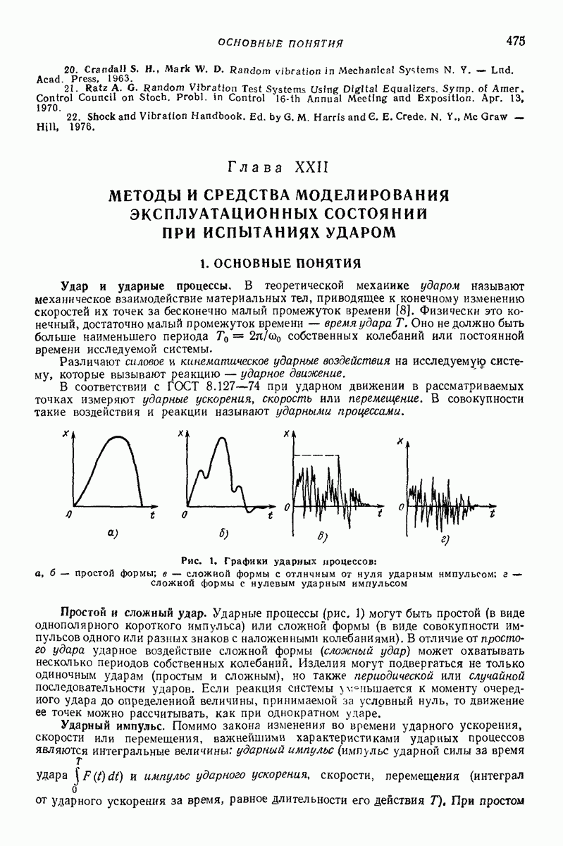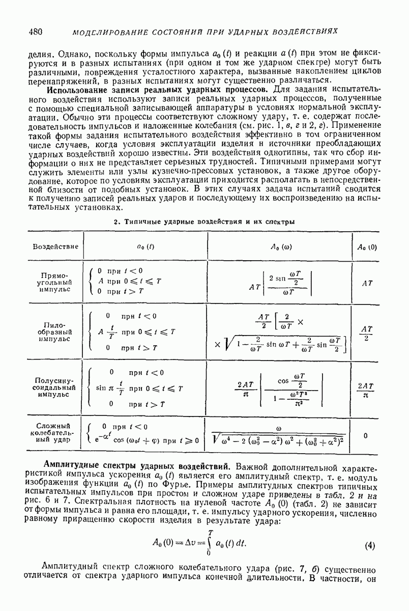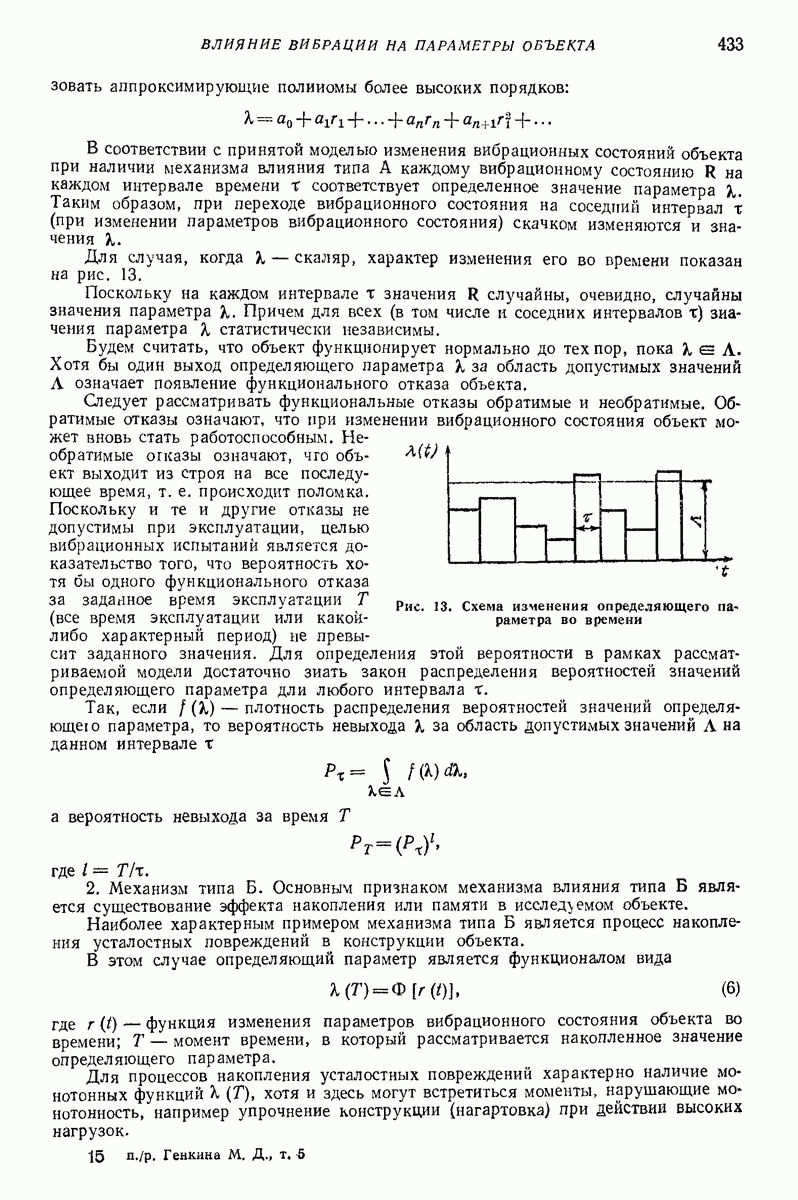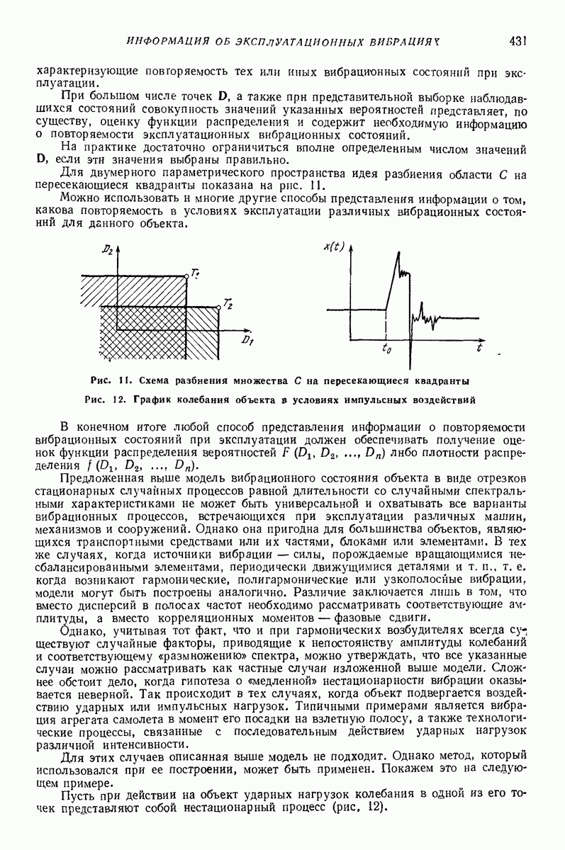 Рис. 12. График колебания объекта в условиях импульсных воздействий В конечном итоге любой способ представления информации о повторяемости вибрационных состояний при эксплуатации должен обеспечивать получение оценок функции распределения вероятностей Предложенная выше модель вибрационного состояния объекта в виде отрезков стационарных случайных процессов равной длительности со случайными спектральными характеристиками не может быть универсальной и охватывать все варианты вибрационных процессов, встречающихся при эксплуатации различных машин, механизмов и сооружений. Однако она пригодна для большинства объектов, являющихся транспортными средствами или их частями, блоками или элементами. В тех же случаях, когда источники вибрации — силы, порождаемые вращающимися несбалансированными элементами, периодически движущимися деталями и т. п., т. е. когда возникают гармонические, полигармонические или узкополосные вибрации, модели могут быть построены аналогично. Различие заключается лишь в том, что вместо дисперсий в полосах частот необходимо рассматривать соответствующие амплитуды, а вместо корреляционных моментов — фазовые сдвиги. Однако, учитывая тот факт, что и при гармонических возбудителях всегда существуют случайные факторы, приводящие к непостоянству амплитуды колебаний и соответствующему «размножению» спектра, можно утверждать, что все указанные случаи можно рассматривать как частные случаи изложенной выше модели. Сложнее обстоит дело, когда гипотеза о «медленной» нестационарности вибрации оказывается неверной. Так происходит в тех случаях, когда объект подвергается воздействию ударных или импульсных нагрузок. Типичными примерами является вибрация агрегата самолета в момент его посадки на взлетную полосу, а также технологические процессы, связанные с последовательным действием ударных нагрузок различной интенсивности. Для этих случаев описанная выше модель не подходит. Однако метод, который использовался при ее построении, может быть применен. Покажем это на следующем примере. Пусть при действии на объект ударных нагрузок колебания в одной из его точек представляют собой нестационарный процесс (рис, 12). Параметры конкретной реализации такого процесса