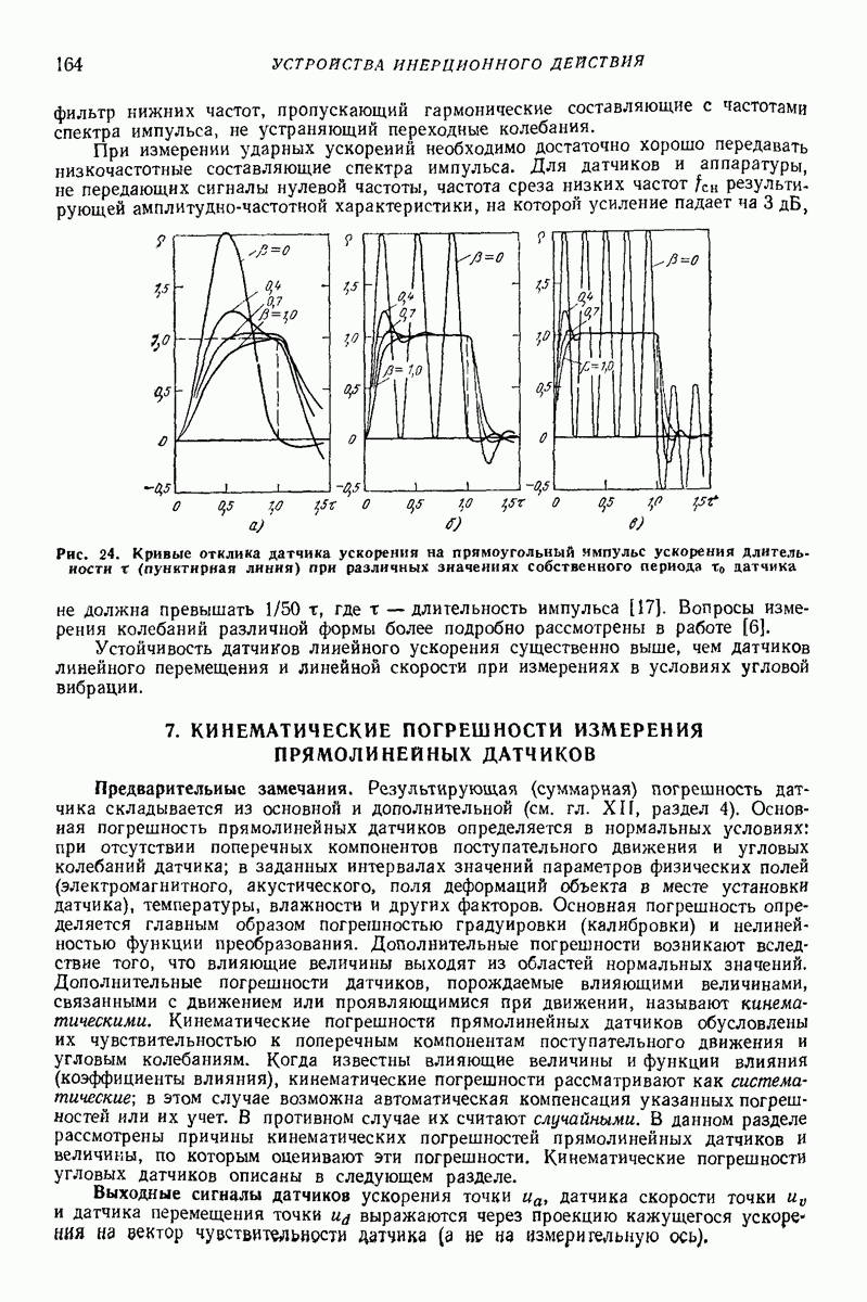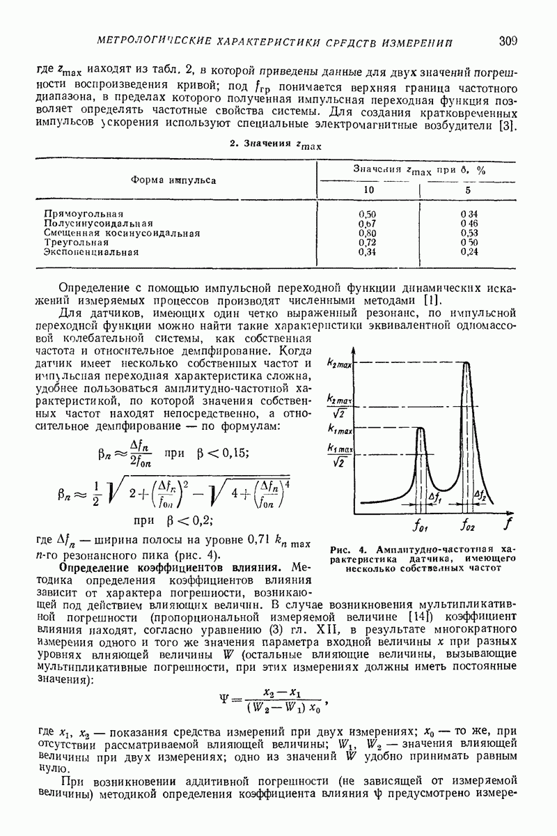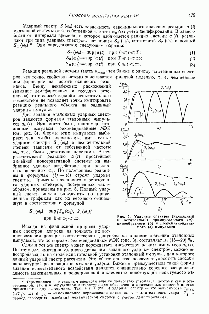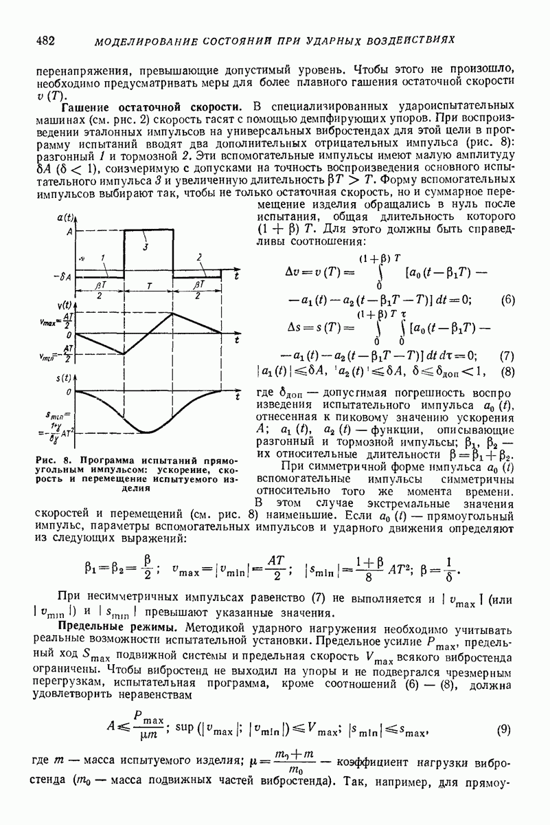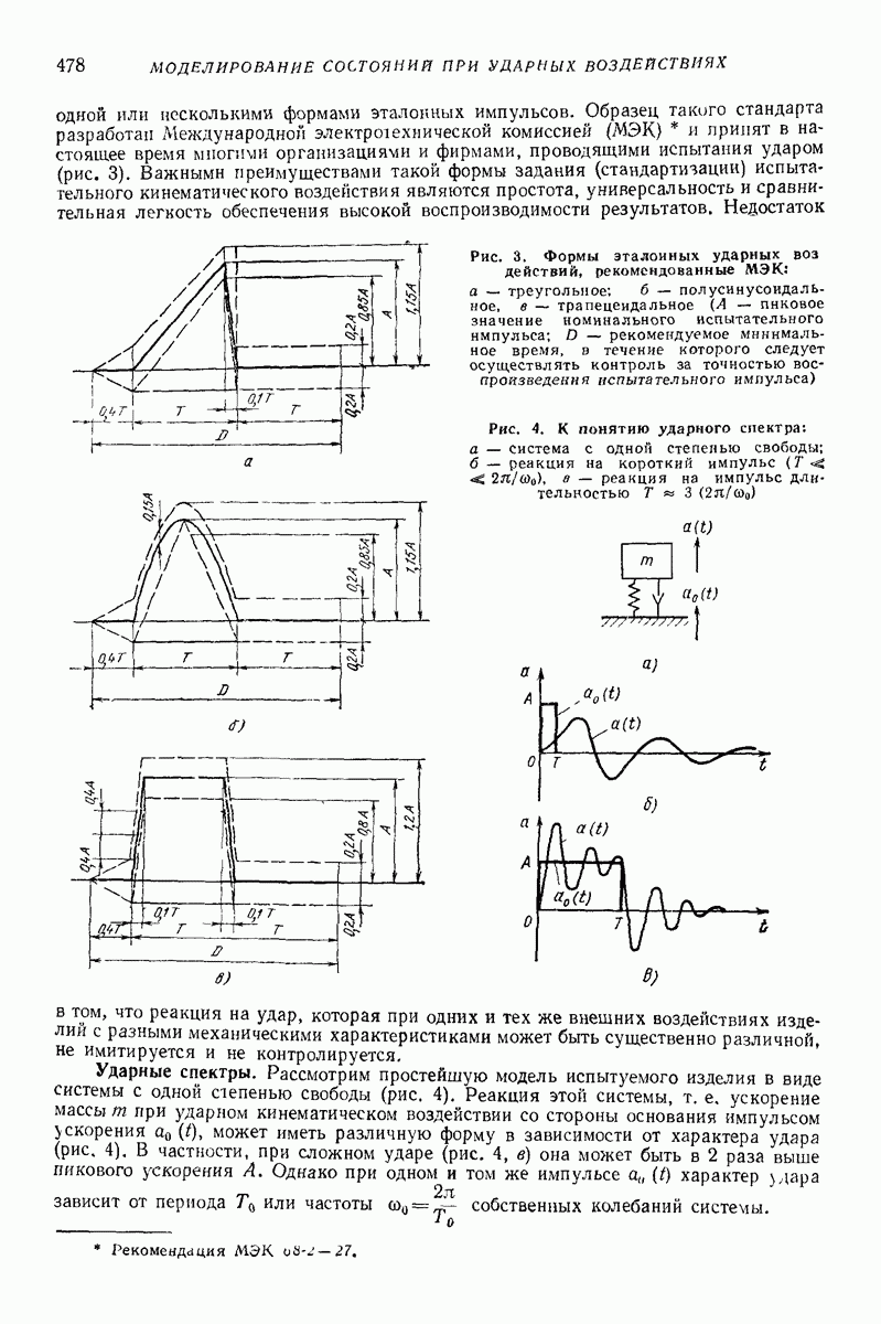 Рис. 12. График колебания объекта в условиях импульсных воздействий В конечном итоге любой способ представления информации о повторяемости вибрационных состояний при эксплуатации должен обеспечивать получение оценок функции распределения вероятностей Предложенная выше модель вибрационного состояния объекта в виде отрезков стационарных случайных процессов равной длительности со случайными спектральными характеристиками не может быть универсальной и охватывать все варианты вибрационных процессов, встречающихся при эксплуатации различных машин, механизмов и сооружений. Однако она пригодна для большинства объектов, являющихся транспортными средствами или их частями, блоками или элементами. В тех же случаях, когда источники вибрации — силы, порождаемые вращающимися несбалансированными элементами, периодически движущимися деталями и т. п., т. е. когда возникают гармонические, полигармонические или узкополосные вибрации, модели могут быть построены аналогично. Различие заключается лишь в том, что вместо дисперсий в полосах частот необходимо рассматривать соответствующие амплитуды, а вместо корреляционных моментов — фазовые сдвиги. Однако, учитывая тот факт, что и при гармонических возбудителях всегда существуют случайные факторы, приводящие к непостоянству амплитуды колебаний и соответствующему «размножению» спектра, можно утверждать, что все указанные случаи можно рассматривать как частные случаи изложенной выше модели. Сложнее обстоит дело, когда гипотеза о «медленной» нестационарности вибрации оказывается неверной. Так происходит в тех случаях, когда объект подвергается воздействию ударных или импульсных нагрузок. Типичными примерами является вибрация агрегата самолета в момент его посадки на взлетную полосу, а также технологические процессы, связанные с последовательным действием ударных нагрузок различной интенсивности. Для этих случаев описанная выше модель не подходит. Однако метод, который использовался при ее построении, может быть применен. Покажем это на следующем примере. Пусть при действии на объект ударных нагрузок колебания в одной из его точек представляют собой нестационарный процесс (рис, 12). Параметры конкретной реализации такого процесса