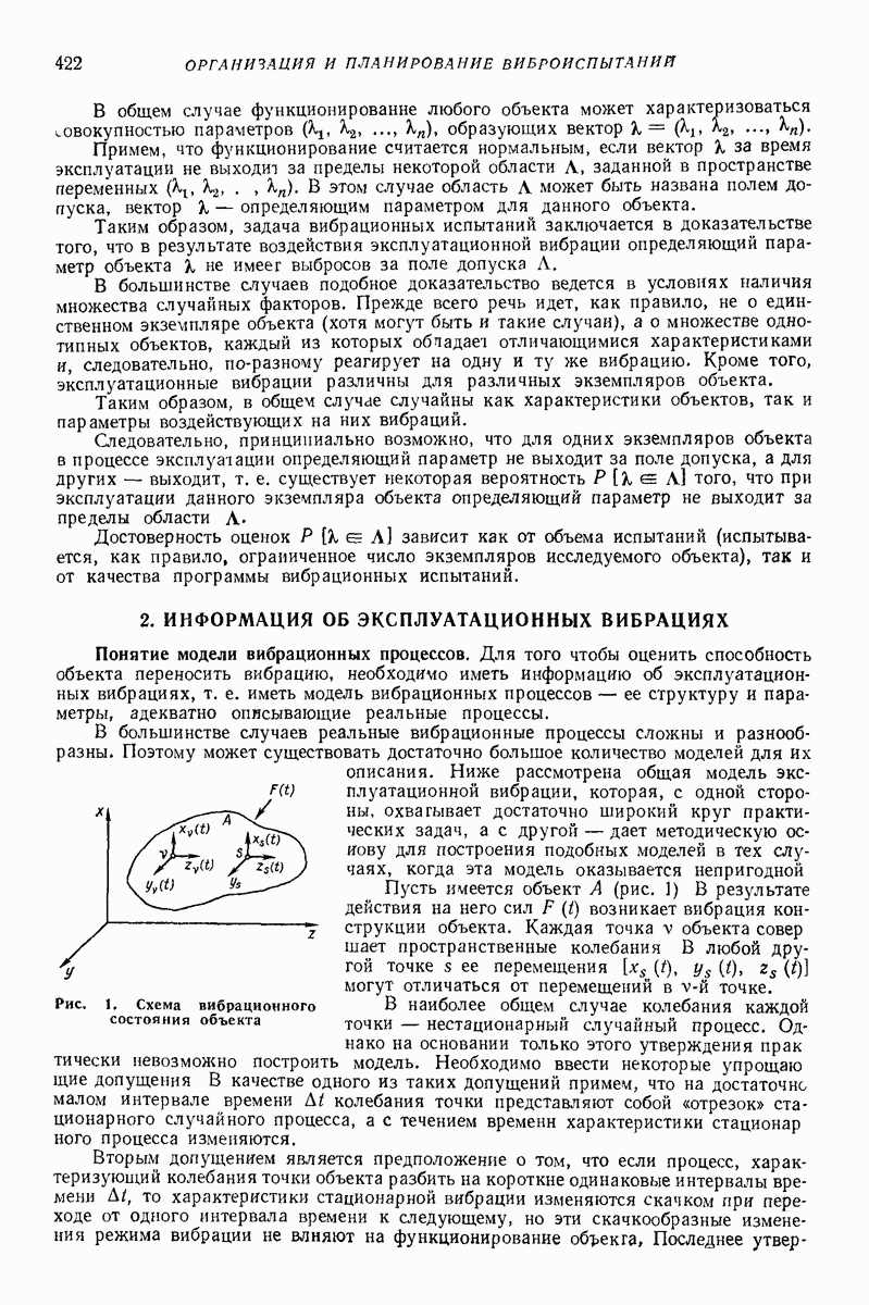 2. ИНФОРМАЦИЯ ОБ ЭКСПЛУАТАЦИОННЫХ ВИБРАЦИЯХПонятие модели вибрационных процессов. Для того чтобы оценить способность объекта переносить вибрацию, необходимо иметь информацию об эксплуатационных вибрациях, т. е. иметь модель вибрационных процессов — ее структуру и параметры, адекватно описывающие реальные процессы. В большинстве случаев реальные вибрационные процессы сложны и разнообразны. Поэтому может существовать достаточно большое количество моделей для их описания. Ниже рассмотрена общая модель эксплуатационной вибрации, которая, с одной стороны, охватывает достаточно широкий круг практических задач, а с другой — дает методическую основу для построения подобных моделей в тех случаях, когда эта модель оказывается непригодной