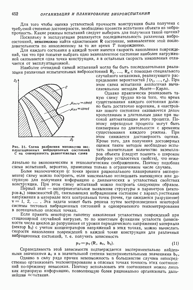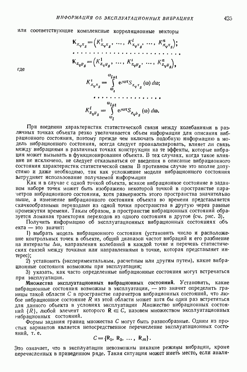 При введении характеристик статистической связи между колебаниями в различных точках объекта резко увеличивается объем информации для описания вибрационного состояния, поэтому прежде чем включать подобную информацию в модель вибрационного состояния, всегда следует проанализировать, влияет ли связь между вибрациями в различных точках конструкции на те эффекты, которые вибрация может вызывать в функционировании объекта. В тех случаях, когда такое влияние не исключено, не следует отказываться от введения в описание вибрационного состояния характеристик статистической связи В противном случае это вполне допустимо и даже необходимо, так как усложнение модели вибрационного состояния затрудняет использование получаемой информации Как и в случае с одной точкой объекта, всякое вибрационное состояние в заданном наборе точек может быть изображено некоторой точкой в пространстве параметров вибрационного состояния, хотя размерность этого пространства значительно выше, а изменение вибрационного состояния объекта во времени представляется скачкообразными переходами из одной точки пространства в другую через равные промежутки времени. Таким образом, в пространстве вибрационных состояний образуется ломаная траектория переходов из одного состояния в другое (см. рис. 3). Получить информацию об эксплуатационных вибрационных состояниях 1) выбрать модель вибрационного состояния (установить число и расположение контрольных точек в объекте, общий диапазон частот вибраций и его разбиение на интервапы 2) установить (экспериментальным, расчетным или другим путем), какие вибрационные состояния возможны при эксплуатации; 3) указать, как часто определенные вибрационные состояния могут встречаться при эксплуатации. Множества эксплуатационных вибрационных состояний. Установить, какие вибрационные состояния возможны в эксплуатации, — это значит определить границы такой области С в пространстве параметров вибрационных состояний, что любое вибрационное состояние Формы задания границ множества С могут быть разнообразные. Одним из простых вариантов является непосредственное перечисление эксплуатационных состояний, т. е.