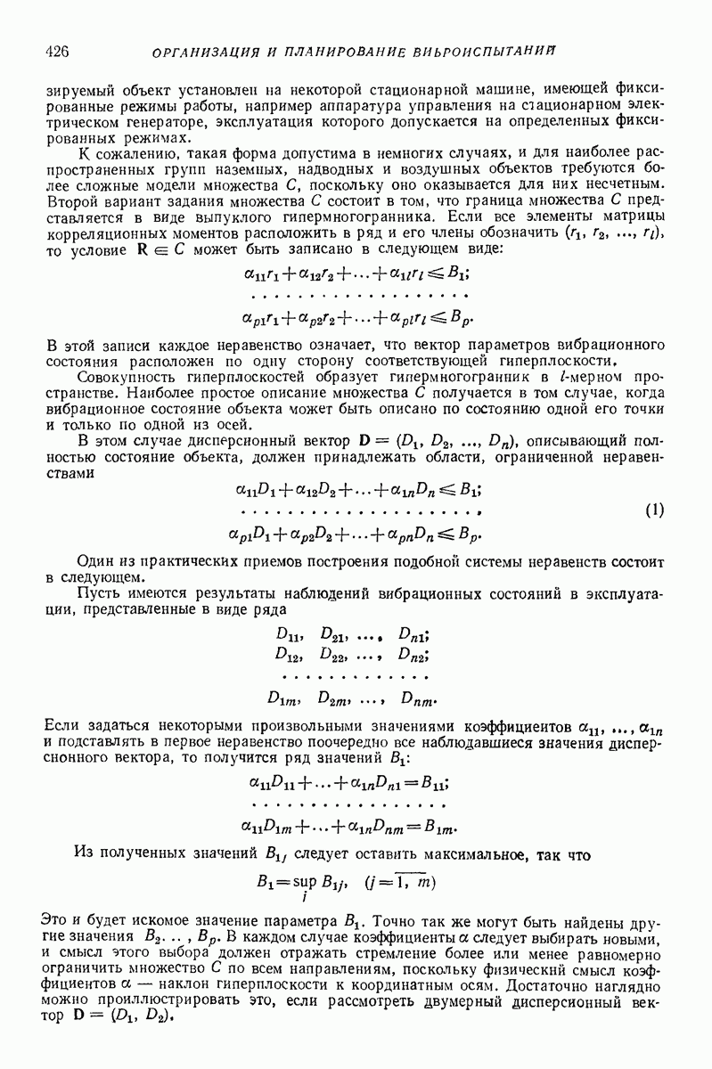 Это означает, что в эксплуатации невозможны никакие режимы вибрации, кроме перечисленных в приведенном ряде, Такая ситуация может иметь место, если анализируемый объект установлен на некоторой стационарной машине, имеющей фиксированные режимы работы, например аппаратура управления на стационарном электрическом генераторе, эксплуатация которого допускается на определенных фиксированных режимах. К сожалению, такая форма допустима в немногих случаях, и для наиболее распространенных групп наземных, надводных и воздушных объектов требуются более сложные модели множества С, поскольку оно оказывается для них несчетным. Второй вариант задания множества С состоит в том, что граница множества С представляется в виде выпуклого гипермногогранника. Если все элементы матрицы корреляционных моментов расположить в ряд и его члены обозначить
