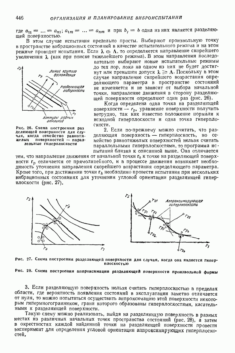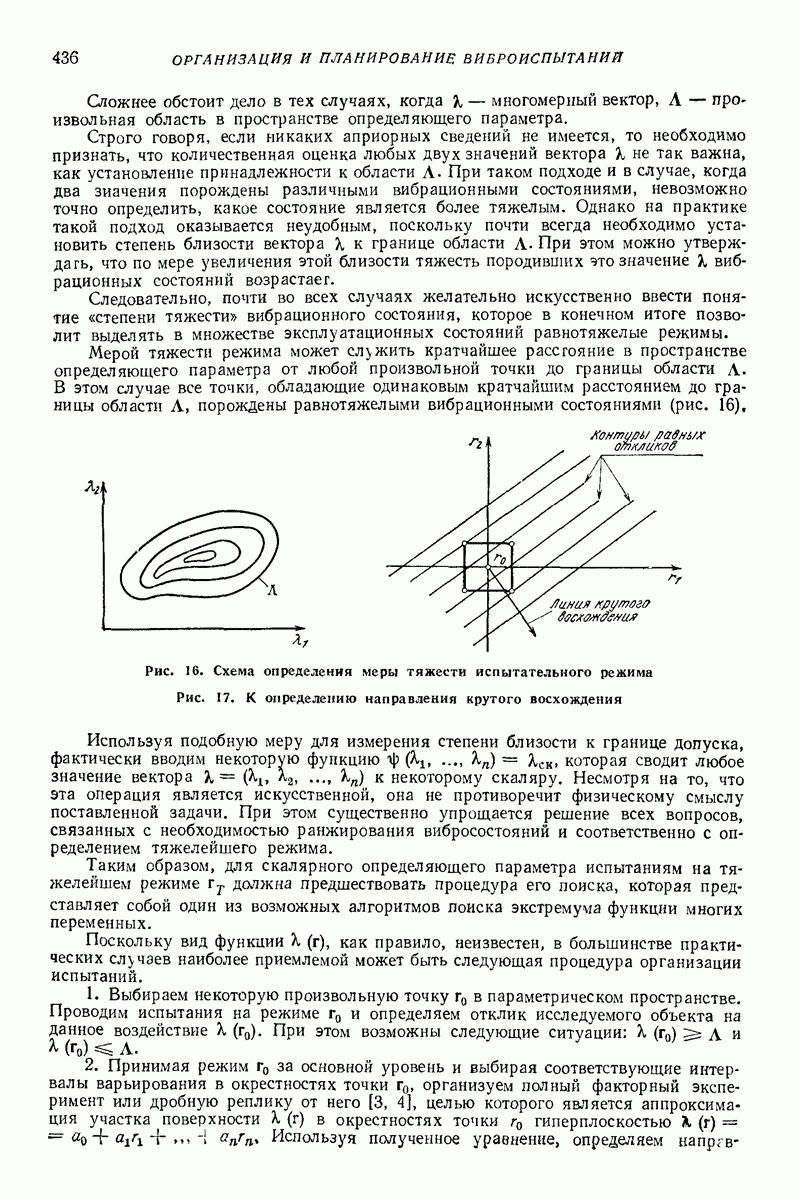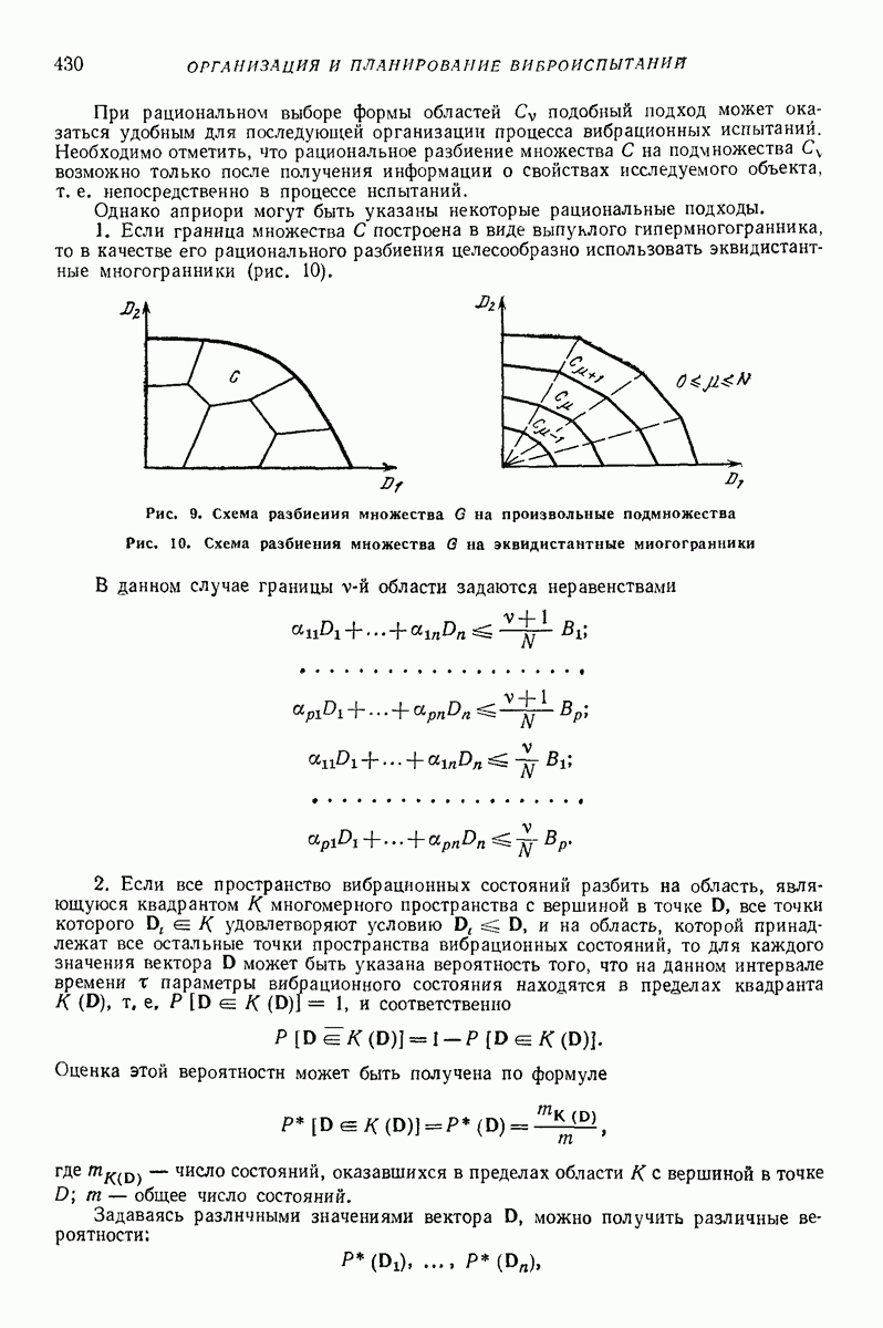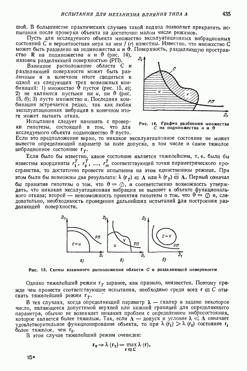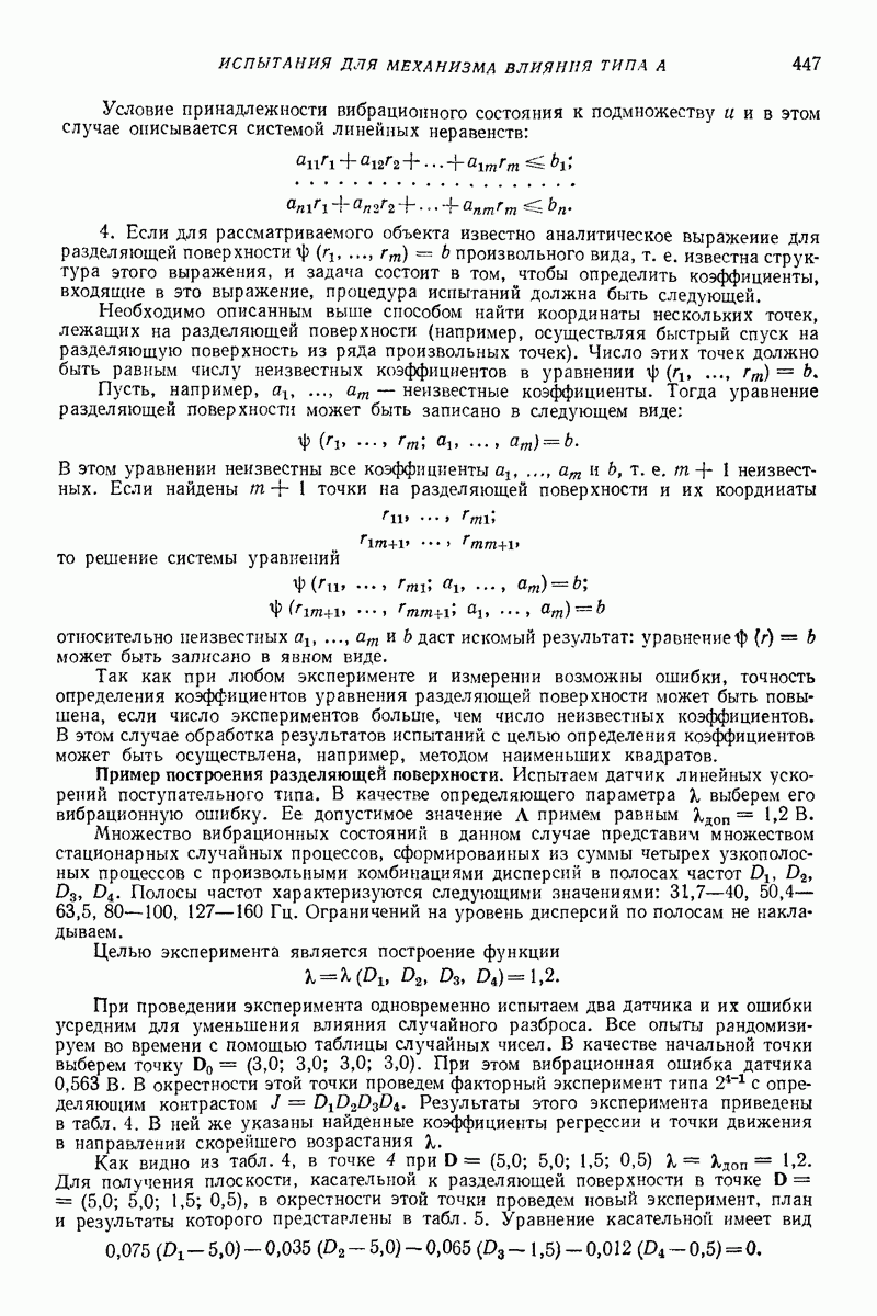 Рис. 6. Графики коэффициентов Ограничения вида Рис. 7. (см. скан) Графическое изображение неравенств (3) В рассмотренном примере, таким образом, удается исключить режимы 1—10 12, 14—16. При таком подходе значительно облегчаются режимы испытаний и сохраняется гарантия того, что испытанные объекты будут нормально функционировать в эксплуатации, Во всех случаях, когда это удобно, границы множества С могут быть построены в любой другой форме, однако изложенные подходы обладают рядом удобств связанных с последующими операциями по выбору режимов испытаний. Все описанные способы построения границ множества С основаны на идее построения такой поверхности в параметрическом пространстве, которая, с одной стороны, ограничивает всю область наблюдавшихся состояний, с другой стороны позволяет утверждать, что в условиях эксплуатации не встретятся состояния, выходящие за пределы области, ограничиваемой этой поверхностью (рис. 8). Очевидно, что такой подход справедлив при наличии бесконечно большого числа наблюдений вибрационных состояний при эксплуатация. Практически число наблюдений всегда конечно. Поэтому границы всех возможных при эксплуатации вибрационных состояний можно построить лишь в том случае, когда параметры предельных состояний могут быть заключены в рамки некоторых физических ограничений.