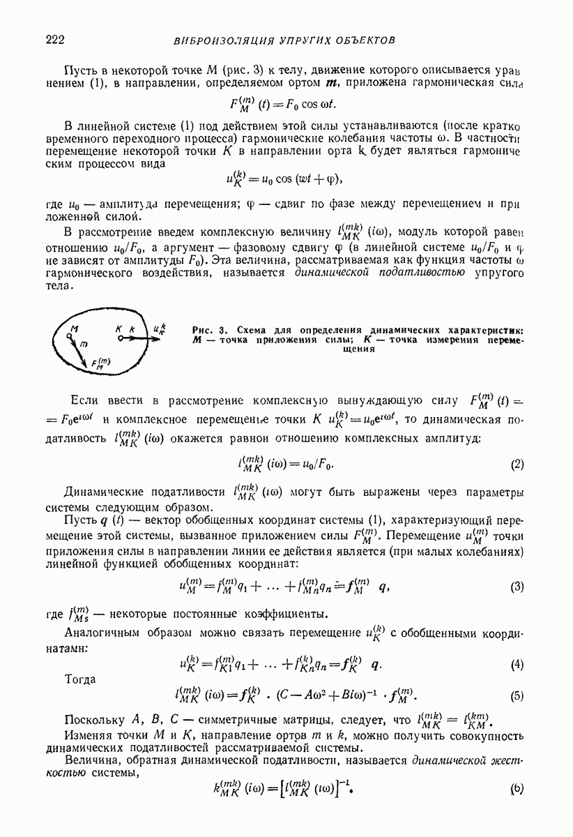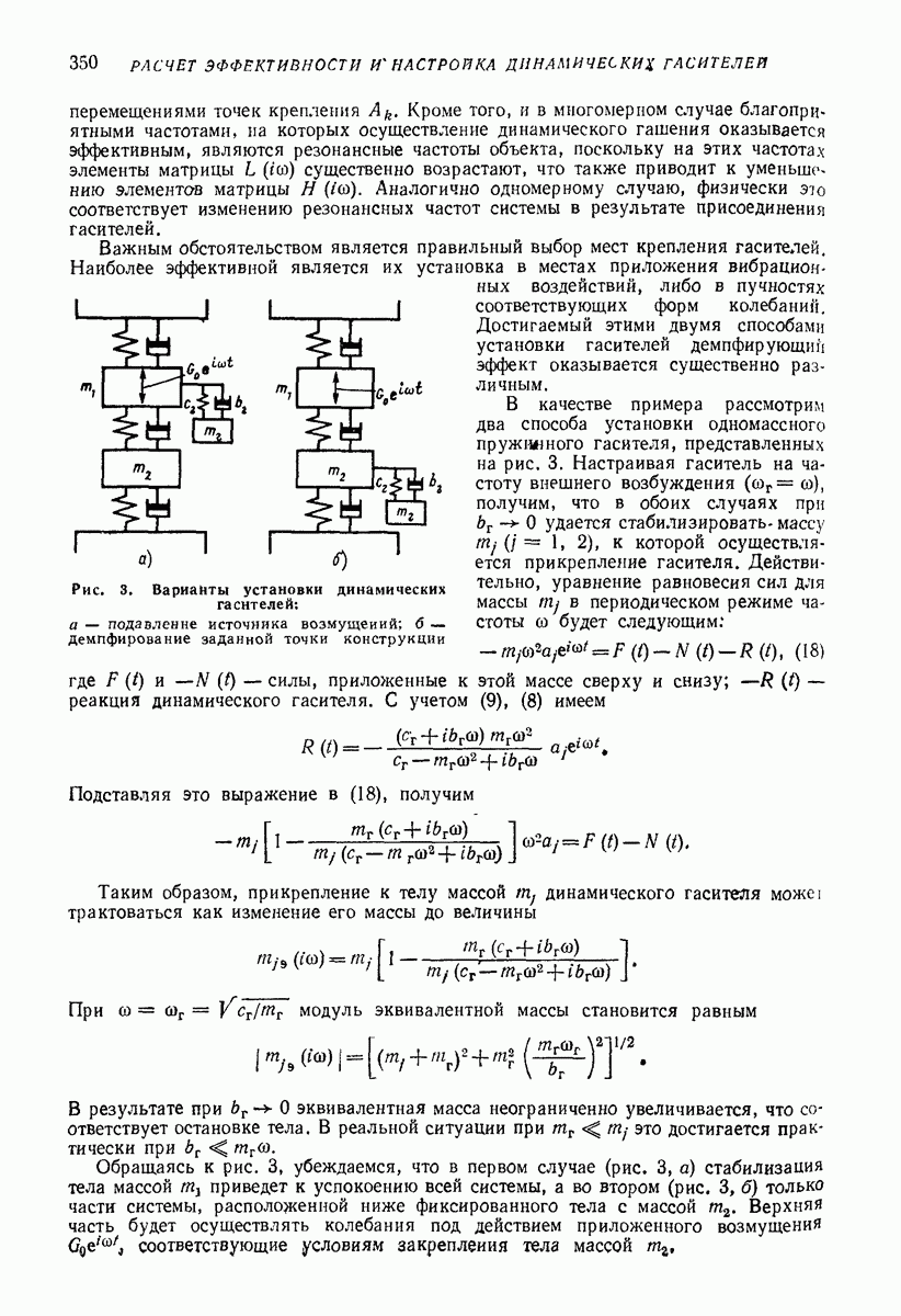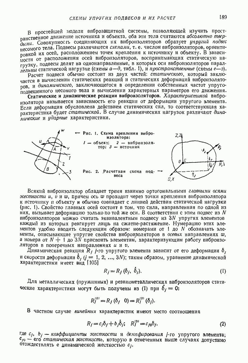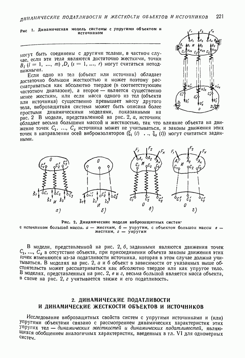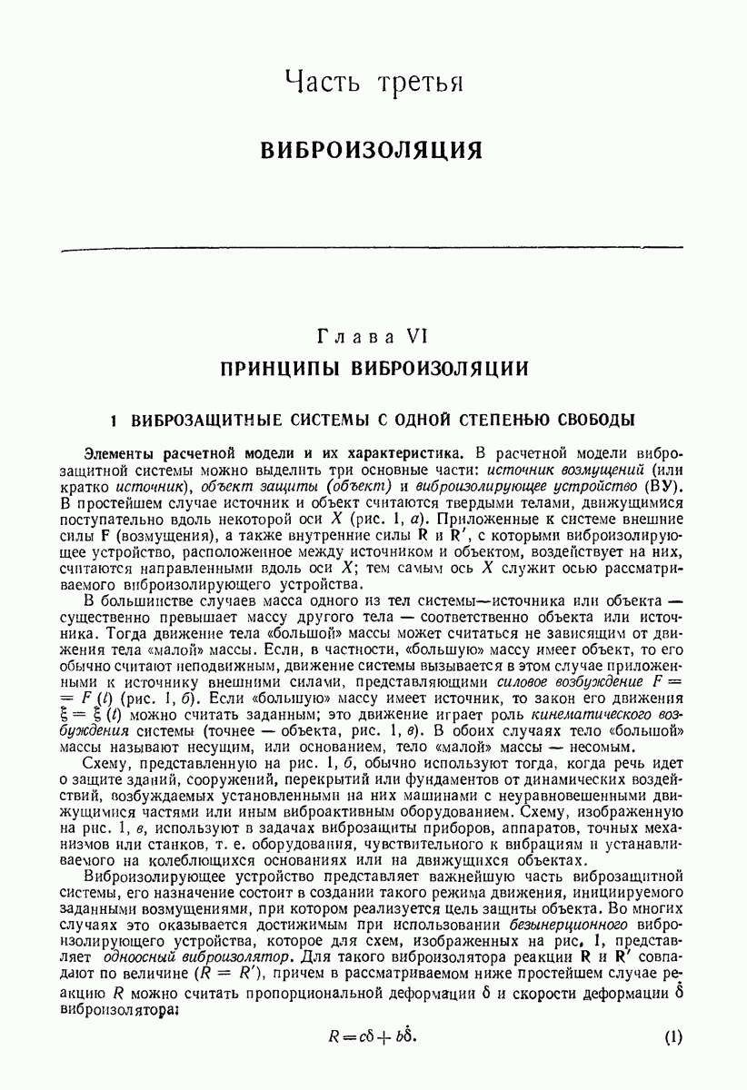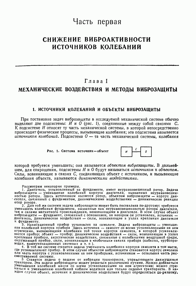 Рис. 13. Схема виброизоляции б) изменением конструкции объекта, при котором заданные механические воздействия будут вызывать менее интенсивные колебания объекта или отдельных его частей; этот метод называется внутренней виброзащитой объекта; в) присоединением к объекту дополнительной механической системы (рис. 12), изменяющей характер его колебаний. Такая система называется динамическим гасителем колебаний, а метод виброзащиты, основанный на ее применении, — динамическим гашением колебаний; г) установкой между объектом и источником дополнительной системы (рис, 13), защищающей объект от механических воздействий, возбуждаемых источником; этот метод виброзащиты называется виброизоляцией, а устройства, устанавливаемые между источником и объектом, — виброизоляторами (термин амортизатор не рекомендуется к применению). Рассмотрим каждый из перечисленных методов. Снижение виброактивности источника. Возбуждение колебаний источниками может быть обусловлено различными причинами. Удобно разделить возмущающие факторы на две группы, К первой можно отнести различные физико-химические процессы, происходящие в источнике: процессы горения в реактивных двигателях и двигателях внутреннего сгорания, процессы взаимодействия жидкости или газа с лопатками турбин (сопровождающиеся такими побочными явлениями, как кавитация), пульсацию жидкости или газа в трубопроводах, электромагнитные явления в двигателях и генераторах, разнообразные технологические процессы (например, процесс резания металлов на металлорежущих стайках, процессы обработки материала в горнообогатительном оборудовании и т. п.). К этой группе относятся и явления, связанные с трением в кинематических парах, которое также служит источником возникновения колебаний. Снижение виброактивности факторов этой группы связано с изменением параметров физико-химических процессов и может быгь достигнуто способами, специфическими для каждого частного случая. Эти способы изложены в т. 3 и 4 справочника при рассмотрении колебаний машин и агрегатов различных классов. Вторая группа возмущающих факторов связана с движущимися телами. Движение тел внутри источника (вращение роторов, перемещение звельев механизмов) сопровождается возникновением динамических реакций связей, соединяющих источник с другими телами, в частности с объектом. Снижение виброактивности источника в этом случае заключается в уменьшении динамических реакций с помощью так называемого уравновешивания движущихся тел. Методы уравновешивания являются, таким образом, способами снижения виброактивности, общими для всех источников, содержащих движущиеся тела Эти методы будут рассмотрены в первой части. При решении задач уравновешивания приходится учитывать динамические свойства источников, и в первую очередь нежесткость их элементов. Изменение конструкции объекта. Проблему уменьшения колебаний объекта путем изменения его конструкции необходимо рассматривать в каждом случае особо, с учетом особенностей объекта и конструктивных возможностей его изменения. Однако можно указать два способа снижения колебаний, общих для всех механических систем. Первый способ состоит в устранении резонансных явлений. Если объект обладает линейными свойствами, то задача сводится к соответствующему изменению его собстве