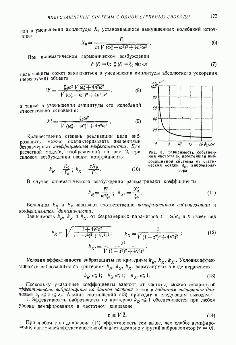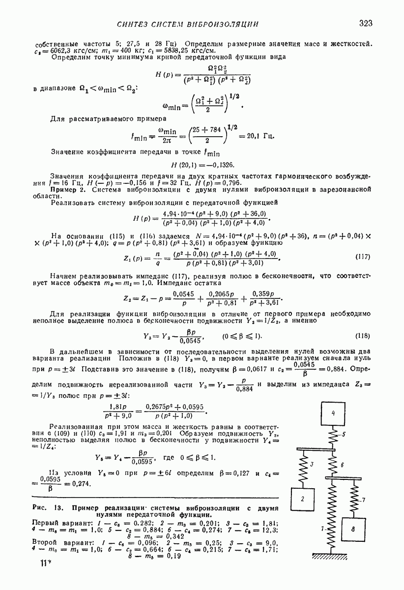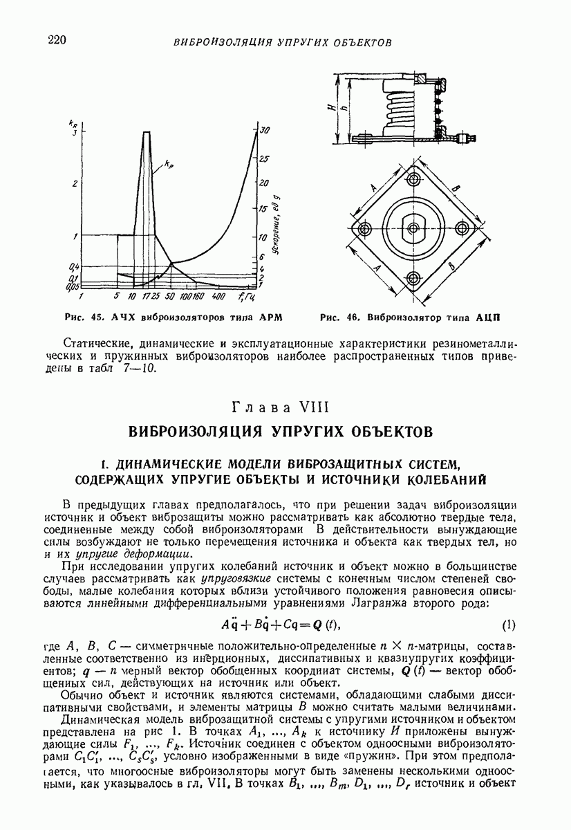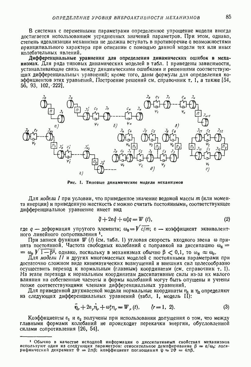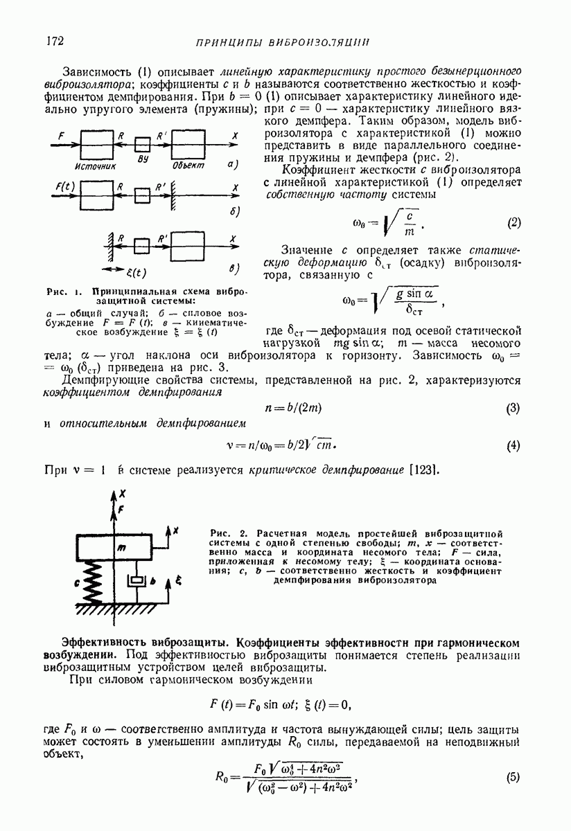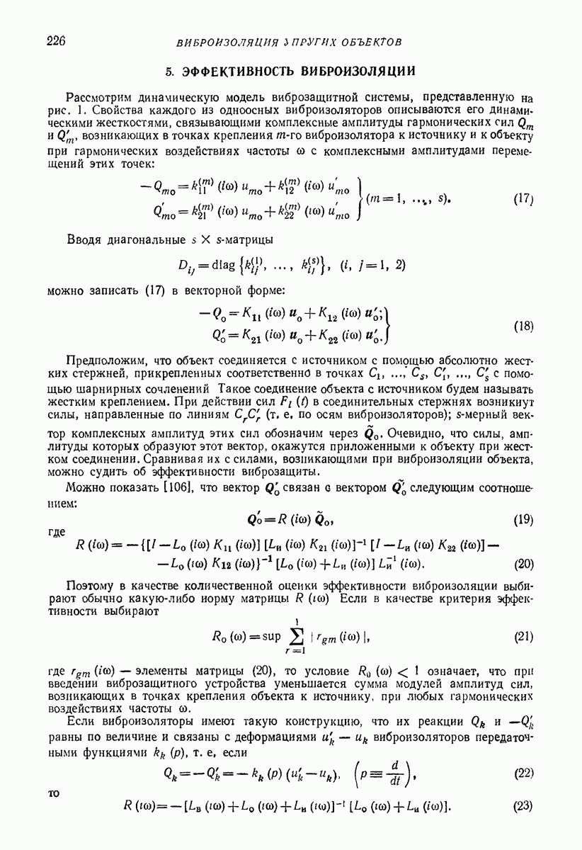 Рис. 13. Схема виброизоляции б) изменением конструкции объекта, при котором заданные механические воздействия будут вызывать менее интенсивные колебания объекта или отдельных его частей; этот метод называется внутренней виброзащитой объекта; в) присоединением к объекту дополнительной механической системы (рис. 12), изменяющей характер его колебаний. Такая система называется динамическим гасителем колебаний, а метод виброзащиты, основанный на ее применении, — динамическим гашением колебаний; г) установкой между объектом и источником дополнительной системы (рис, 13), защищающей объект от механических воздействий, возбуждаемых источником; этот метод виброзащиты называется виброизоляцией, а устройства, устанавливаемые между источником и объектом, — виброизоляторами (термин амортизатор не рекомендуется к применению). Рассмотрим каждый из перечисленных методов. Снижение виброактивности источника. Возбуждение колебаний источниками может быть обусловлено различными причинами. Удобно разделить возмущающие факторы на две группы, К первой можно отнести различные физико-химические процессы, происходящие в источнике: процессы горения в реактивных двигателях и двигателях внутреннего сгорания, процессы взаимодействия жидкости или газа с лопатками турбин (сопровождающиеся такими побочными явлениями, как кавитация), пульсацию жидкости или газа в трубопроводах, электромагнитные явления в двигателях и генераторах, разнообразные технологические процессы (например, процесс резания металлов на металлорежущих стайках, процессы обработки материала в горнообогатительном оборудовании и т. п.). К этой группе относятся и явления, связанные с трением в кинематических парах, которое также служит источником возникновения колебаний. Снижение виброактивности факторов этой группы связано с изменением параметров физико-химических процессов и может быгь достигнуто способами, специфическими для каждого частного случая. Эти способы изложены в т. 3 и 4 справочника при рассмотрении колебаний машин и агрегатов различных классов. Вторая группа возмущающих факторов связана с движущимися телами. Движение тел внутри источника (вращение роторов, перемещение звельев механизмов) сопровождается возникновением динамических реакций связей, соединяющих источник с другими телами, в частности с объектом. Снижение виброактивности источника в этом случае заключается в уменьшении динамических реакций с помощью так называемого уравновешивания движущихся тел. Методы уравновешивания являются, таким образом, способами снижения виброактивности, общими для всех источников, содержащих движущиеся тела Эти методы будут рассмотрены в первой части. При решении задач уравновешивания приходится учитывать динамические свойства источников, и в первую очередь нежесткость их элементов. Изменение конструкции объекта. Проблему уменьшения колебаний объекта путем изменения его конструкции необходимо рассматривать в каждом случае особо, с учетом особенностей объекта и конструктивных возможностей его изменения. Однако можно указать два способа снижения колебаний, общих для всех механических систем. Первый способ состоит в устранении резонансных явлений. Если объект обладает линейными свойствами, то задача сводится к соответствующему изменению его собстве
