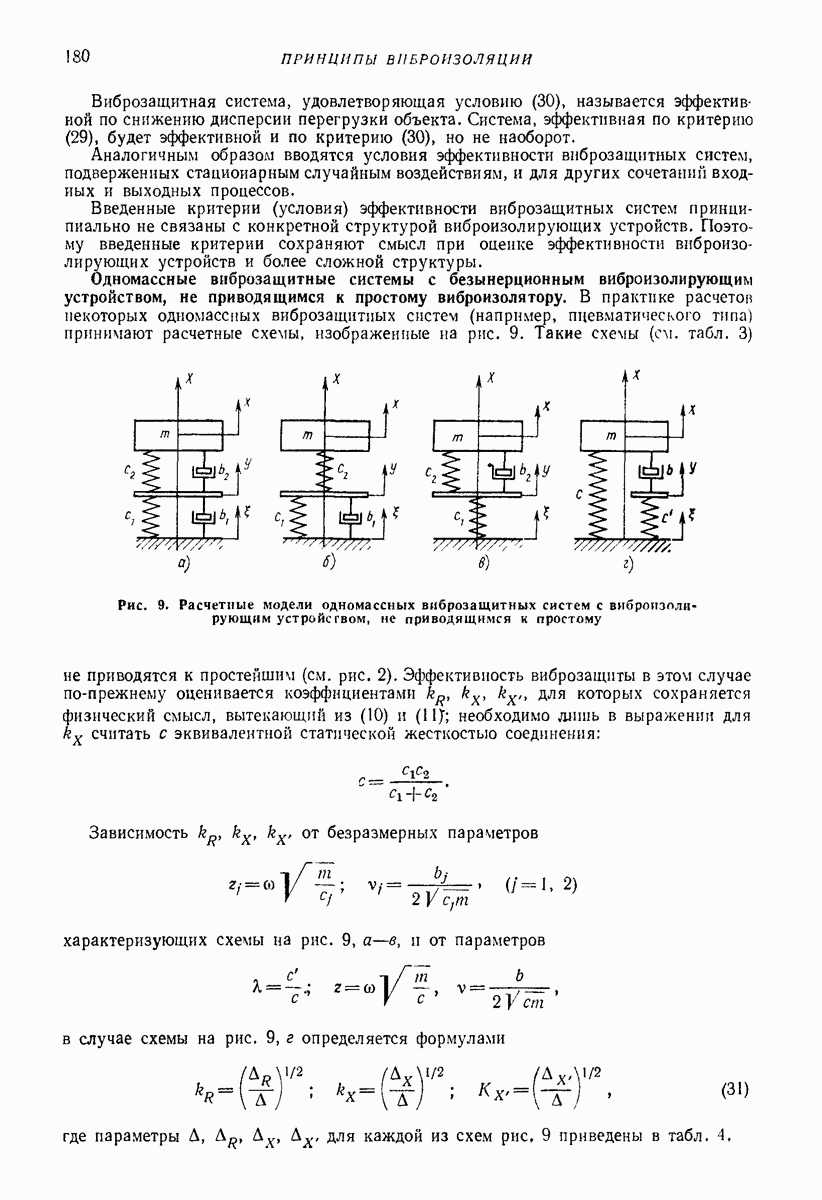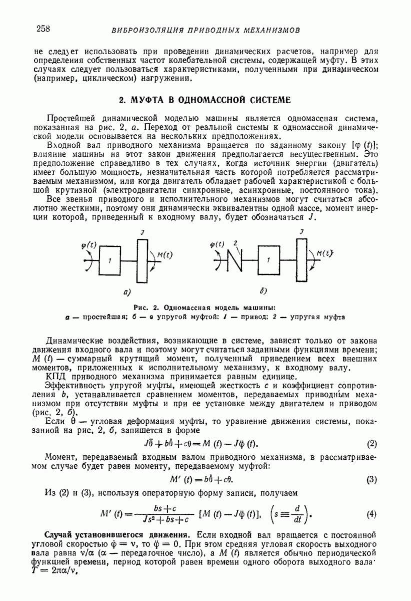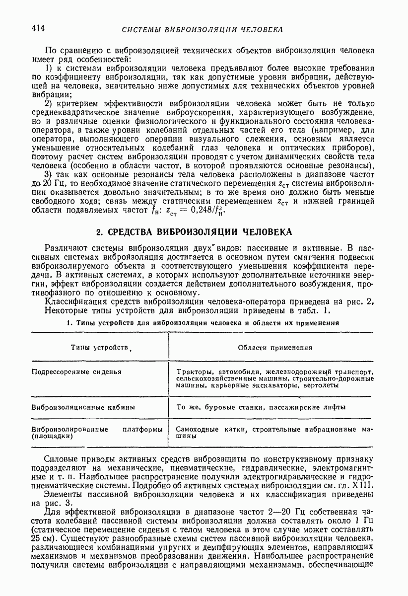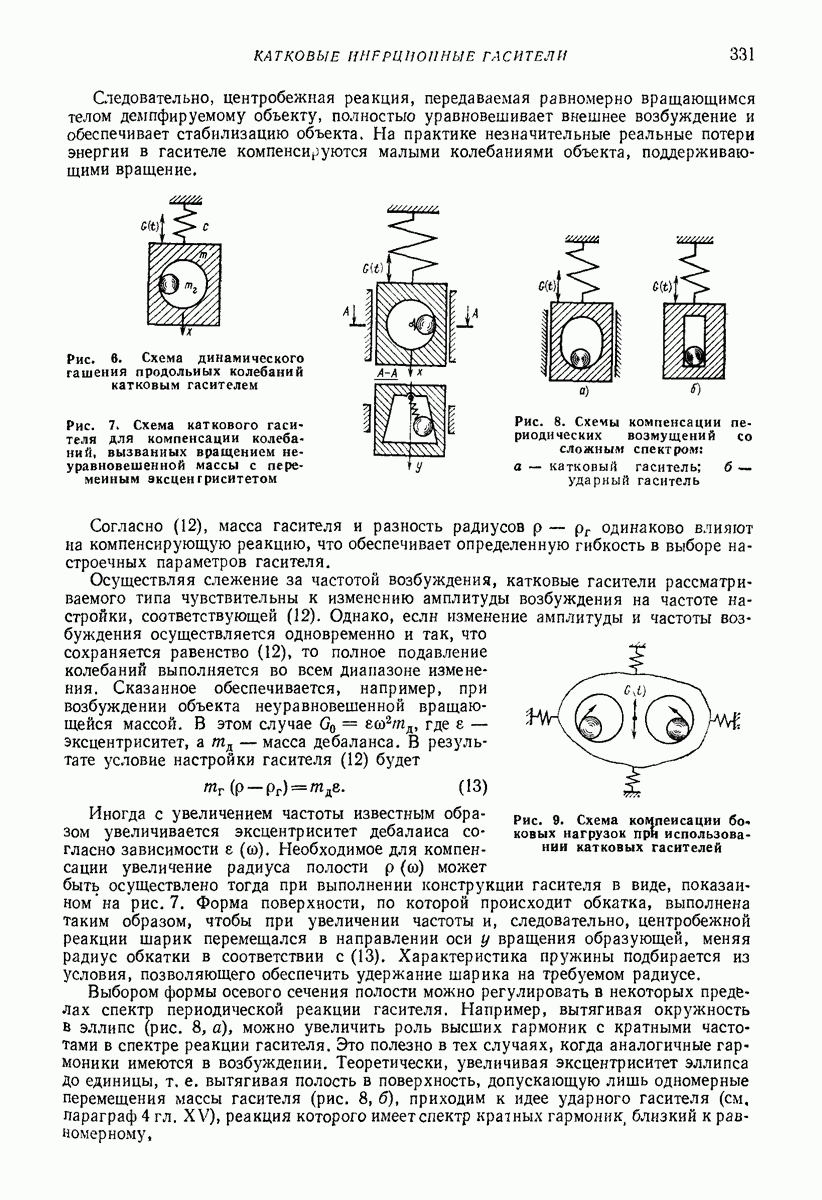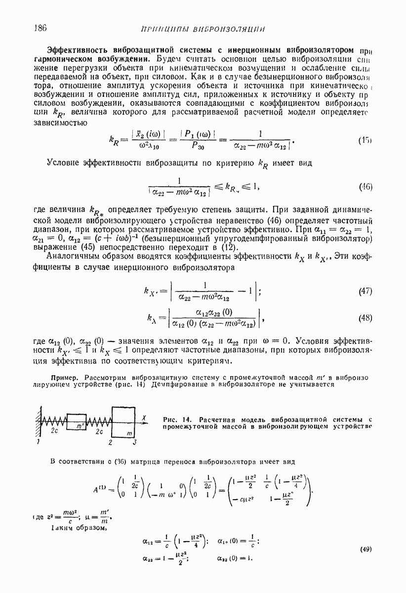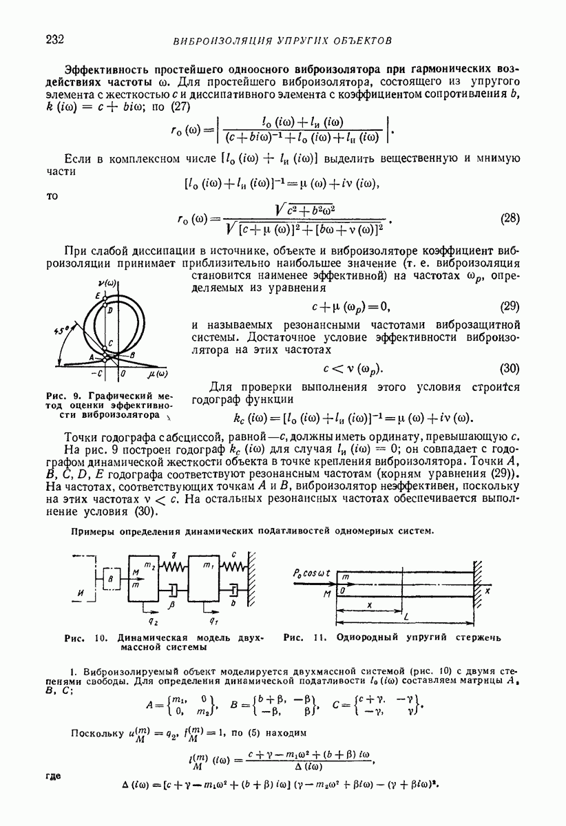 Рис. 13. Схема виброизоляции б) изменением конструкции объекта, при котором заданные механические воздействия будут вызывать менее интенсивные колебания объекта или отдельных его частей; этот метод называется внутренней виброзащитой объекта; в) присоединением к объекту дополнительной механической системы (рис. 12), изменяющей характер его колебаний. Такая система называется динамическим гасителем колебаний, а метод виброзащиты, основанный на ее применении, — динамическим гашением колебаний; г) установкой между объектом и источником дополнительной системы (рис, 13), защищающей объект от механических воздействий, возбуждаемых источником; этот метод виброзащиты называется виброизоляцией, а устройства, устанавливаемые между источником и объектом, — виброизоляторами (термин амортизатор не рекомендуется к применению). Рассмотрим каждый из перечисленных методов. Снижение виброактивности источника. Возбуждение колебаний источниками может быть обусловлено различными причинами. Удобно разделить возмущающие факторы на две группы, К первой можно отнести различные физико-химические процессы, происходящие в источнике: процессы горения в реактивных двигателях и двигателях внутреннего сгорания, процессы взаимодействия жидкости или газа с лопатками турбин (сопровождающиеся такими побочными явлениями, как кавитация), пульсацию жидкости или газа в трубопроводах, электромагнитные явления в двигателях и генераторах, разнообразные технологические процессы (например, процесс резания металлов на металлорежущих стайках, процессы обработки материала в горнообогатительном оборудовании и т. п.). К этой группе относятся и явления, связанные с трением в кинематических парах, которое также служит источником возникновения колебаний. Снижение виброактивности факторов этой группы связано с изменением параметров физико-химических процессов и может быгь достигнуто способами, специфическими для каждого частного случая. Эти способы изложены в т. 3 и 4 справочника при рассмотрении колебаний машин и агрегатов различных классов. Вторая группа возмущающих факторов связана с движущимися телами. Движение тел внутри источника (вращение роторов, перемещение звельев механизмов) сопровождается возникновением динамических реакций связей, соединяющих источник с другими телами, в частности с объектом. Снижение виброактивности источника в этом случае заключается в уменьшении динамических реакций с помощью так называемого уравновешивания движущихся тел. Методы уравновешивания являются, таким образом, способами снижения виброактивности, общими для всех источников, содержащих движущиеся тела Эти методы будут рассмотрены в первой части. При решении задач уравновешивания приходится учитывать динамические свойства источников, и в первую очередь нежесткость их элементов. Изменение конструкции объекта. Проблему уменьшения колебаний объекта путем изменения его конструкции необходимо рассматривать в каждом случае особо, с учетом особенностей объекта и конструктивных возможностей его изменения. Однако можно указать два способа снижения колебаний, общих для всех механических систем. Первый способ состоит в устранении резонансных явлений. Если объект обладает линейными свойствами, то задача сводится к соответствующему изменению его собстве
