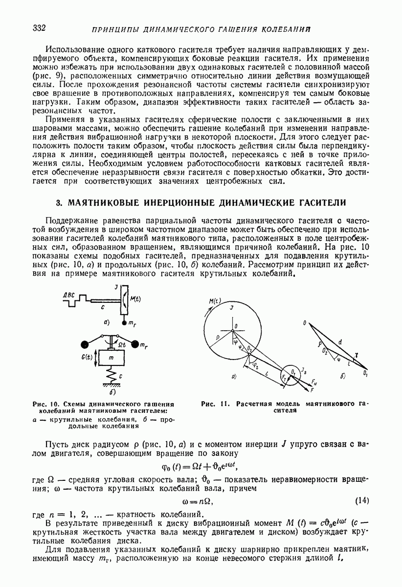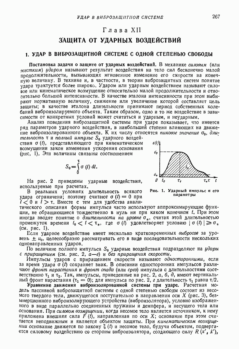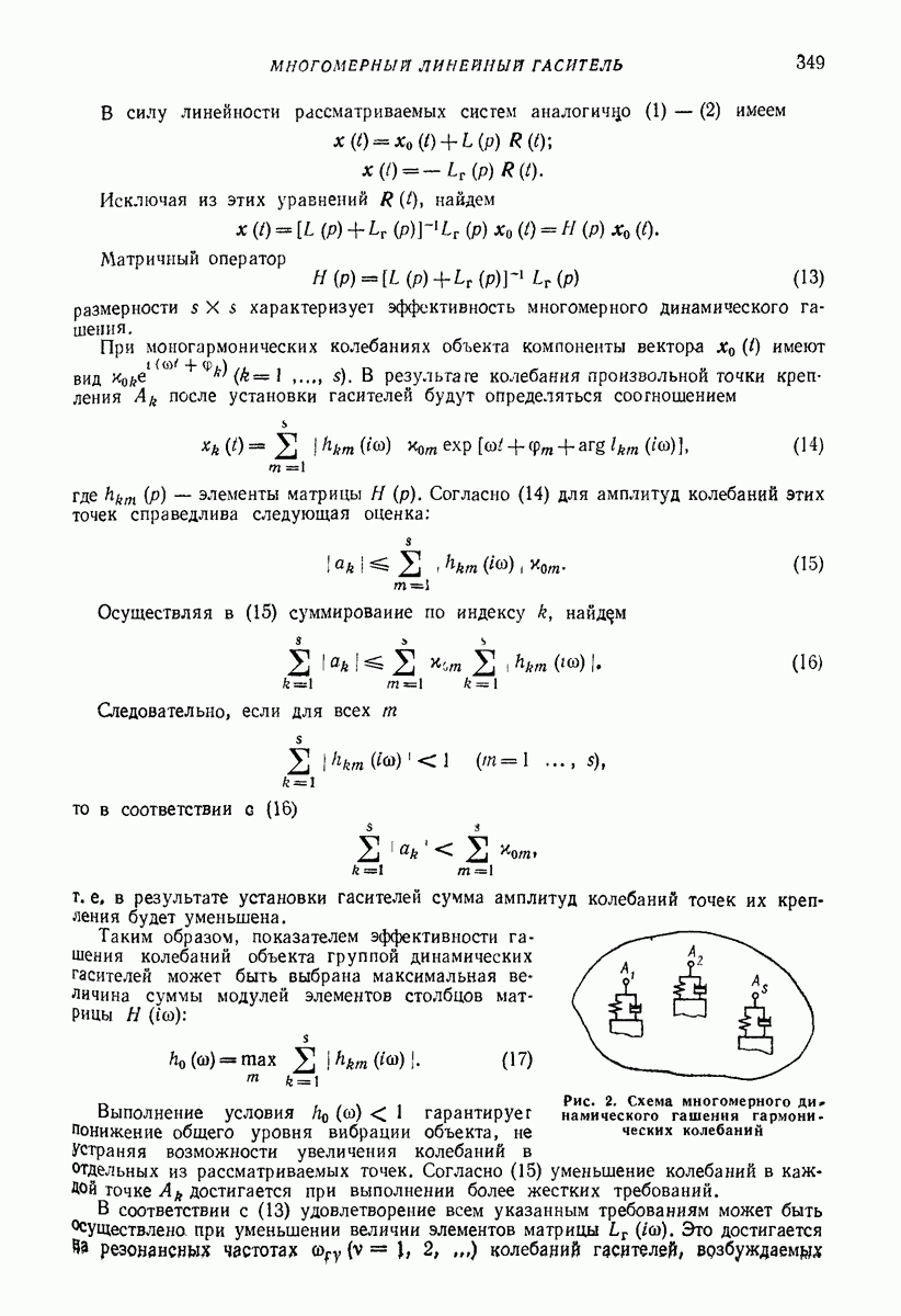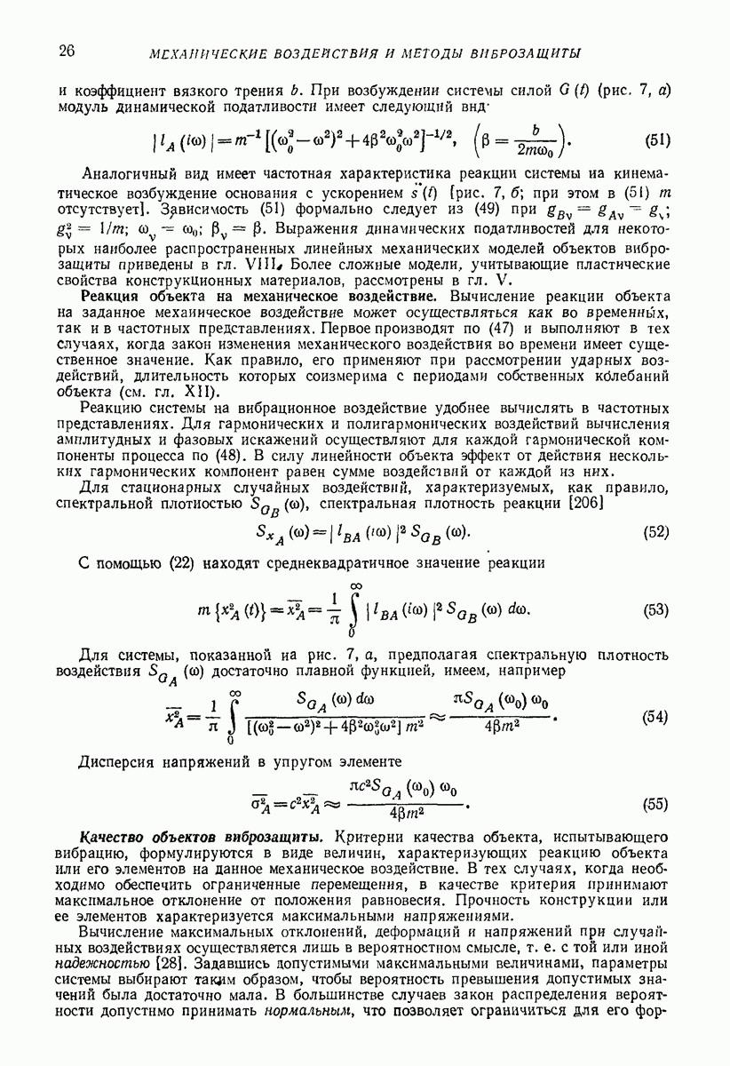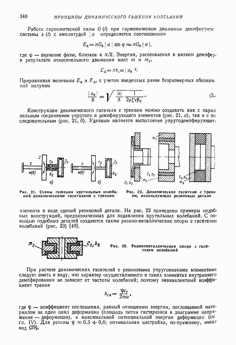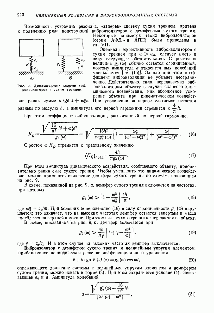 Рис. 13. Схема виброизоляции б) изменением конструкции объекта, при котором заданные механические воздействия будут вызывать менее интенсивные колебания объекта или отдельных его частей; этот метод называется внутренней виброзащитой объекта; в) присоединением к объекту дополнительной механической системы (рис. 12), изменяющей характер его колебаний. Такая система называется динамическим гасителем колебаний, а метод виброзащиты, основанный на ее применении, — динамическим гашением колебаний; г) установкой между объектом и источником дополнительной системы (рис, 13), защищающей объект от механических воздействий, возбуждаемых источником; этот метод виброзащиты называется виброизоляцией, а устройства, устанавливаемые между источником и объектом, — виброизоляторами (термин амортизатор не рекомендуется к применению). Рассмотрим каждый из перечисленных методов. Снижение виброактивности источника. Возбуждение колебаний источниками может быть обусловлено различными причинами. Удобно разделить возмущающие факторы на две группы, К первой можно отнести различные физико-химические процессы, происходящие в источнике: процессы горения в реактивных двигателях и двигателях внутреннего сгорания, процессы взаимодействия жидкости или газа с лопатками турбин (сопровождающиеся такими побочными явлениями, как кавитация), пульсацию жидкости или газа в трубопроводах, электромагнитные явления в двигателях и генераторах, разнообразные технологические процессы (например, процесс резания металлов на металлорежущих стайках, процессы обработки материала в горнообогатительном оборудовании и т. п.). К этой группе относятся и явления, связанные с трением в кинематических парах, которое также служит источником возникновения колебаний. Снижение виброактивности факторов этой группы связано с изменением параметров физико-химических процессов и может быгь достигнуто способами, специфическими для каждого частного случая. Эти способы изложены в т. 3 и 4 справочника при рассмотрении колебаний машин и агрегатов различных классов. Вторая группа возмущающих факторов связана с движущимися телами. Движение тел внутри источника (вращение роторов, перемещение звельев механизмов) сопровождается возникновением динамических реакций связей, соединяющих источник с другими телами, в частности с объектом. Снижение виброактивности источника в этом случае заключается в уменьшении динамических реакций с помощью так называемого уравновешивания движущихся тел. Методы уравновешивания являются, таким образом, способами снижения виброактивности, общими для всех источников, содержащих движущиеся тела Эти методы будут рассмотрены в первой части. При решении задач уравновешивания приходится учитывать динамические свойства источников, и в первую очередь нежесткость их элементов. Изменение конструкции объекта. Проблему уменьшения колебаний объекта путем изменения его конструкции необходимо рассматривать в каждом случае особо, с учетом особенностей объекта и конструктивных возможностей его изменения. Однако можно указать два способа снижения колебаний, общих для всех механических систем. Первый способ состоит в устранении резонансных явлений. Если объект обладает линейными свойствами, то задача сводится к соответствующему изменению его собстве