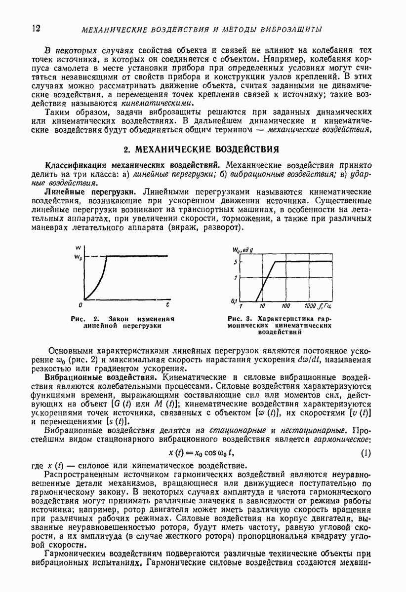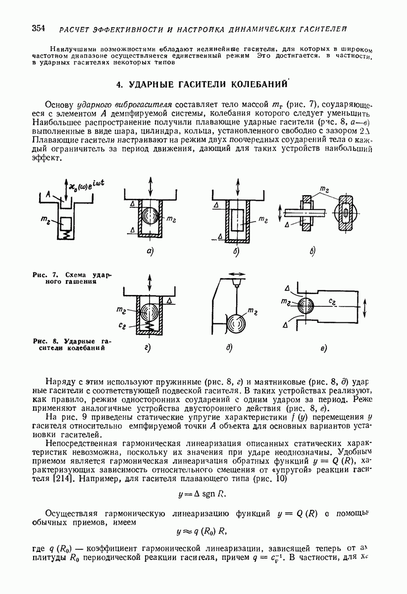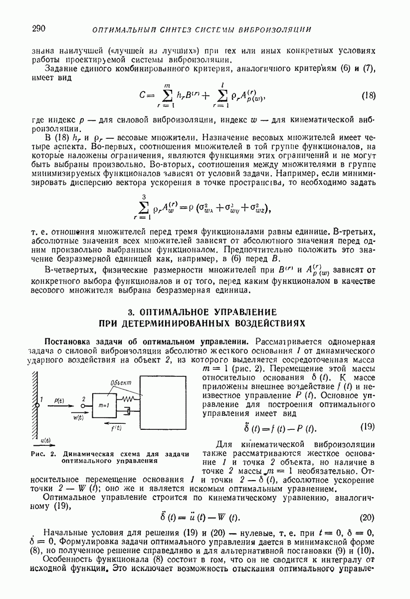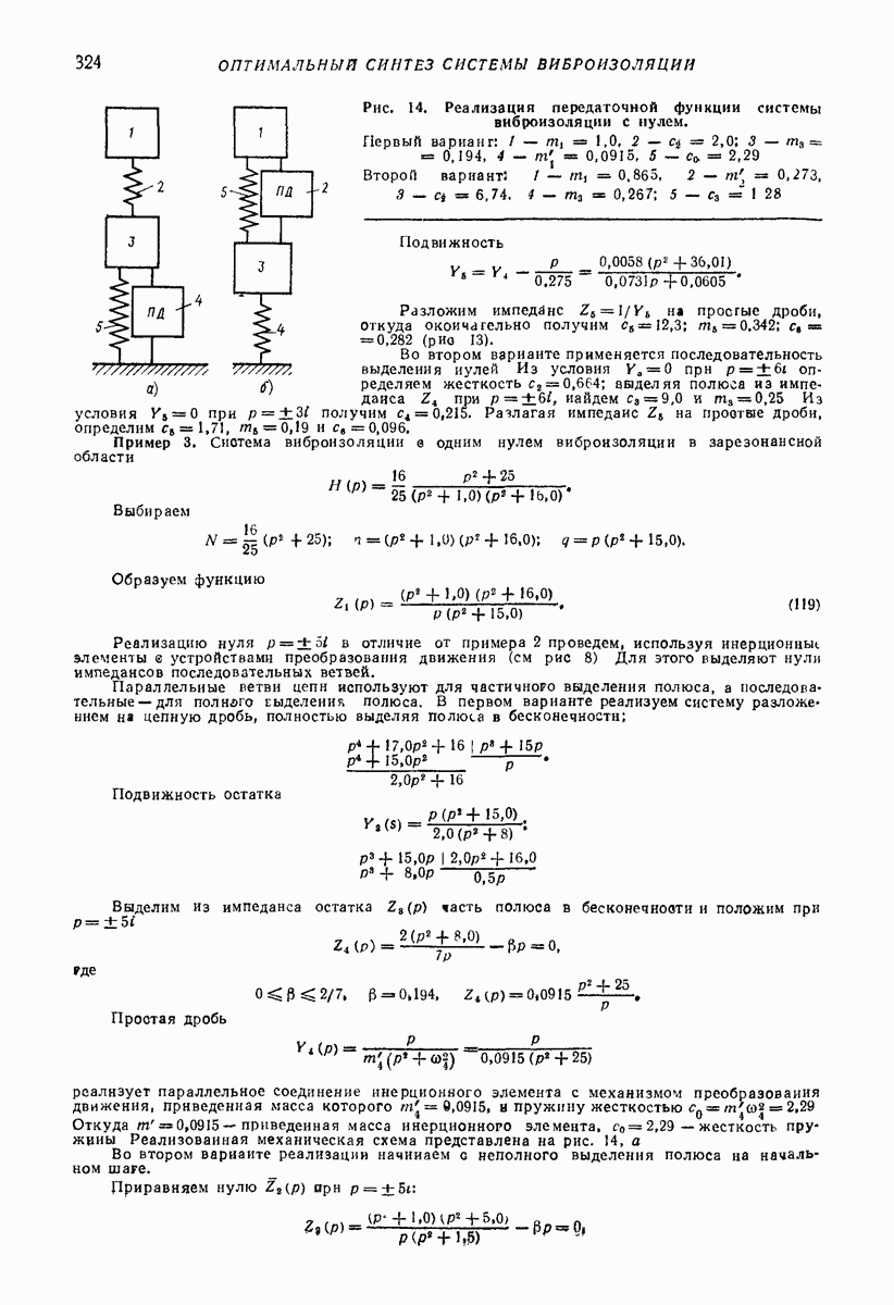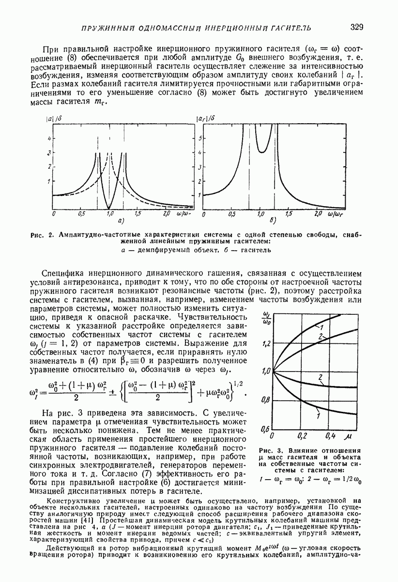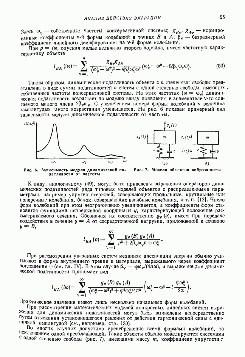 Рис. 13. Схема виброизоляции б) изменением конструкции объекта, при котором заданные механические воздействия будут вызывать менее интенсивные колебания объекта или отдельных его частей; этот метод называется внутренней виброзащитой объекта; в) присоединением к объекту дополнительной механической системы (рис. 12), изменяющей характер его колебаний. Такая система называется динамическим гасителем колебаний, а метод виброзащиты, основанный на ее применении, — динамическим гашением колебаний; г) установкой между объектом и источником дополнительной системы (рис, 13), защищающей объект от механических воздействий, возбуждаемых источником; этот метод виброзащиты называется виброизоляцией, а устройства, устанавливаемые между источником и объектом, — виброизоляторами (термин амортизатор не рекомендуется к применению). Рассмотрим каждый из перечисленных методов. Снижение виброактивности источника. Возбуждение колебаний источниками может быть обусловлено различными причинами. Удобно разделить возмущающие факторы на две группы, К первой можно отнести различные физико-химические процессы, происходящие в источнике: процессы горения в реактивных двигателях и двигателях внутреннего сгорания, процессы взаимодействия жидкости или газа с лопатками турбин (сопровождающиеся такими побочными явлениями, как кавитация), пульсацию жидкости или газа в трубопроводах, электромагнитные явления в двигателях и генераторах, разнообразные технологические процессы (например, процесс резания металлов на металлорежущих стайках, процессы обработки материала в горнообогатительном оборудовании и т. п.). К этой группе относятся и явления, связанные с трением в кинематических парах, которое также служит источником возникновения колебаний. Снижение виброактивности факторов этой группы связано с изменением параметров физико-химических процессов и может быгь достигнуто способами, специфическими для каждого частного случая. Эти способы изложены в т. 3 и 4 справочника при рассмотрении колебаний машин и агрегатов различных классов. Вторая группа возмущающих факторов связана с движущимися телами. Движение тел внутри источника (вращение роторов, перемещение звельев механизмов) сопровождается возникновением динамических реакций связей, соединяющих источник с другими телами, в частности с объектом. Снижение виброактивности источника в этом случае заключается в уменьшении динамических реакций с помощью так называемого уравновешивания движущихся тел. Методы уравновешивания являются, таким образом, способами снижения виброактивности, общими для всех источников, содержащих движущиеся тела Эти методы будут рассмотрены в первой части. При решении задач уравновешивания приходится учитывать динамические свойства источников, и в первую очередь нежесткость их элементов. Изменение конструкции объекта. Проблему уменьшения колебаний объекта путем изменения его конструкции необходимо рассматривать в каждом случае особо, с учетом особенностей объекта и конструктивных возможностей его изменения. Однако можно указать два способа снижения колебаний, общих для всех механических систем. Первый способ состоит в устранении резонансных явлений. Если объект обладает линейными свойствами, то задача сводится к соответствующему изменению его собстве
