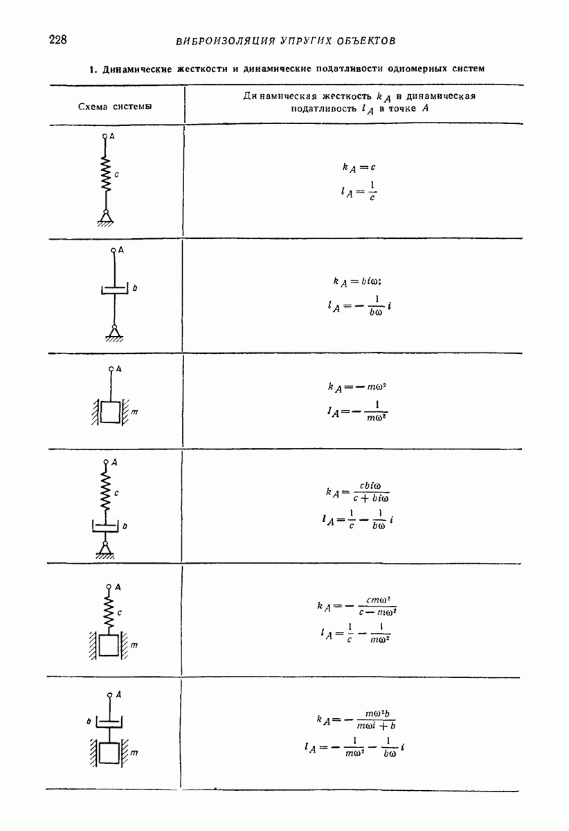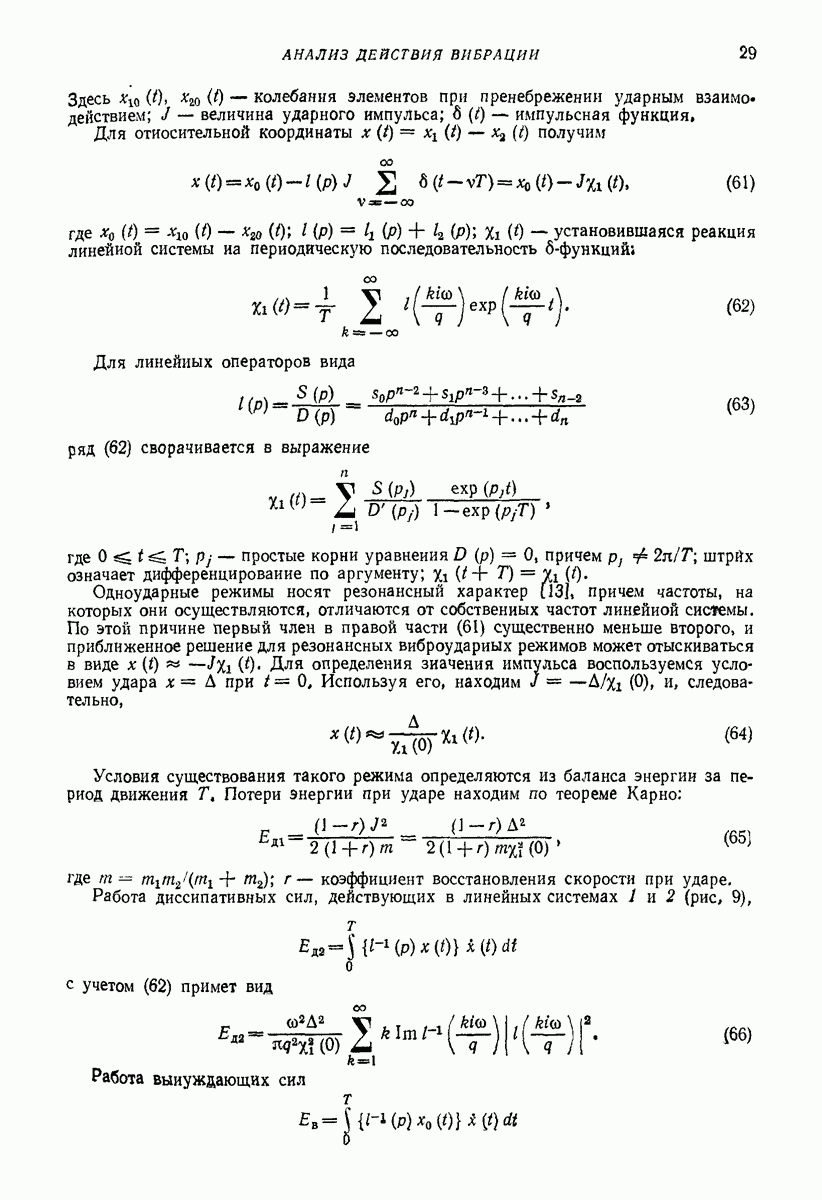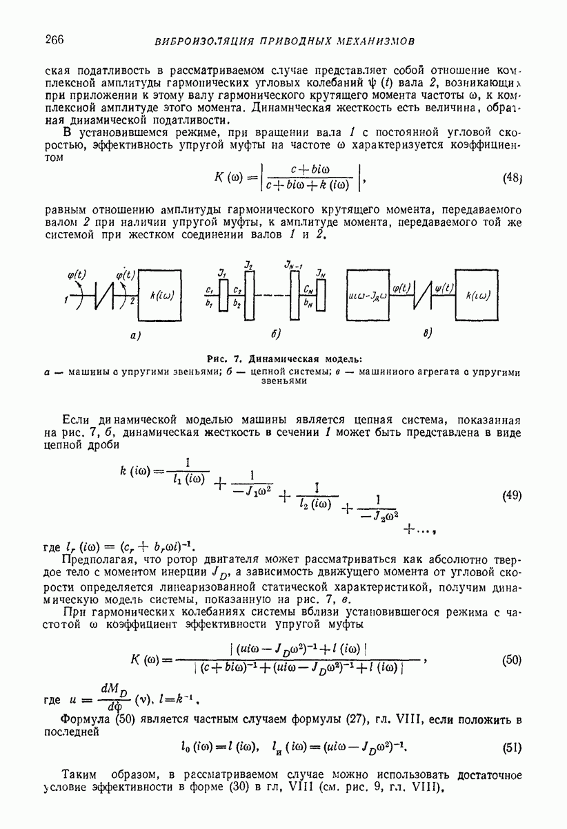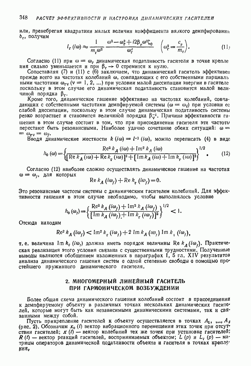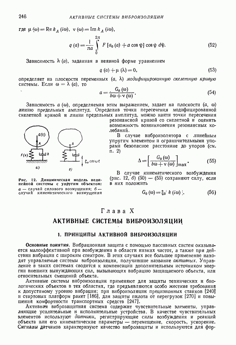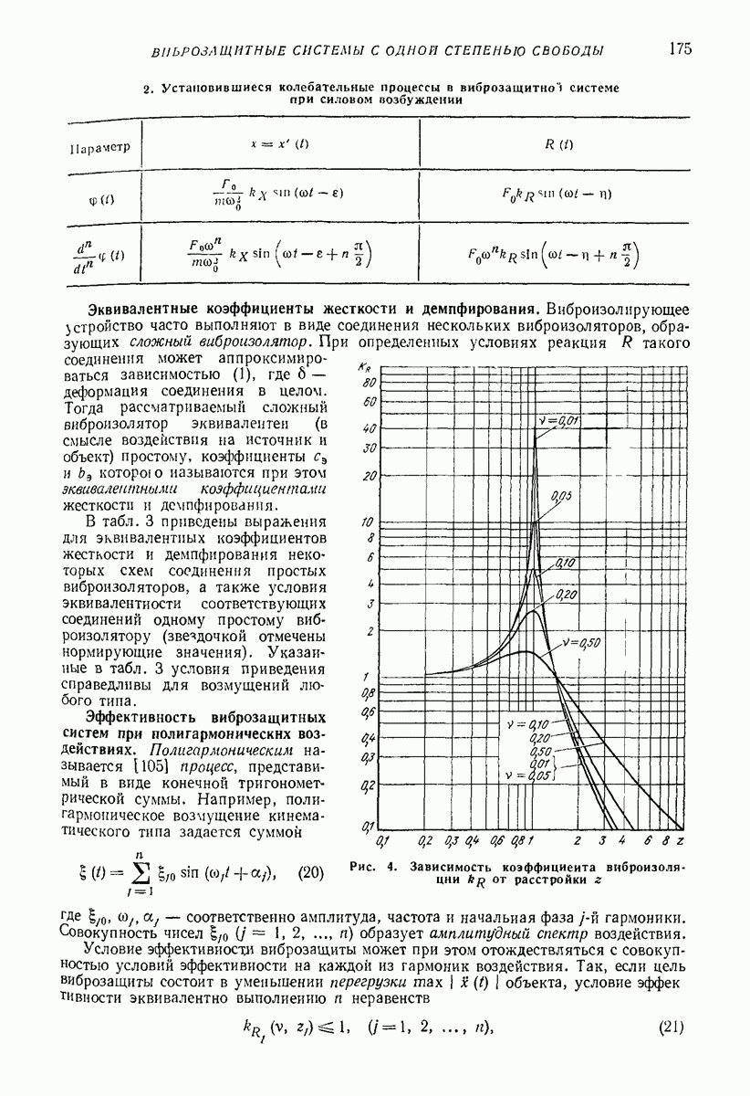 Рис. 13. Схема виброизоляции б) изменением конструкции объекта, при котором заданные механические воздействия будут вызывать менее интенсивные колебания объекта или отдельных его частей; этот метод называется внутренней виброзащитой объекта; в) присоединением к объекту дополнительной механической системы (рис. 12), изменяющей характер его колебаний. Такая система называется динамическим гасителем колебаний, а метод виброзащиты, основанный на ее применении, — динамическим гашением колебаний; г) установкой между объектом и источником дополнительной системы (рис, 13), защищающей объект от механических воздействий, возбуждаемых источником; этот метод виброзащиты называется виброизоляцией, а устройства, устанавливаемые между источником и объектом, — виброизоляторами (термин амортизатор не рекомендуется к применению). Рассмотрим каждый из перечисленных методов. Снижение виброактивности источника. Возбуждение колебаний источниками может быть обусловлено различными причинами. Удобно разделить возмущающие факторы на две группы, К первой можно отнести различные физико-химические процессы, происходящие в источнике: процессы горения в реактивных двигателях и двигателях внутреннего сгорания, процессы взаимодействия жидкости или газа с лопатками турбин (сопровождающиеся такими побочными явлениями, как кавитация), пульсацию жидкости или газа в трубопроводах, электромагнитные явления в двигателях и генераторах, разнообразные технологические процессы (например, процесс резания металлов на металлорежущих стайках, процессы обработки материала в горнообогатительном оборудовании и т. п.). К этой группе относятся и явления, связанные с трением в кинематических парах, которое также служит источником возникновения колебаний. Снижение виброактивности факторов этой группы связано с изменением параметров физико-химических процессов и может быгь достигнуто способами, специфическими для каждого частного случая. Эти способы изложены в т. 3 и 4 справочника при рассмотрении колебаний машин и агрегатов различных классов. Вторая группа возмущающих факторов связана с движущимися телами. Движение тел внутри источника (вращение роторов, перемещение звельев механизмов) сопровождается возникновением динамических реакций связей, соединяющих источник с другими телами, в частности с объектом. Снижение виброактивности источника в этом случае заключается в уменьшении динамических реакций с помощью так называемого уравновешивания движущихся тел. Методы уравновешивания являются, таким образом, способами снижения виброактивности, общими для всех источников, содержащих движущиеся тела Эти методы будут рассмотрены в первой части. При решении задач уравновешивания приходится учитывать динамические свойства источников, и в первую очередь нежесткость их элементов. Изменение конструкции объекта. Проблему уменьшения колебаний объекта путем изменения его конструкции необходимо рассматривать в каждом случае особо, с учетом особенностей объекта и конструктивных возможностей его изменения. Однако можно указать два способа снижения колебаний, общих для всех механических систем. Первый способ состоит в устранении резонансных явлений. Если объект обладает линейными свойствами, то задача сводится к соответствующему изменению его собстве