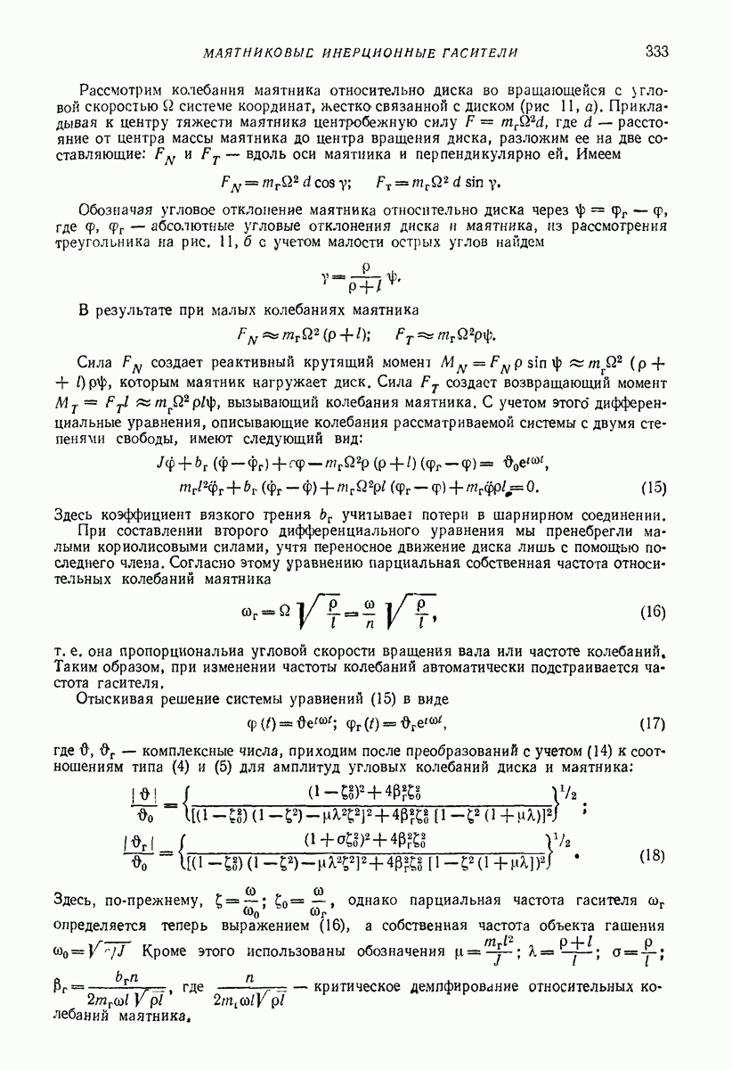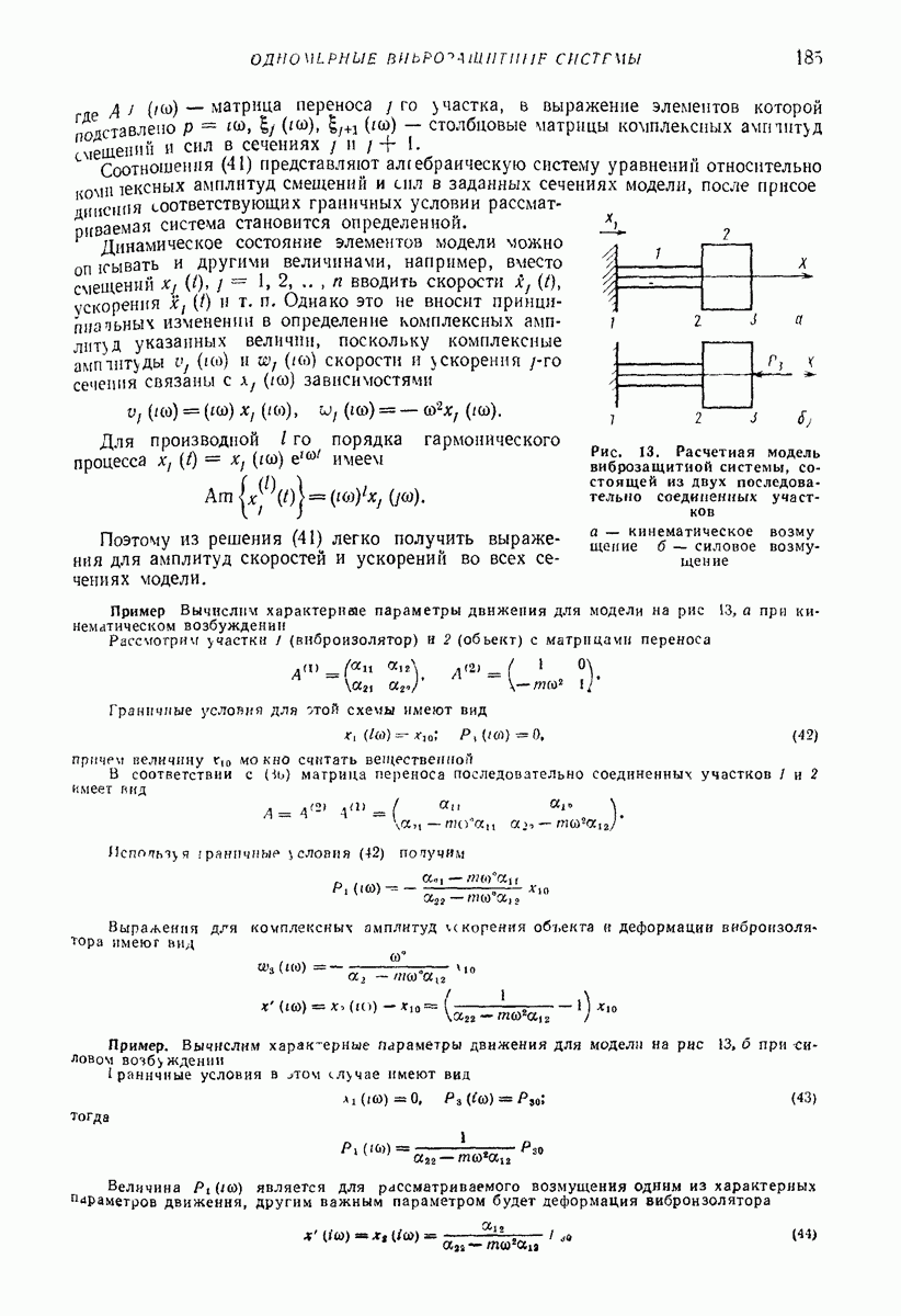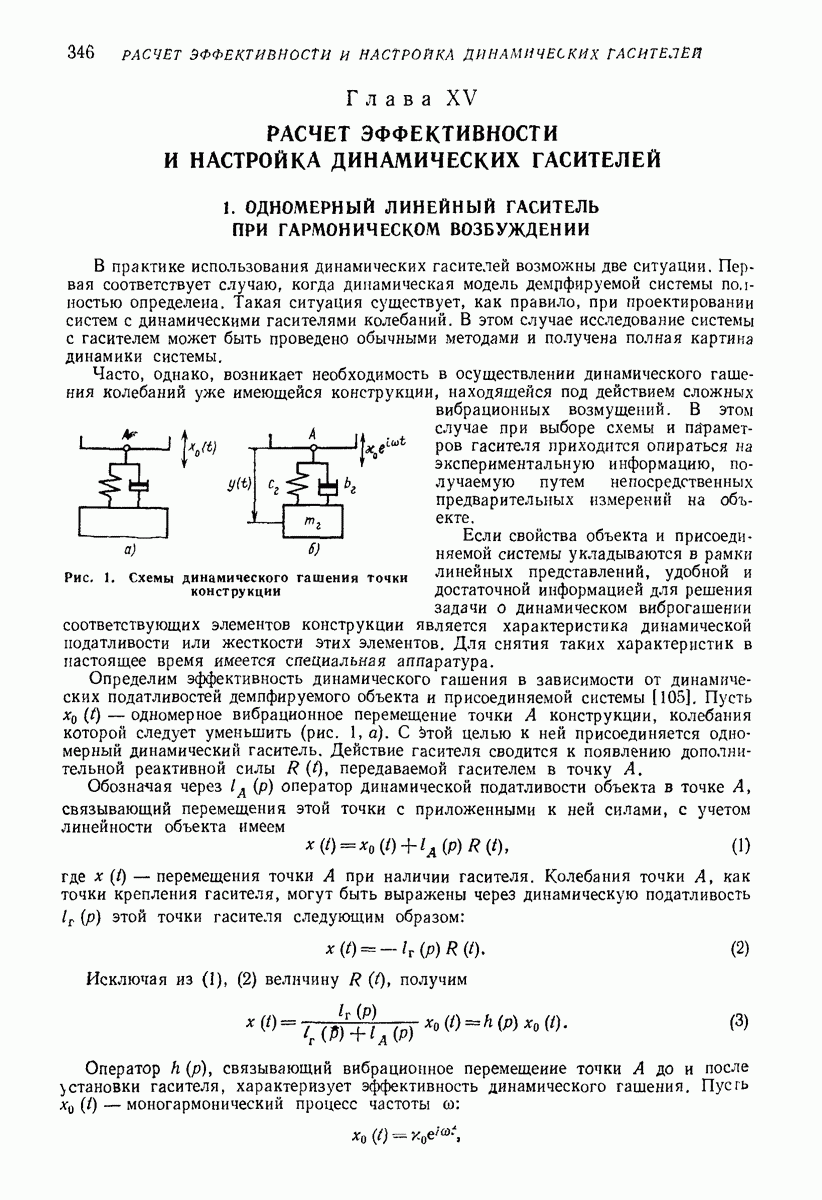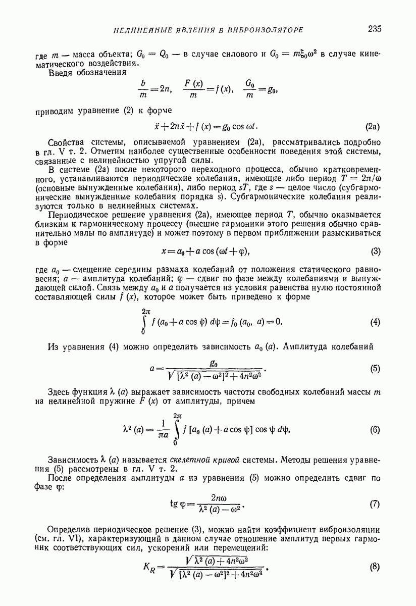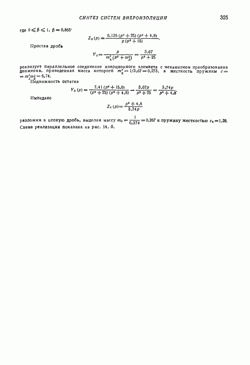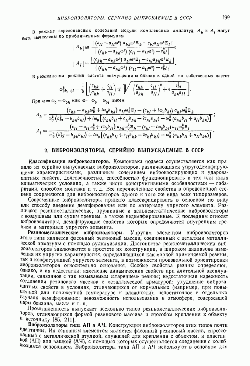Рис. 13. Схема виброизоляции б) изменением конструкции объекта, при котором заданные механические воздействия будут вызывать менее интенсивные колебания объекта или отдельных его частей; этот метод называется внутренней виброзащитой объекта; в) присоединением к объекту дополнительной механической системы (рис. 12), изменяющей характер его колебаний. Такая система называется динамическим гасителем колебаний, а метод виброзащиты, основанный на ее применении, — динамическим гашением колебаний; г) установкой между объектом и источником дополнительной системы (рис, 13), защищающей объект от механических воздействий, возбуждаемых источником; этот метод виброзащиты называется виброизоляцией, а устройства, устанавливаемые между источником и объектом, — виброизоляторами (термин амортизатор не рекомендуется к применению). Рассмотрим каждый из перечисленных методов. Снижение виброактивности источника. Возбуждение колебаний источниками может быть обусловлено различными причинами. Удобно разделить возмущающие факторы на две группы, К первой можно отнести различные физико-химические процессы, происходящие в источнике: процессы горения в реактивных двигателях и двигателях внутреннего сгорания, процессы взаимодействия жидкости или газа с лопатками турбин (сопровождающиеся такими побочными явлениями, как кавитация), пульсацию жидкости или газа в трубопроводах, электромагнитные явления в двигателях и генераторах, разнообразные технологические процессы (например, процесс резания металлов на металлорежущих стайках, процессы обработки материала в горнообогатительном оборудовании и т. п.). К этой группе относятся и явления, связанные с трением в кинематических парах, которое также служит источником возникновения колебаний. Снижение виброактивности факторов этой группы связано с изменением параметров физико-химических процессов и может быгь достигнуто способами, специфическими для каждого частного случая. Эти способы изложены в т. 3 и 4 справочника при рассмотрении колебаний машин и агрегатов различных классов. Вторая группа возмущающих факторов связана с движущимися телами. Движение тел внутри источника (вращение роторов, перемещение звельев механизмов) сопровождается возникновением динамических реакций связей, соединяющих источник с другими телами, в частности с объектом. Снижение виброактивности источника в этом случае заключается в уменьшении динамических реакций с помощью так называемого уравновешивания движущихся тел. Методы уравновешивания являются, таким образом, способами снижения виброактивности, общими для всех источников, содержащих движущиеся тела Эти методы будут рассмотрены в первой части. При решении задач уравновешивания приходится учитывать динамические свойства источников, и в первую очередь нежесткость их элементов. Изменение конструкции объекта. Проблему уменьшения колебаний объекта путем изменения его конструкции необходимо рассматривать в каждом случае особо, с учетом особенностей объекта и конструктивных возможностей его изменения. Однако можно указать два способа снижения колебаний, общих для всех механических систем. Первый способ состоит в устранении резонансных явлений. Если объект обладает линейными свойствами, то задача сводится к соответствующему изменению его собстве