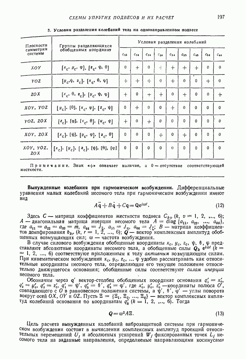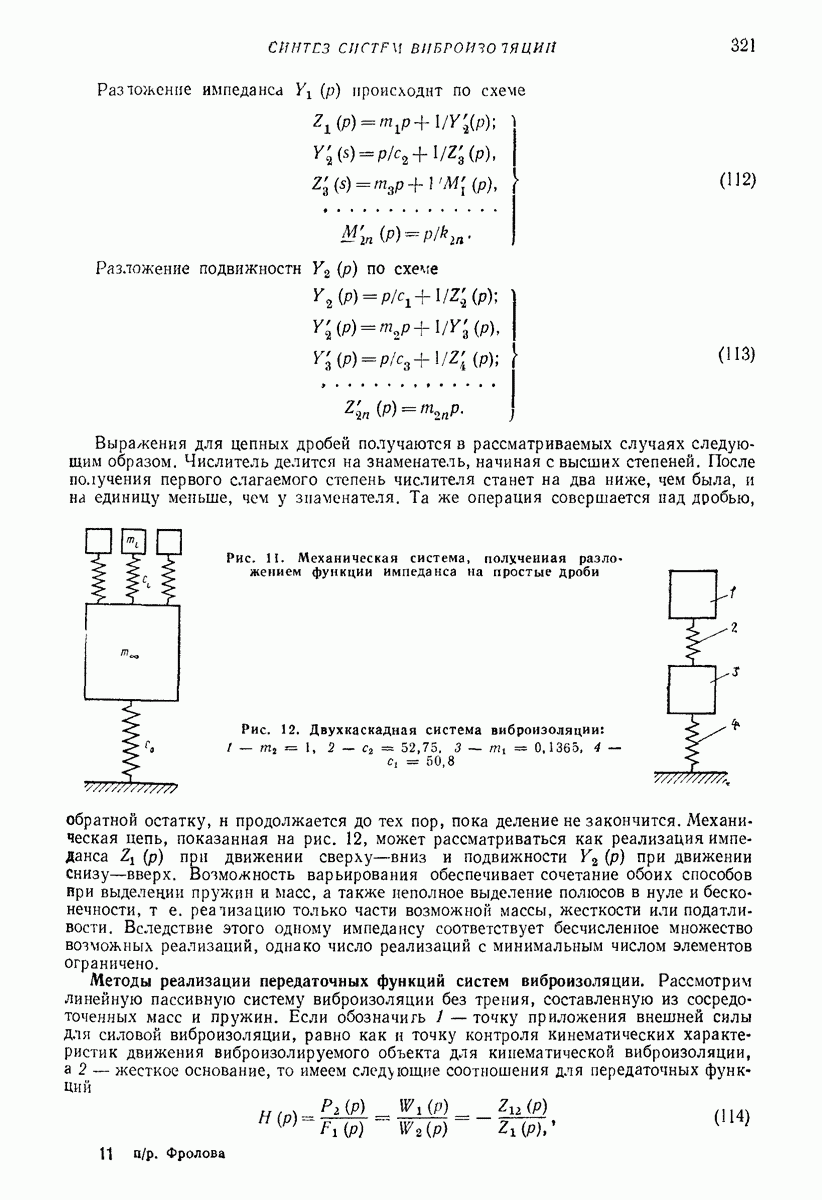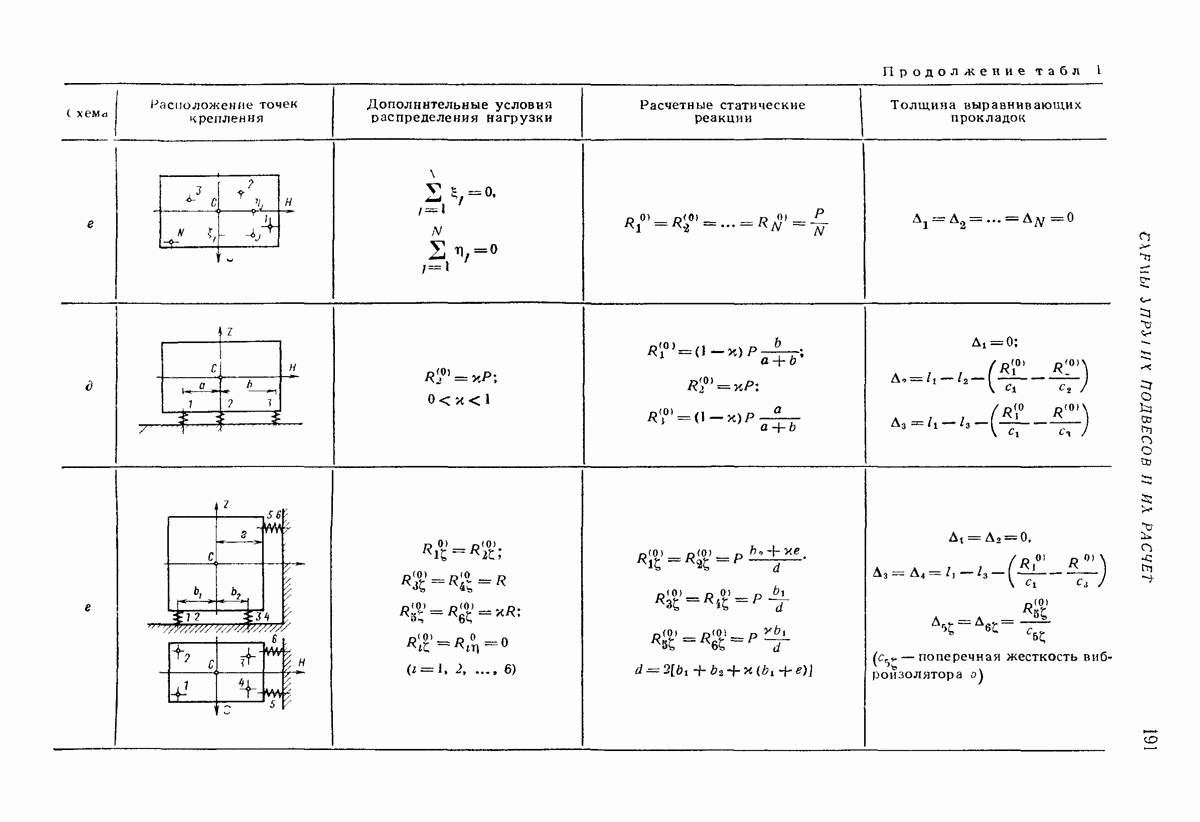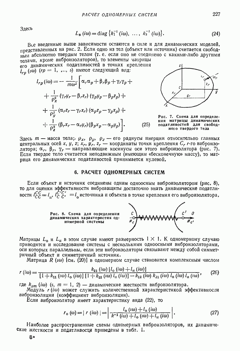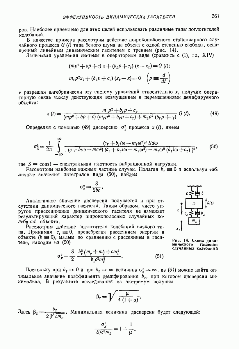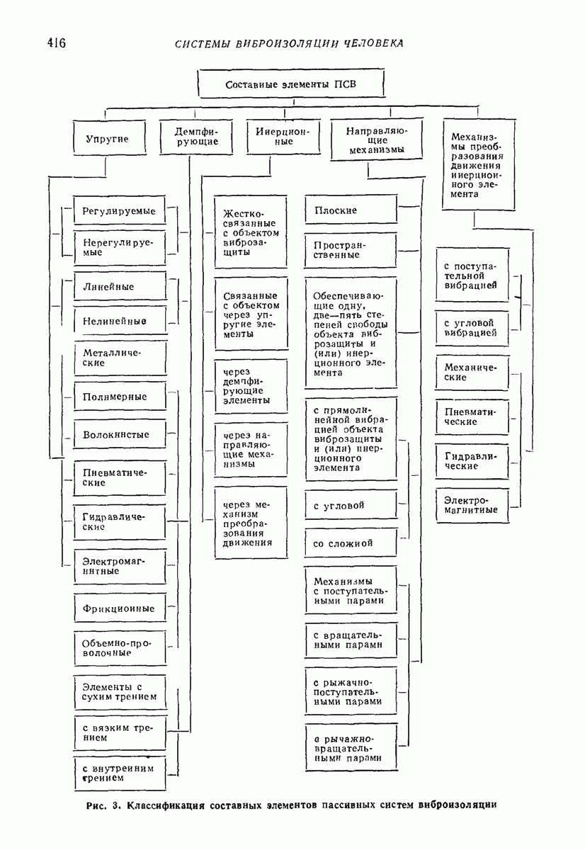 Рис. 13. Схема виброизоляции б) изменением конструкции объекта, при котором заданные механические воздействия будут вызывать менее интенсивные колебания объекта или отдельных его частей; этот метод называется внутренней виброзащитой объекта; в) присоединением к объекту дополнительной механической системы (рис. 12), изменяющей характер его колебаний. Такая система называется динамическим гасителем колебаний, а метод виброзащиты, основанный на ее применении, — динамическим гашением колебаний; г) установкой между объектом и источником дополнительной системы (рис, 13), защищающей объект от механических воздействий, возбуждаемых источником; этот метод виброзащиты называется виброизоляцией, а устройства, устанавливаемые между источником и объектом, — виброизоляторами (термин амортизатор не рекомендуется к применению). Рассмотрим каждый из перечисленных методов. Снижение виброактивности источника. Возбуждение колебаний источниками может быть обусловлено различными причинами. Удобно разделить возмущающие факторы на две группы, К первой можно отнести различные физико-химические процессы, происходящие в источнике: процессы горения в реактивных двигателях и двигателях внутреннего сгорания, процессы взаимодействия жидкости или газа с лопатками турбин (сопровождающиеся такими побочными явлениями, как кавитация), пульсацию жидкости или газа в трубопроводах, электромагнитные явления в двигателях и генераторах, разнообразные технологические процессы (например, процесс резания металлов на металлорежущих стайках, процессы обработки материала в горнообогатительном оборудовании и т. п.). К этой группе относятся и явления, связанные с трением в кинематических парах, которое также служит источником возникновения колебаний. Снижение виброактивности факторов этой группы связано с изменением параметров физико-химических процессов и может быгь достигнуто способами, специфическими для каждого частного случая. Эти способы изложены в т. 3 и 4 справочника при рассмотрении колебаний машин и агрегатов различных классов. Вторая группа возмущающих факторов связана с движущимися телами. Движение тел внутри источника (вращение роторов, перемещение звельев механизмов) сопровождается возникновением динамических реакций связей, соединяющих источник с другими телами, в частности с объектом. Снижение виброактивности источника в этом случае заключается в уменьшении динамических реакций с помощью так называемого уравновешивания движущихся тел. Методы уравновешивания являются, таким образом, способами снижения виброактивности, общими для всех источников, содержащих движущиеся тела Эти методы будут рассмотрены в первой части. При решении задач уравновешивания приходится учитывать динамические свойства источников, и в первую очередь нежесткость их элементов. Изменение конструкции объекта. Проблему уменьшения колебаний объекта путем изменения его конструкции необходимо рассматривать в каждом случае особо, с учетом особенностей объекта и конструктивных возможностей его изменения. Однако можно указать два способа снижения колебаний, общих для всех механических систем. Первый способ состоит в устранении резонансных явлений. Если объект обладает линейными свойствами, то задача сводится к соответствующему изменению его собстве