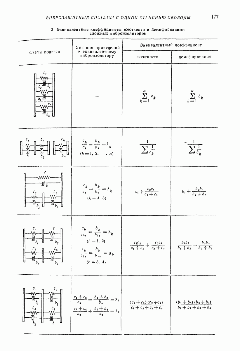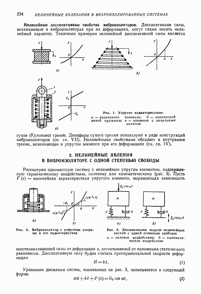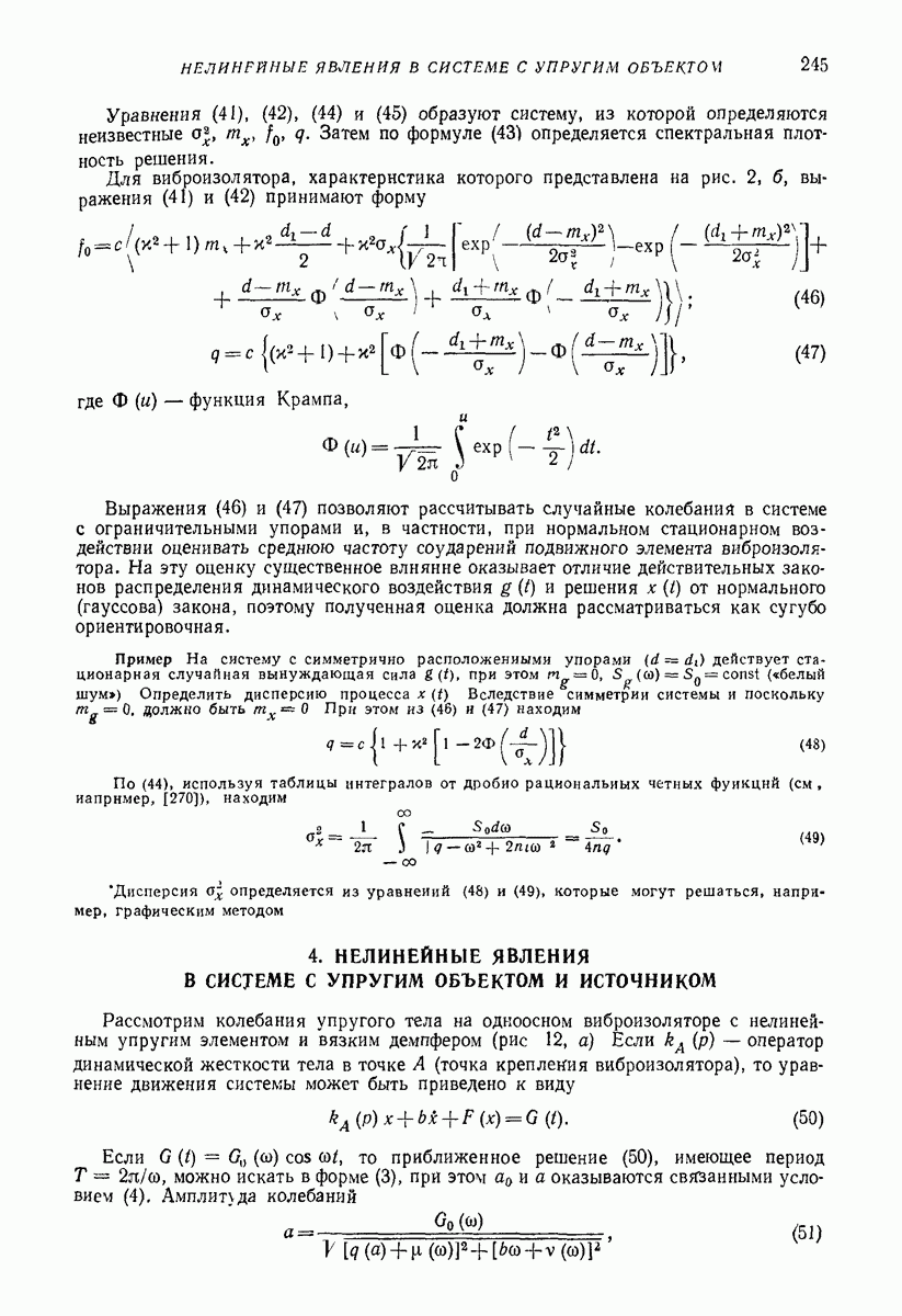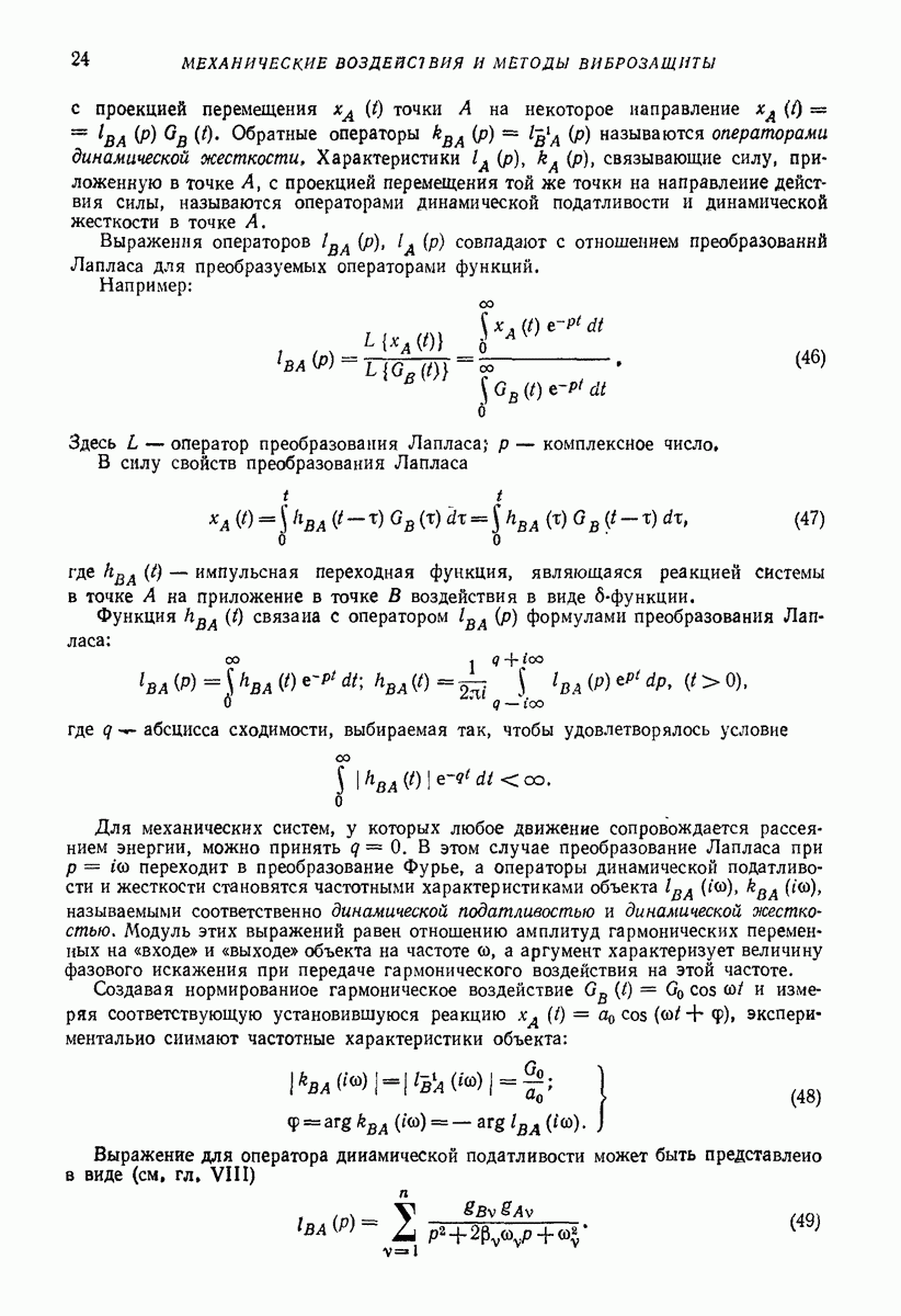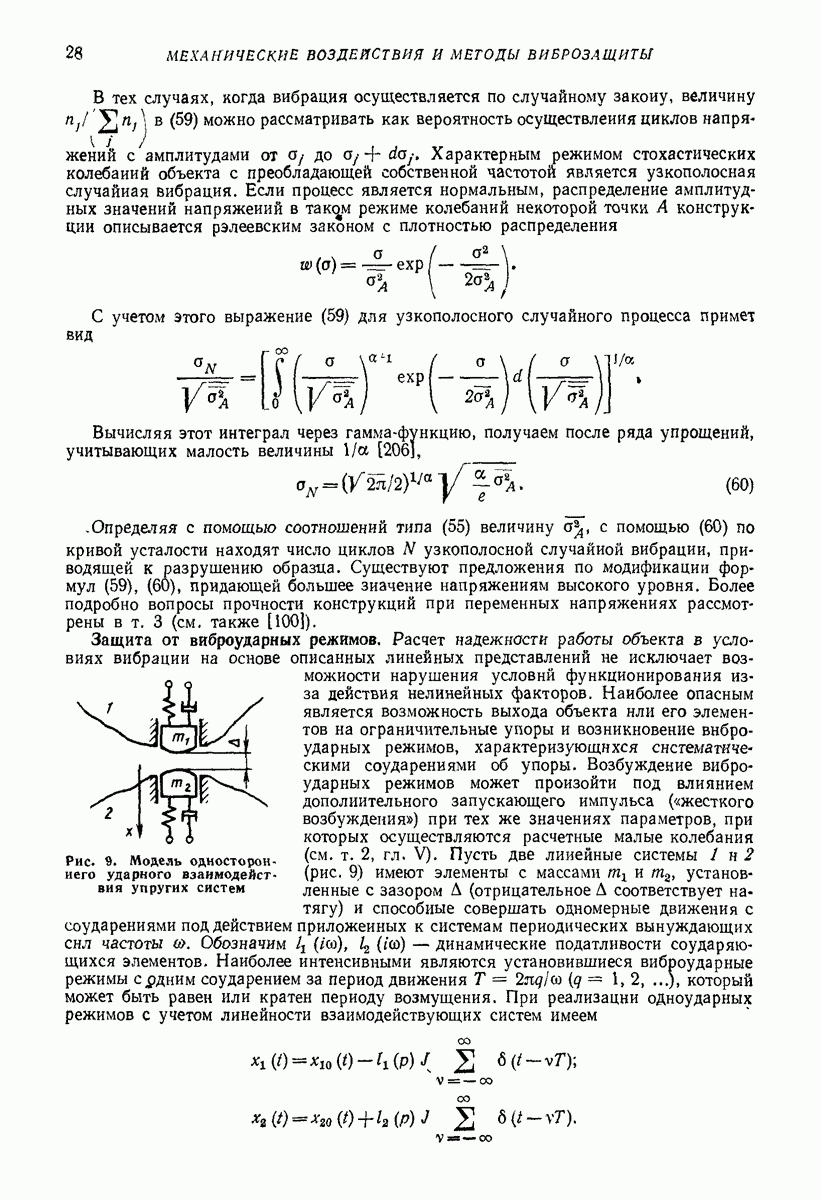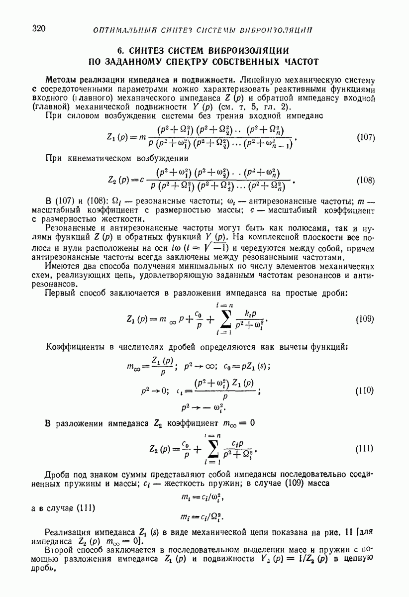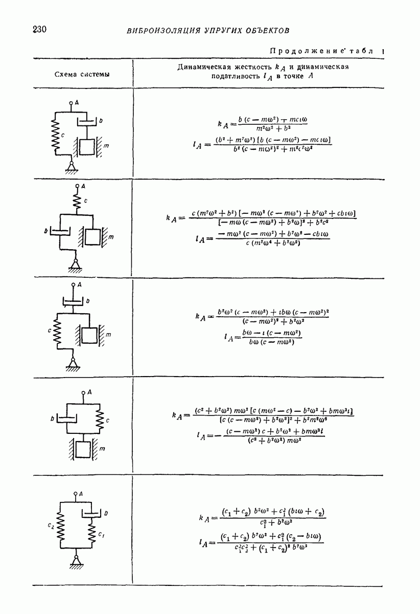 Рис. 13. Схема виброизоляции б) изменением конструкции объекта, при котором заданные механические воздействия будут вызывать менее интенсивные колебания объекта или отдельных его частей; этот метод называется внутренней виброзащитой объекта; в) присоединением к объекту дополнительной механической системы (рис. 12), изменяющей характер его колебаний. Такая система называется динамическим гасителем колебаний, а метод виброзащиты, основанный на ее применении, — динамическим гашением колебаний; г) установкой между объектом и источником дополнительной системы (рис, 13), защищающей объект от механических воздействий, возбуждаемых источником; этот метод виброзащиты называется виброизоляцией, а устройства, устанавливаемые между источником и объектом, — виброизоляторами (термин амортизатор не рекомендуется к применению). Рассмотрим каждый из перечисленных методов. Снижение виброактивности источника. Возбуждение колебаний источниками может быть обусловлено различными причинами. Удобно разделить возмущающие факторы на две группы, К первой можно отнести различные физико-химические процессы, происходящие в источнике: процессы горения в реактивных двигателях и двигателях внутреннего сгорания, процессы взаимодействия жидкости или газа с лопатками турбин (сопровождающиеся такими побочными явлениями, как кавитация), пульсацию жидкости или газа в трубопроводах, электромагнитные явления в двигателях и генераторах, разнообразные технологические процессы (например, процесс резания металлов на металлорежущих стайках, процессы обработки материала в горнообогатительном оборудовании и т. п.). К этой группе относятся и явления, связанные с трением в кинематических парах, которое также служит источником возникновения колебаний. Снижение виброактивности факторов этой группы связано с изменением параметров физико-химических процессов и может быгь достигнуто способами, специфическими для каждого частного случая. Эти способы изложены в т. 3 и 4 справочника при рассмотрении колебаний машин и агрегатов различных классов. Вторая группа возмущающих факторов связана с движущимися телами. Движение тел внутри источника (вращение роторов, перемещение звельев механизмов) сопровождается возникновением динамических реакций связей, соединяющих источник с другими телами, в частности с объектом. Снижение виброактивности источника в этом случае заключается в уменьшении динамических реакций с помощью так называемого уравновешивания движущихся тел. Методы уравновешивания являются, таким образом, способами снижения виброактивности, общими для всех источников, содержащих движущиеся тела Эти методы будут рассмотрены в первой части. При решении задач уравновешивания приходится учитывать динамические свойства источников, и в первую очередь нежесткость их элементов. Изменение конструкции объекта. Проблему уменьшения колебаний объекта путем изменения его конструкции необходимо рассматривать в каждом случае особо, с учетом особенностей объекта и конструктивных возможностей его изменения. Однако можно указать два способа снижения колебаний, общих для всех механических систем. Первый способ состоит в устранении резонансных явлений. Если объект обладает линейными свойствами, то задача сводится к соответствующему изменению его собстве