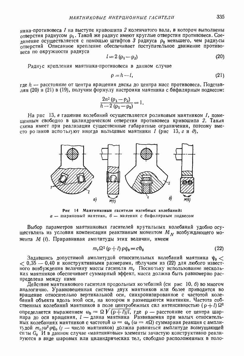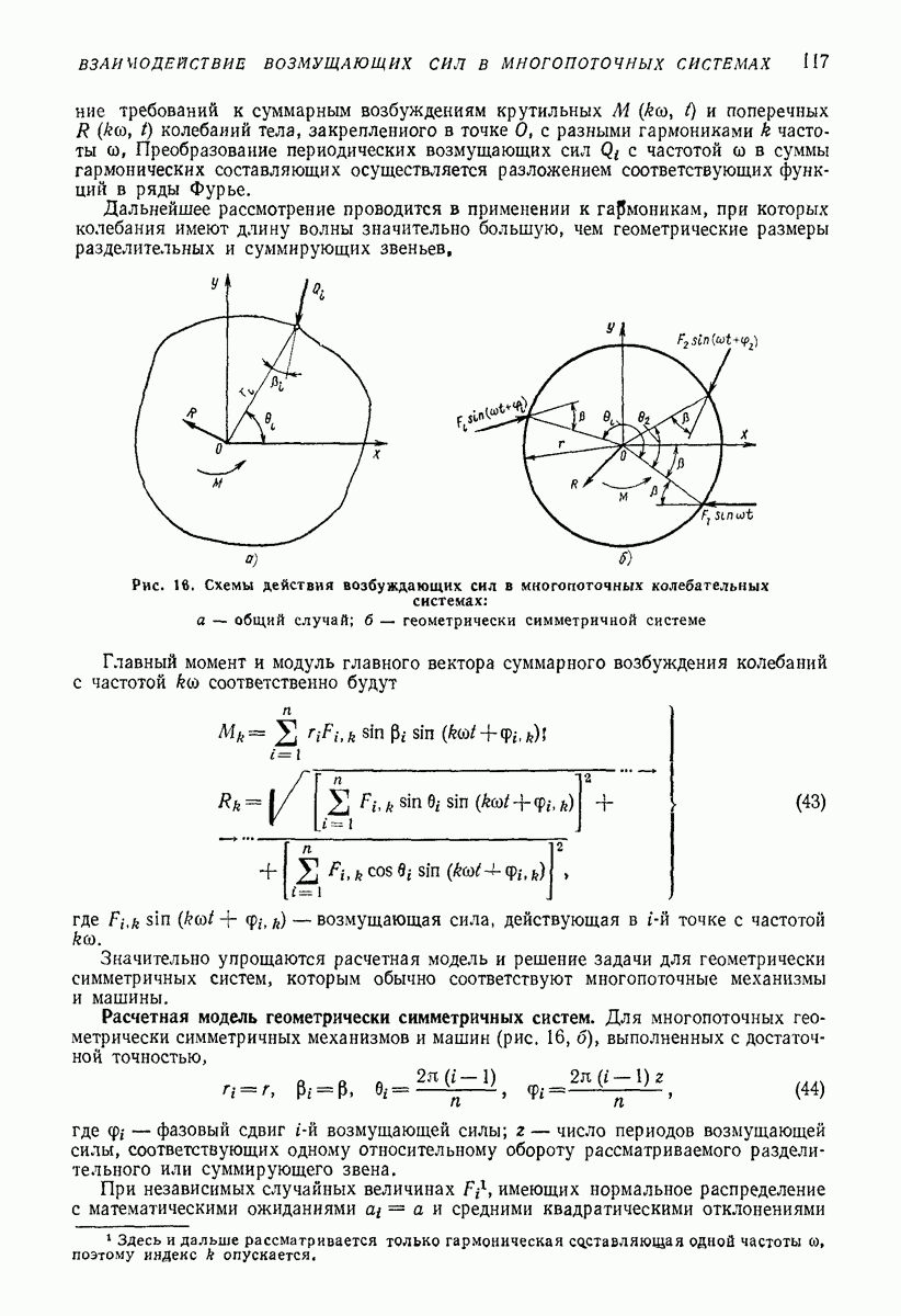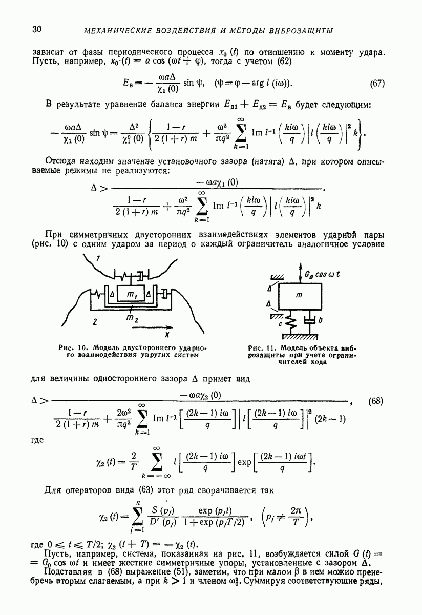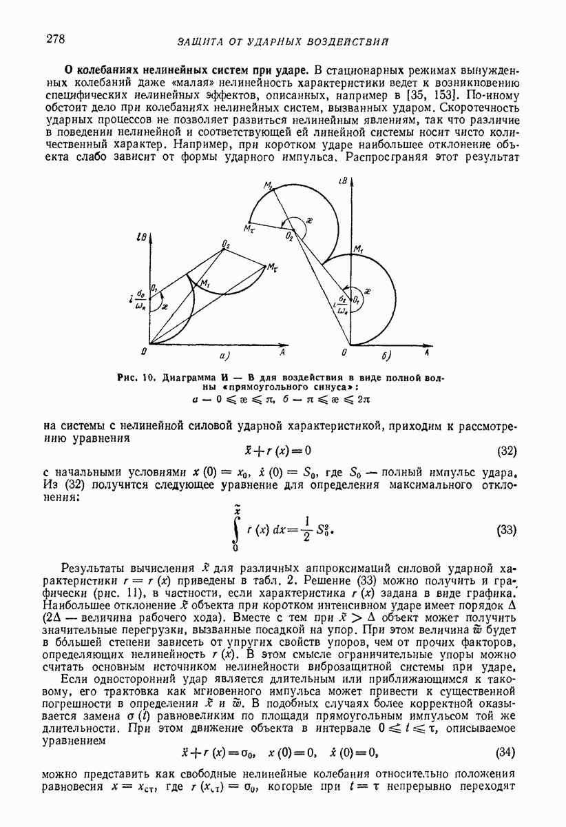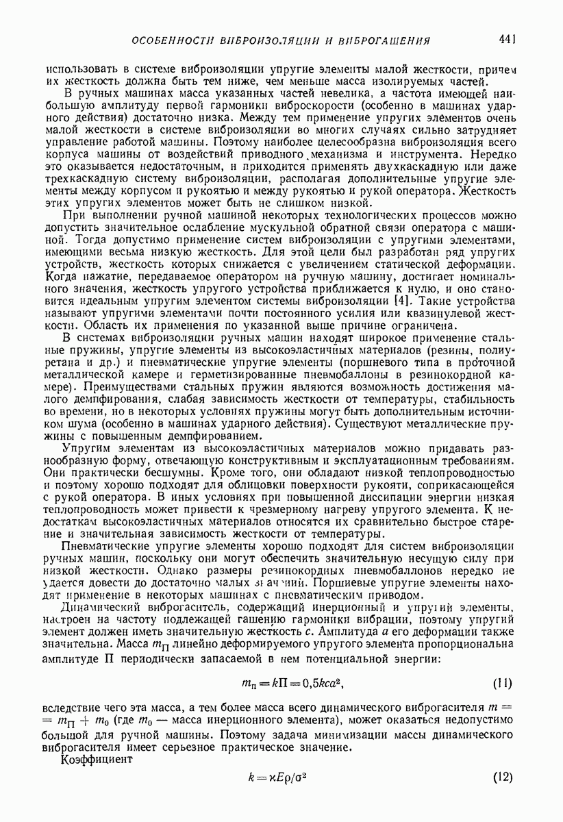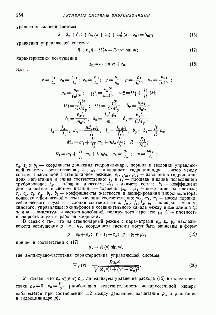 Рис. 13. Схема виброизоляции б) изменением конструкции объекта, при котором заданные механические воздействия будут вызывать менее интенсивные колебания объекта или отдельных его частей; этот метод называется внутренней виброзащитой объекта; в) присоединением к объекту дополнительной механической системы (рис. 12), изменяющей характер его колебаний. Такая система называется динамическим гасителем колебаний, а метод виброзащиты, основанный на ее применении, — динамическим гашением колебаний; г) установкой между объектом и источником дополнительной системы (рис, 13), защищающей объект от механических воздействий, возбуждаемых источником; этот метод виброзащиты называется виброизоляцией, а устройства, устанавливаемые между источником и объектом, — виброизоляторами (термин амортизатор не рекомендуется к применению). Рассмотрим каждый из перечисленных методов. Снижение виброактивности источника. Возбуждение колебаний источниками может быть обусловлено различными причинами. Удобно разделить возмущающие факторы на две группы, К первой можно отнести различные физико-химические процессы, происходящие в источнике: процессы горения в реактивных двигателях и двигателях внутреннего сгорания, процессы взаимодействия жидкости или газа с лопатками турбин (сопровождающиеся такими побочными явлениями, как кавитация), пульсацию жидкости или газа в трубопроводах, электромагнитные явления в двигателях и генераторах, разнообразные технологические процессы (например, процесс резания металлов на металлорежущих стайках, процессы обработки материала в горнообогатительном оборудовании и т. п.). К этой группе относятся и явления, связанные с трением в кинематических парах, которое также служит источником возникновения колебаний. Снижение виброактивности факторов этой группы связано с изменением параметров физико-химических процессов и может быгь достигнуто способами, специфическими для каждого частного случая. Эти способы изложены в т. 3 и 4 справочника при рассмотрении колебаний машин и агрегатов различных классов. Вторая группа возмущающих факторов связана с движущимися телами. Движение тел внутри источника (вращение роторов, перемещение звельев механизмов) сопровождается возникновением динамических реакций связей, соединяющих источник с другими телами, в частности с объектом. Снижение виброактивности источника в этом случае заключается в уменьшении динамических реакций с помощью так называемого уравновешивания движущихся тел. Методы уравновешивания являются, таким образом, способами снижения виброактивности, общими для всех источников, содержащих движущиеся тела Эти методы будут рассмотрены в первой части. При решении задач уравновешивания приходится учитывать динамические свойства источников, и в первую очередь нежесткость их элементов. Изменение конструкции объекта. Проблему уменьшения колебаний объекта путем изменения его конструкции необходимо рассматривать в каждом случае особо, с учетом особенностей объекта и конструктивных возможностей его изменения. Однако можно указать два способа снижения колебаний, общих для всех механических систем. Первый способ состоит в устранении резонансных явлений. Если объект обладает линейными свойствами, то задача сводится к соответствующему изменению его собстве