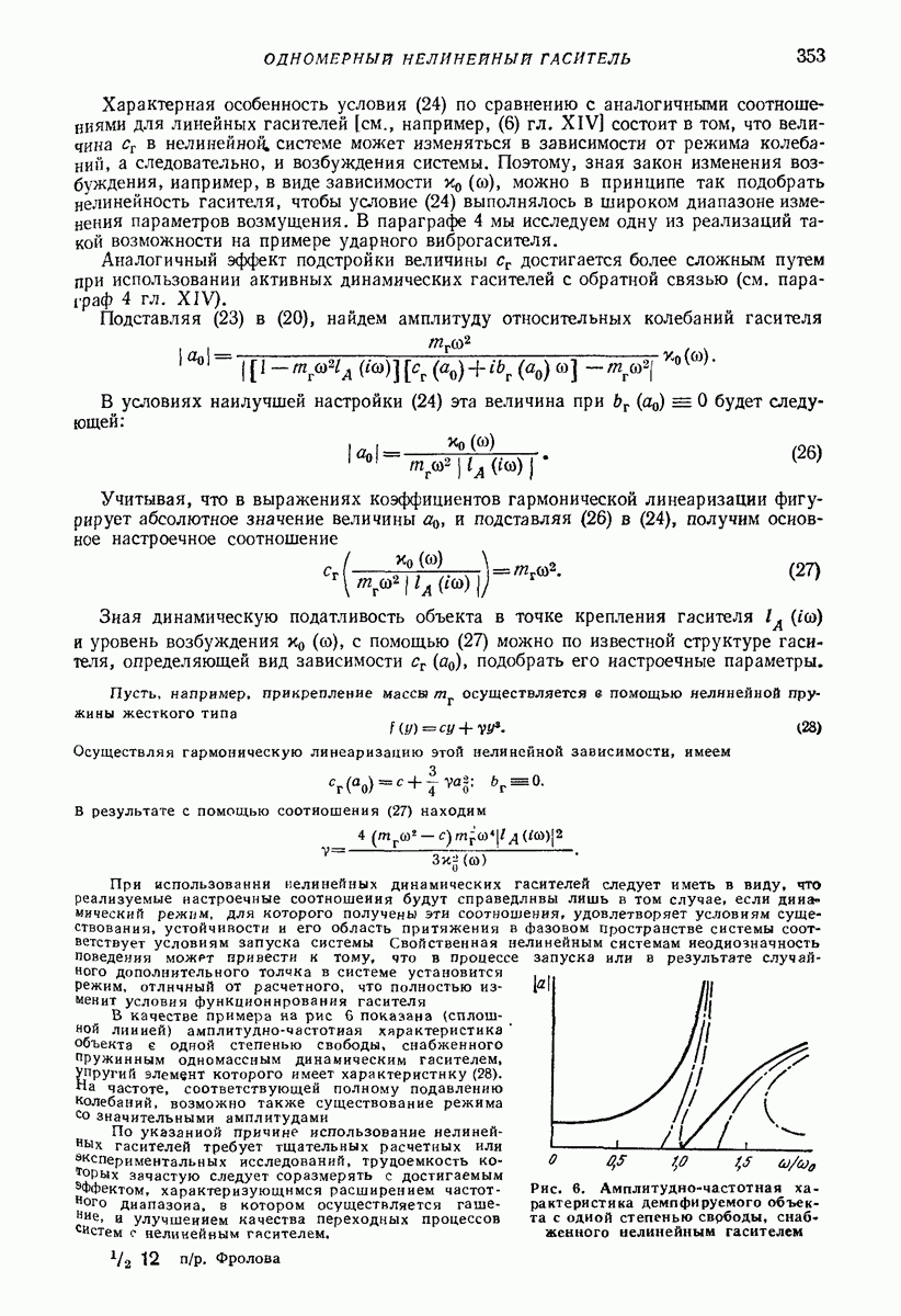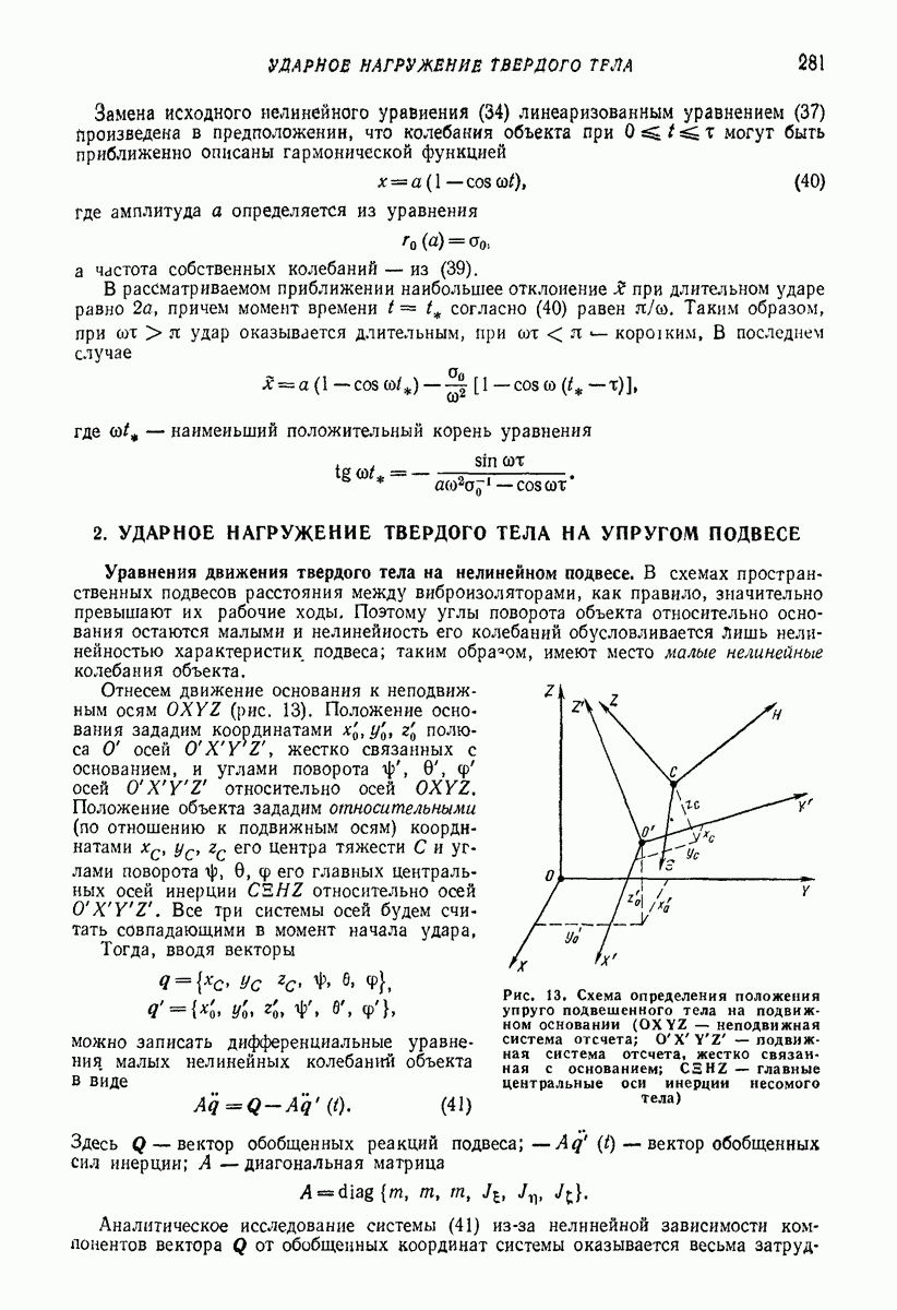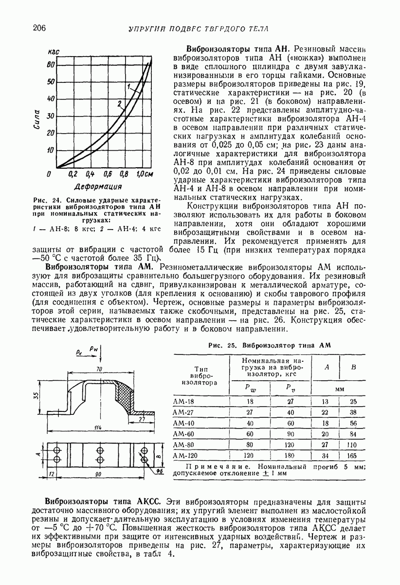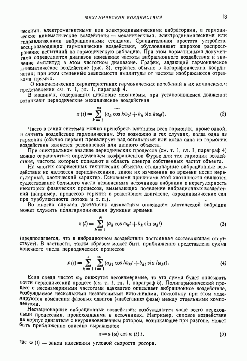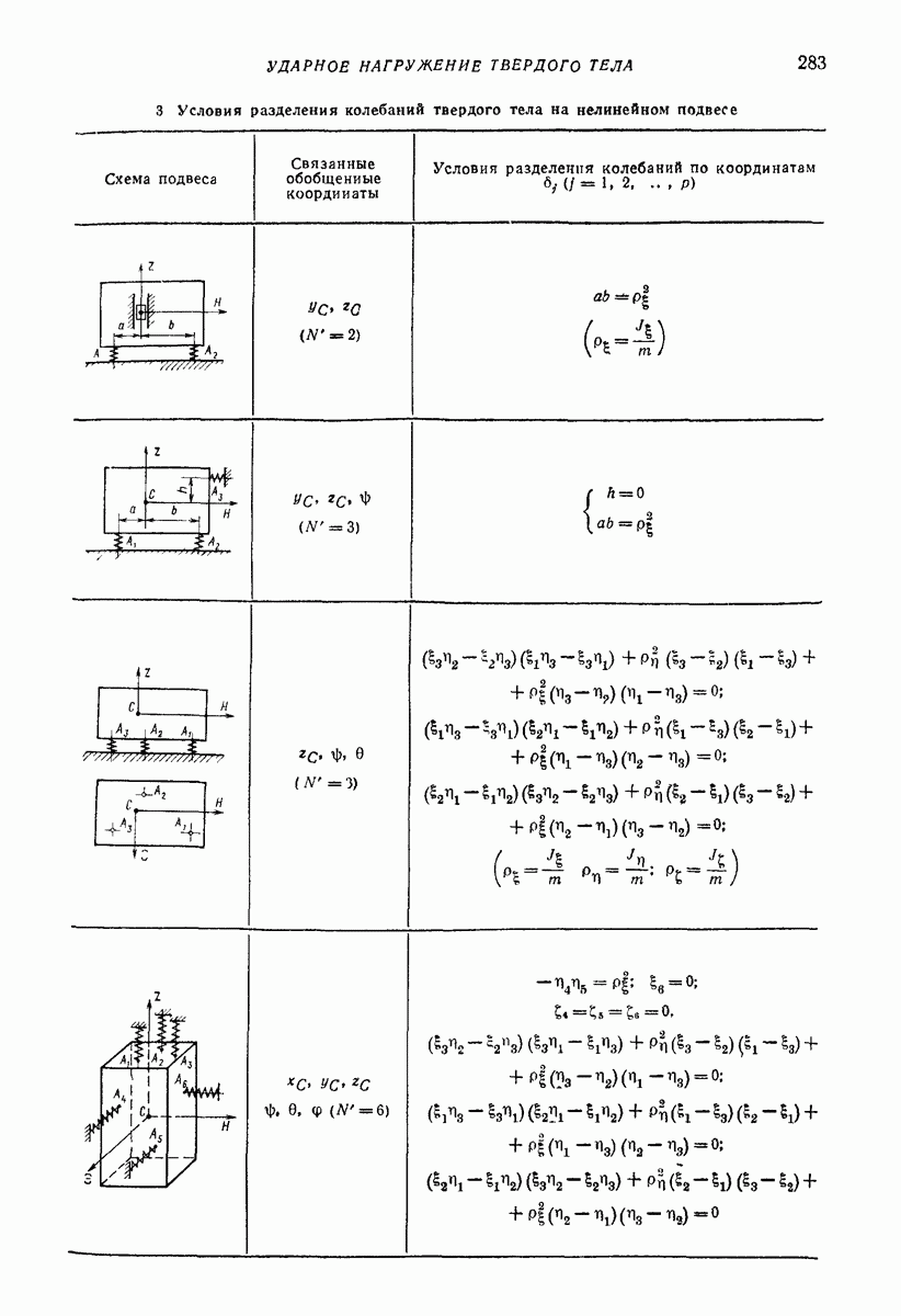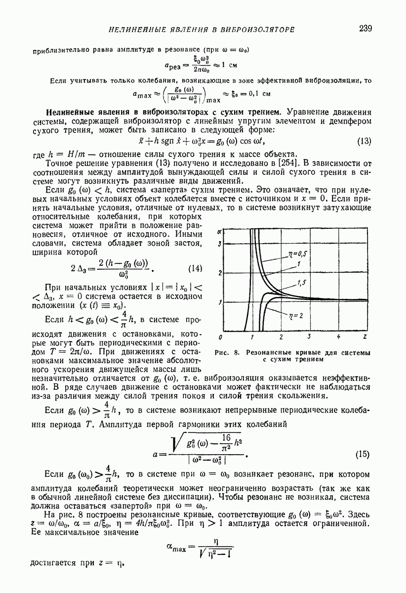 Рис. 13. Схема виброизоляции б) изменением конструкции объекта, при котором заданные механические воздействия будут вызывать менее интенсивные колебания объекта или отдельных его частей; этот метод называется внутренней виброзащитой объекта; в) присоединением к объекту дополнительной механической системы (рис. 12), изменяющей характер его колебаний. Такая система называется динамическим гасителем колебаний, а метод виброзащиты, основанный на ее применении, — динамическим гашением колебаний; г) установкой между объектом и источником дополнительной системы (рис, 13), защищающей объект от механических воздействий, возбуждаемых источником; этот метод виброзащиты называется виброизоляцией, а устройства, устанавливаемые между источником и объектом, — виброизоляторами (термин амортизатор не рекомендуется к применению). Рассмотрим каждый из перечисленных методов. Снижение виброактивности источника. Возбуждение колебаний источниками может быть обусловлено различными причинами. Удобно разделить возмущающие факторы на две группы, К первой можно отнести различные физико-химические процессы, происходящие в источнике: процессы горения в реактивных двигателях и двигателях внутреннего сгорания, процессы взаимодействия жидкости или газа с лопатками турбин (сопровождающиеся такими побочными явлениями, как кавитация), пульсацию жидкости или газа в трубопроводах, электромагнитные явления в двигателях и генераторах, разнообразные технологические процессы (например, процесс резания металлов на металлорежущих стайках, процессы обработки материала в горнообогатительном оборудовании и т. п.). К этой группе относятся и явления, связанные с трением в кинематических парах, которое также служит источником возникновения колебаний. Снижение виброактивности факторов этой группы связано с изменением параметров физико-химических процессов и может быгь достигнуто способами, специфическими для каждого частного случая. Эти способы изложены в т. 3 и 4 справочника при рассмотрении колебаний машин и агрегатов различных классов. Вторая группа возмущающих факторов связана с движущимися телами. Движение тел внутри источника (вращение роторов, перемещение звельев механизмов) сопровождается возникновением динамических реакций связей, соединяющих источник с другими телами, в частности с объектом. Снижение виброактивности источника в этом случае заключается в уменьшении динамических реакций с помощью так называемого уравновешивания движущихся тел. Методы уравновешивания являются, таким образом, способами снижения виброактивности, общими для всех источников, содержащих движущиеся тела Эти методы будут рассмотрены в первой части. При решении задач уравновешивания приходится учитывать динамические свойства источников, и в первую очередь нежесткость их элементов. Изменение конструкции объекта. Проблему уменьшения колебаний объекта путем изменения его конструкции необходимо рассматривать в каждом случае особо, с учетом особенностей объекта и конструктивных возможностей его изменения. Однако можно указать два способа снижения колебаний, общих для всех механических систем. Первый способ состоит в устранении резонансных явлений. Если объект обладает линейными свойствами, то задача сводится к соответствующему изменению его собстве
