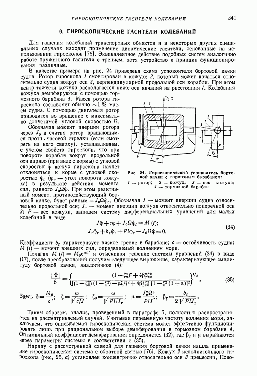 6. ГИРОСКОПИЧЕСКИЕ ГАСИТЕЛИ КОЛЕБАНИЙДля гашения колебаний транспортных объектов и в некоторых других специальных случаях находят применение динамические гасители, основанные на использовании гироскопов [76]. Эквивалентное действие подобных систем аналогично работе пружинного гасителя с трением, хотя устройство и принцип функционирования различные. В качестве примера на рис. 24 приведена схема успокоителя бортовой качки судов. Ротор гироскопа 1 смонтирован в кожухе 2, который может качаться относительно судна вокруг оси 3, перпендикулярной продольной оси корабля. При этом центр тяжести кожуха располагается ниже оси качаний на расстоянии