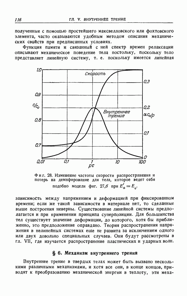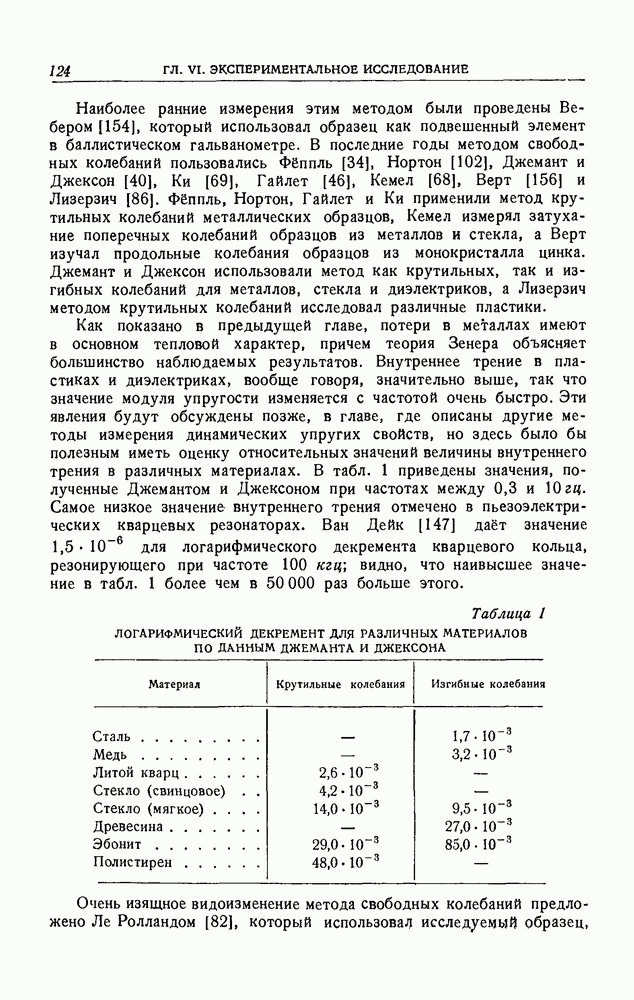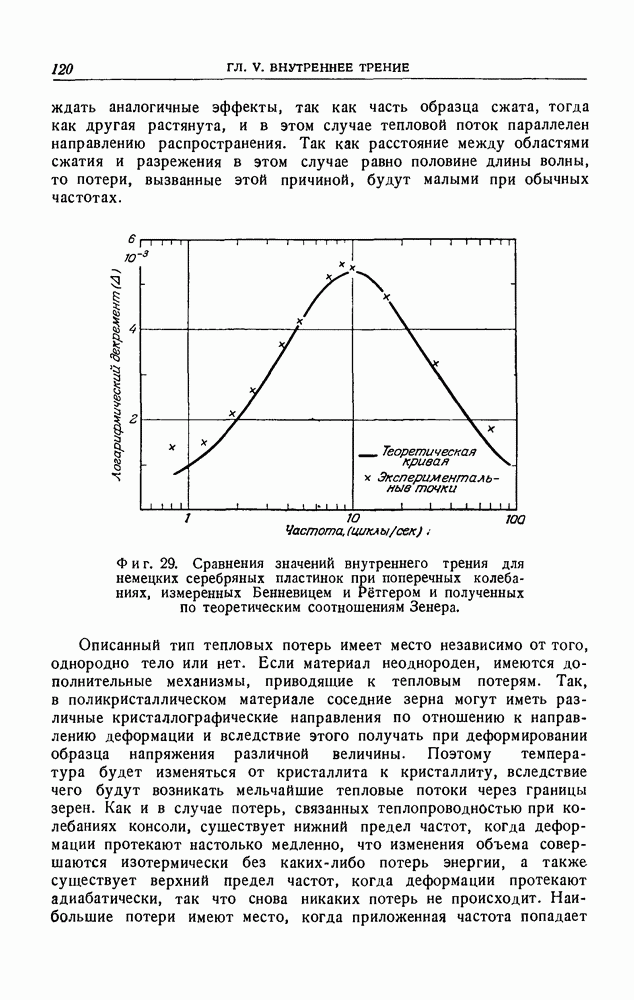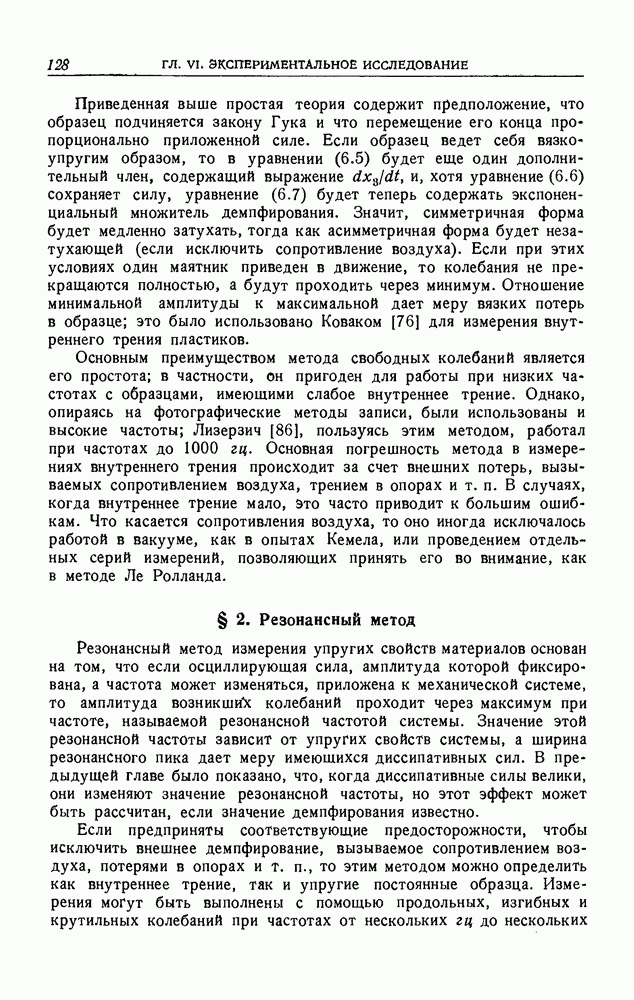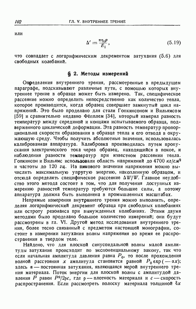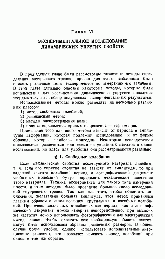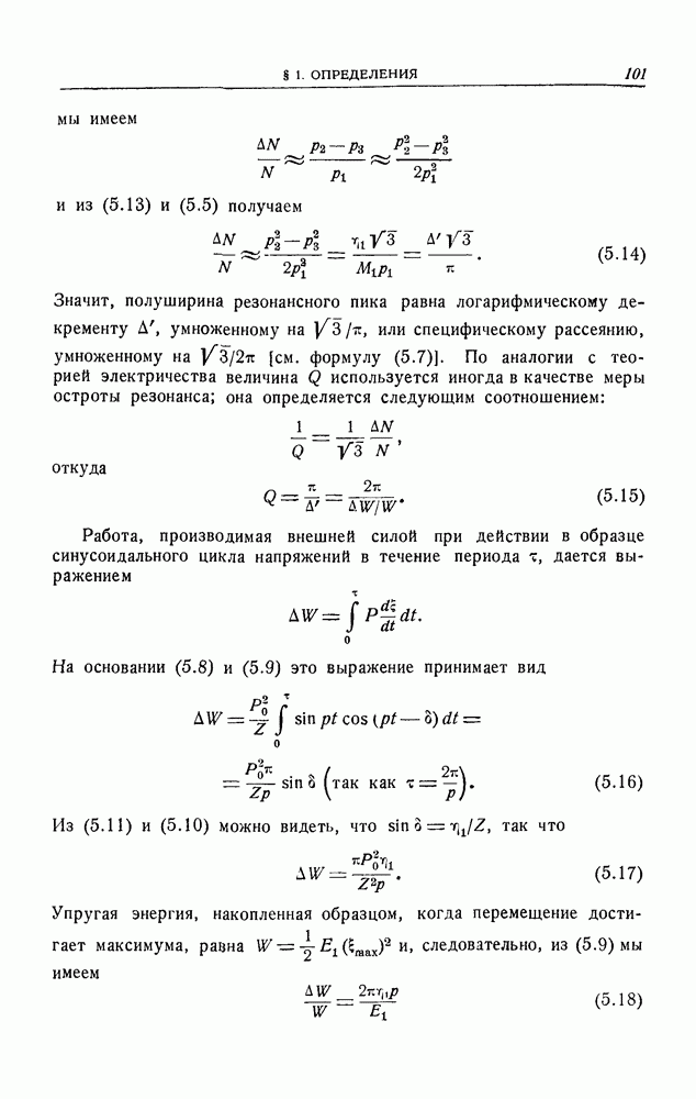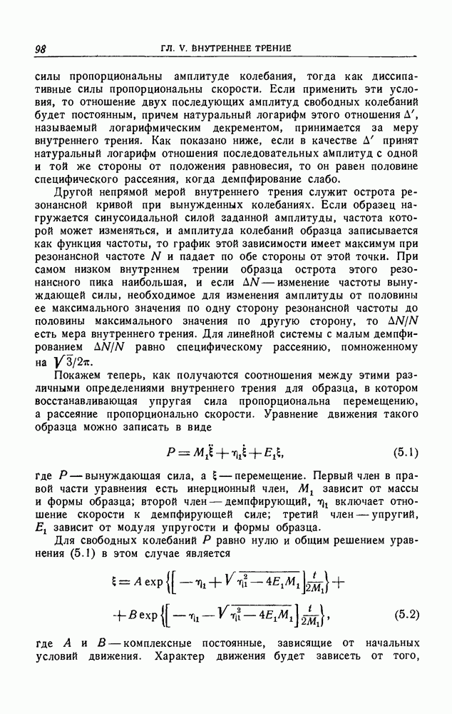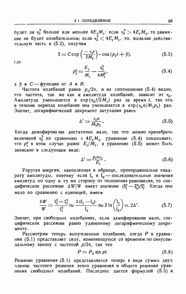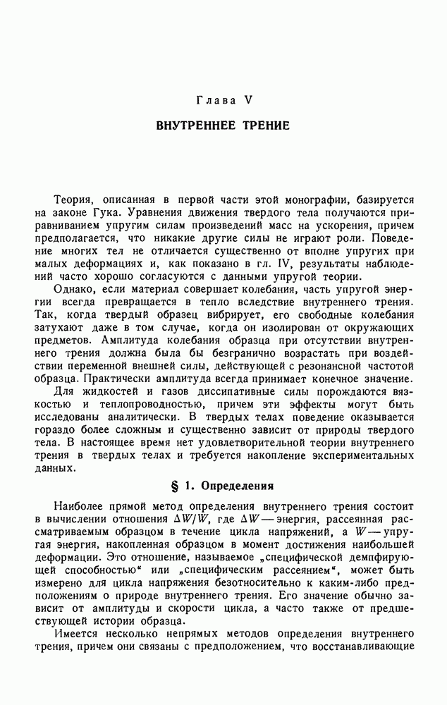Глава V. ВНУТРЕННЕЕ ТРЕНИЕТеория, описанная в первой части этой монографии, базируется на законе Гука. Уравнения движения твердого тела получаются приравниванием упругим силам произведений масс на ускорения, причем предполагается, что никакие другие силы не играют роли. Поведение многих тел не отличается существенно от вполне упругих при малых деформациях и, как показано в гл. IV, результаты наблюдений часто хорошо согласуются с данными упругой теории. Однако, если материал совершает колебания, часть упругой энергии всегда превращается в тепло вследствие внутреннего трения. Так, когда твердый образец вибрирует, его свободные колебания затухают даже в том случае, когда он изолирован от окружающих предметов. Амплитуда колебания образца при отсутствии внутреннего трения должна была бы безгранично возрастать при воздействии переменной внешней силы, действующей с резонансной частотой образца. Практически амплитуда всегда принимает конечное значение. Для жидкостей и газов диссипативные силы порождаются вязкостью и теплопроводностью, причем эти эффекты могут быть исследованы аналитически. В твердых телах поведение оказывается гораздо более сложным и существенно зависит от природы твердого тела. В настоящее время нет удовлетворительной теории внутреннего трения в твердых телах и требуется накопление экспериментальных данных. § 1. ОпределенияНаиболее прямой метод определения внутреннего трения состоит в вычислении отношения Имеется несколько непрямых методов определения внутреннего трения, причем они связаны с предположением, что восстанавливающие силы пропорциональны амплитуде колебания, тогда как диссипа-тивные силы пропорциональны скорости. Если применить эти условия, то отношение двух последующих амплитуд свободных колебаний будет постоянным, причем натуральный логарифм этого отношения Другой непрямой мерой внутреннего трения служит острота резонансной кривой при вынужденных колебаниях. Если образец нагружается синусоидальной силой заданной амплитуды, частота которой может изменяться, и амплитуда колебаний образца записывается как функция частоты, то график этой зависимости имеет максимум при резонансной частоте Покажем теперь, как получаются соотношения между этими различными определениями внутреннего трения для образца, в котором восстанавливающая упругая сила пропорциональна перемещению, а рассеяние пропорционально скорости. Уравнение движения такого образца можно записать в виде