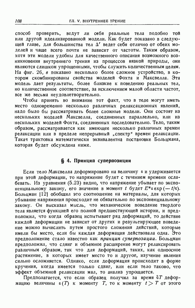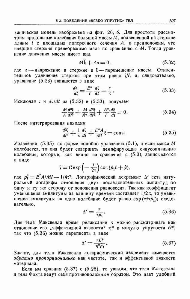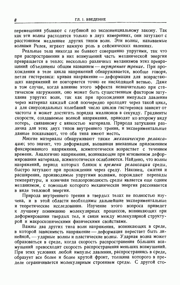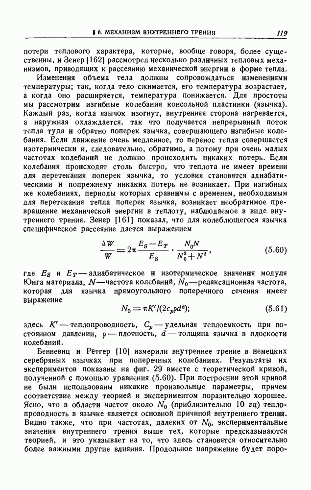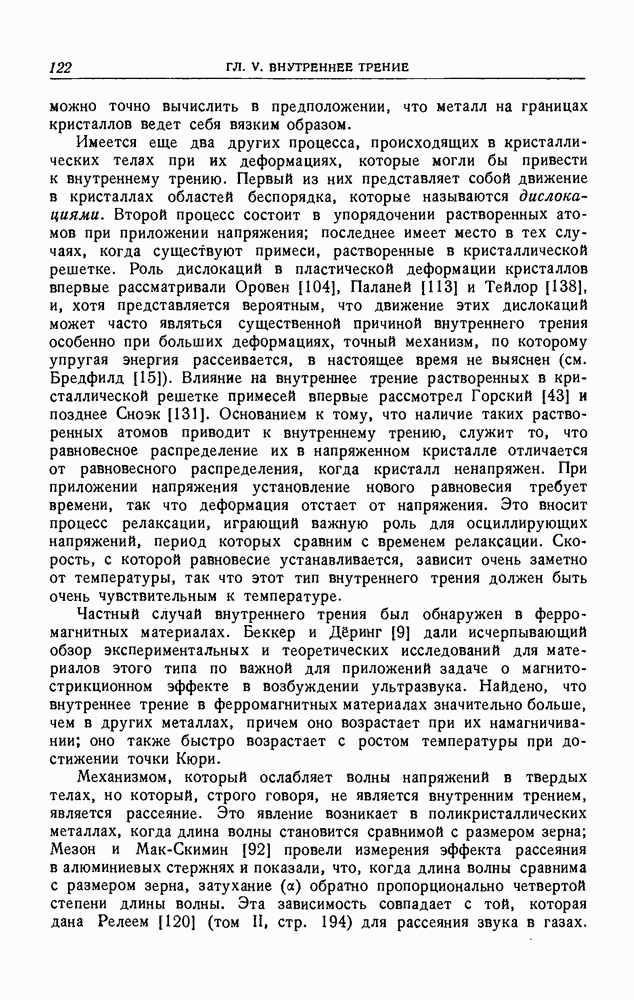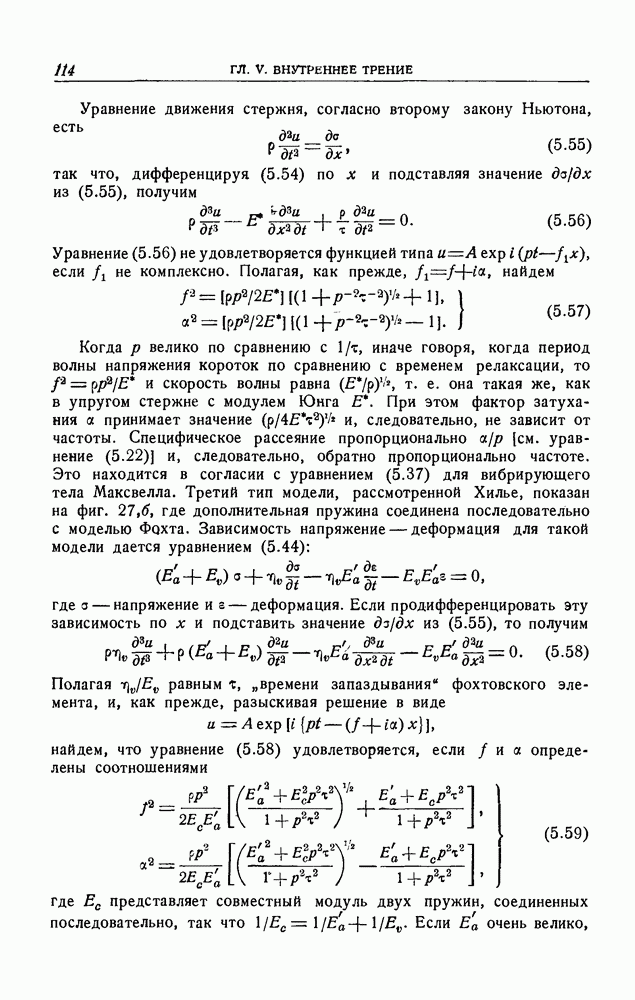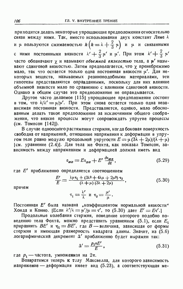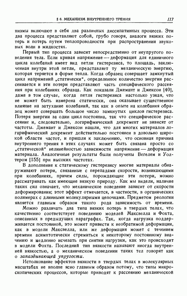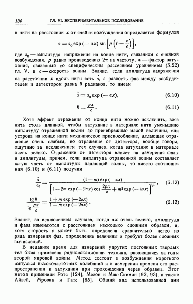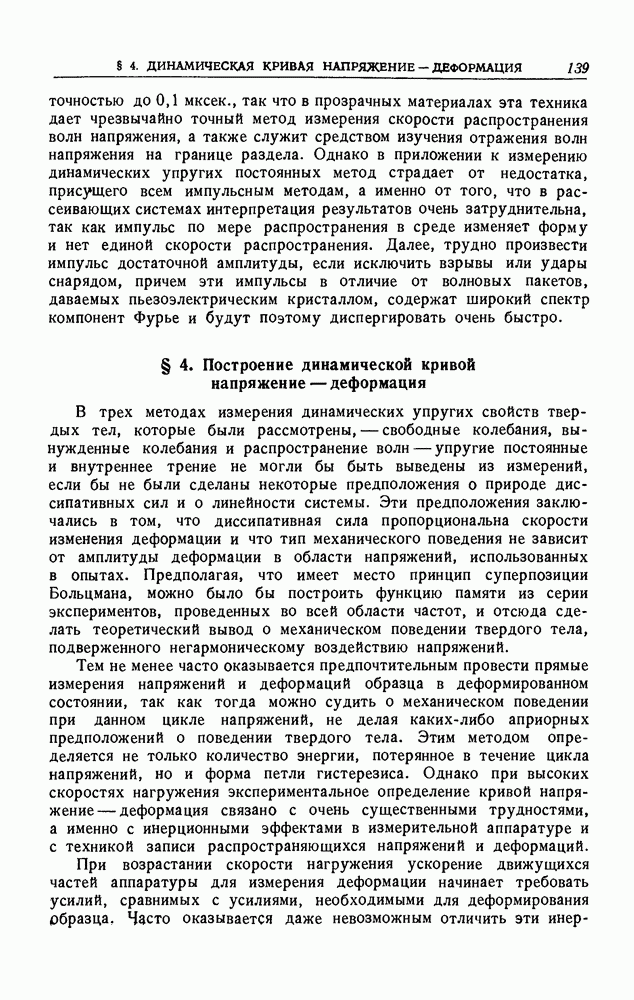 Глава V. ВНУТРЕННЕЕ ТРЕНИЕТеория, описанная в первой части этой монографии, базируется на законе Гука. Уравнения движения твердого тела получаются приравниванием упругим силам произведений масс на ускорения, причем предполагается, что никакие другие силы не играют роли. Поведение многих тел не отличается существенно от вполне упругих при малых деформациях и, как показано в гл. IV, результаты наблюдений часто хорошо согласуются с данными упругой теории. Однако, если материал совершает колебания, часть упругой энергии всегда превращается в тепло вследствие внутреннего трения. Так, когда твердый образец вибрирует, его свободные колебания затухают даже в том случае, когда он изолирован от окружающих предметов. Амплитуда колебания образца при отсутствии внутреннего трения должна была бы безгранично возрастать при воздействии переменной внешней силы, действующей с резонансной частотой образца. Практически амплитуда всегда принимает конечное значение. Для жидкостей и газов диссипативные силы порождаются вязкостью и теплопроводностью, причем эти эффекты могут быть исследованы аналитически. В твердых телах поведение оказывается гораздо более сложным и существенно зависит от природы твердого тела. В настоящее время нет удовлетворительной теории внутреннего трения в твердых телах и требуется накопление экспериментальных данных. § 1. ОпределенияНаиболее прямой метод определения внутреннего трения состоит в вычислении отношения Имеется несколько непрямых методов определения внутреннего трения, причем они связаны с предположением, что восстанавливающие силы пропорциональны амплитуде колебания, тогда как диссипа-тивные силы пропорциональны скорости. Если применить эти условия, то отношение двух последующих амплитуд свободных колебаний будет постоянным, причем натуральный логарифм этого отношения Другой непрямой мерой внутреннего трения служит острота резонансной кривой при вынужденных колебаниях. Если образец нагружается синусоидальной силой заданной амплитуды, частота которой может изменяться, и амплитуда колебаний образца записывается как функция частоты, то график этой зависимости имеет максимум при резонансной частоте Покажем теперь, как получаются соотношения между этими различными определениями внутреннего трения для образца, в котором восстанавливающая упругая сила пропорциональна перемещению, а рассеяние пропорционально скорости. Уравнение движения такого образца можно записать в виде