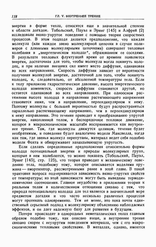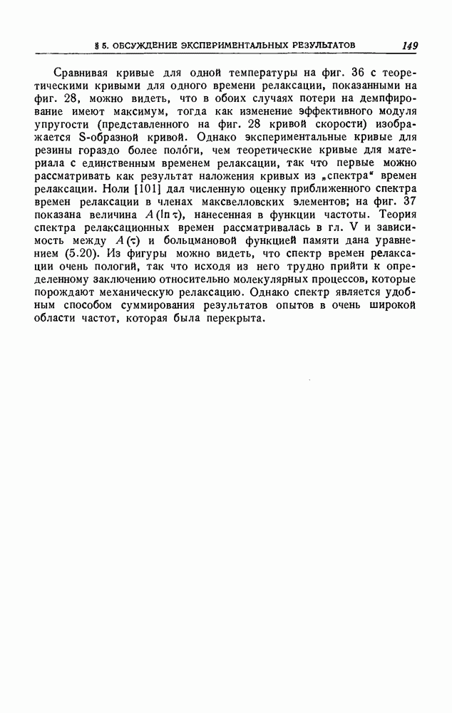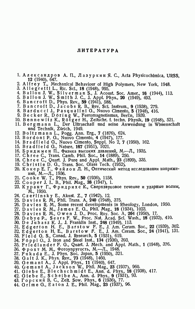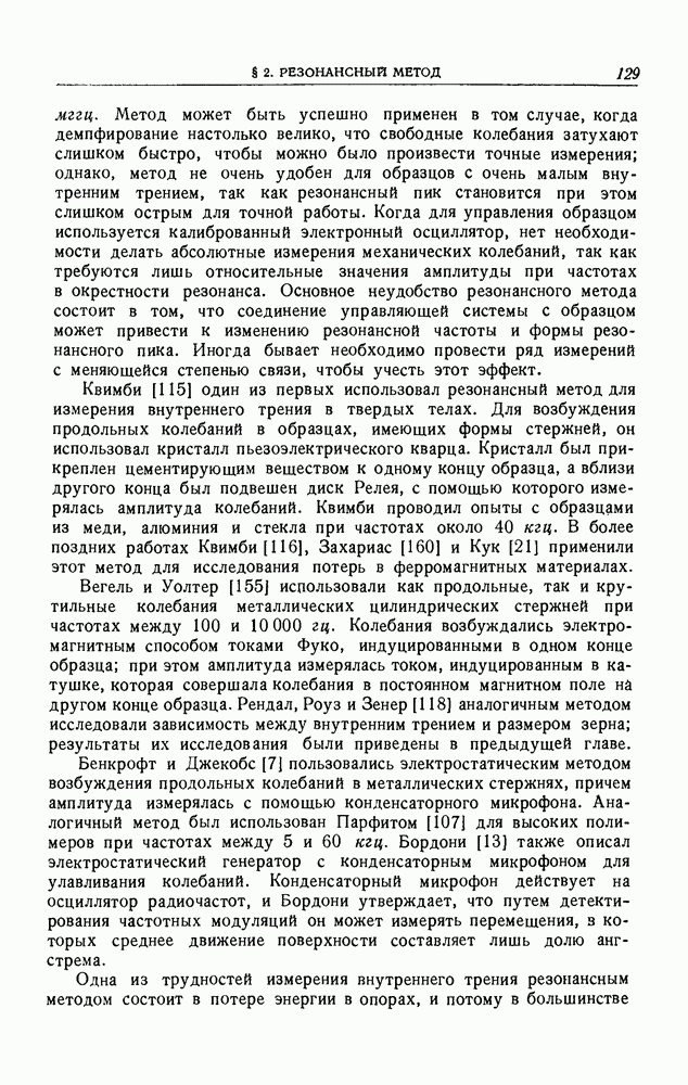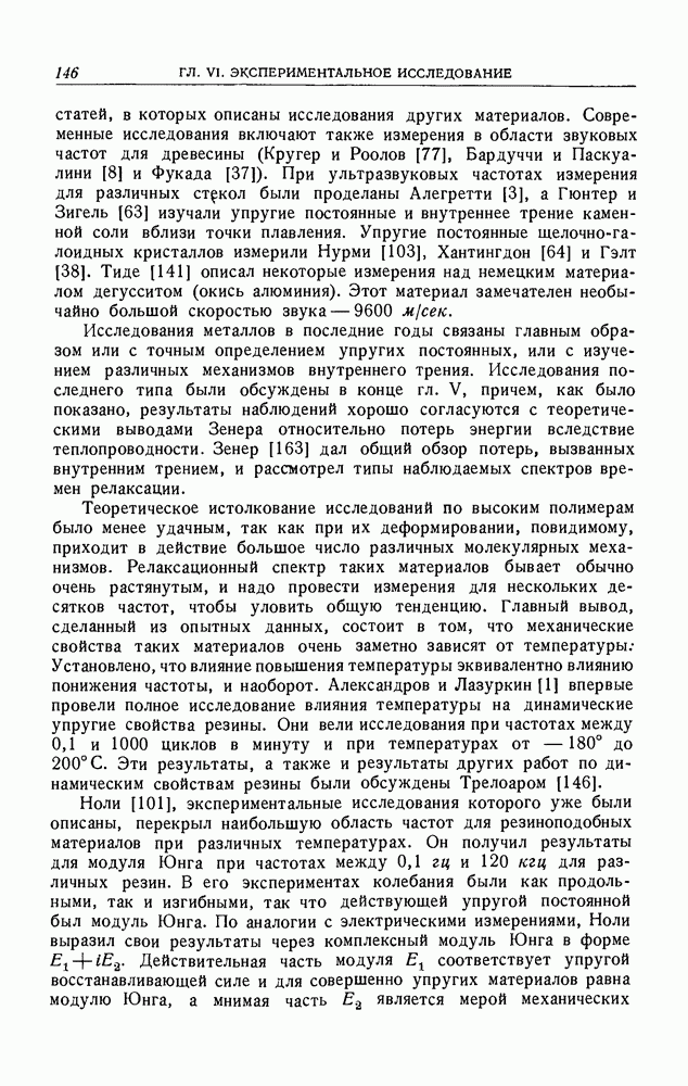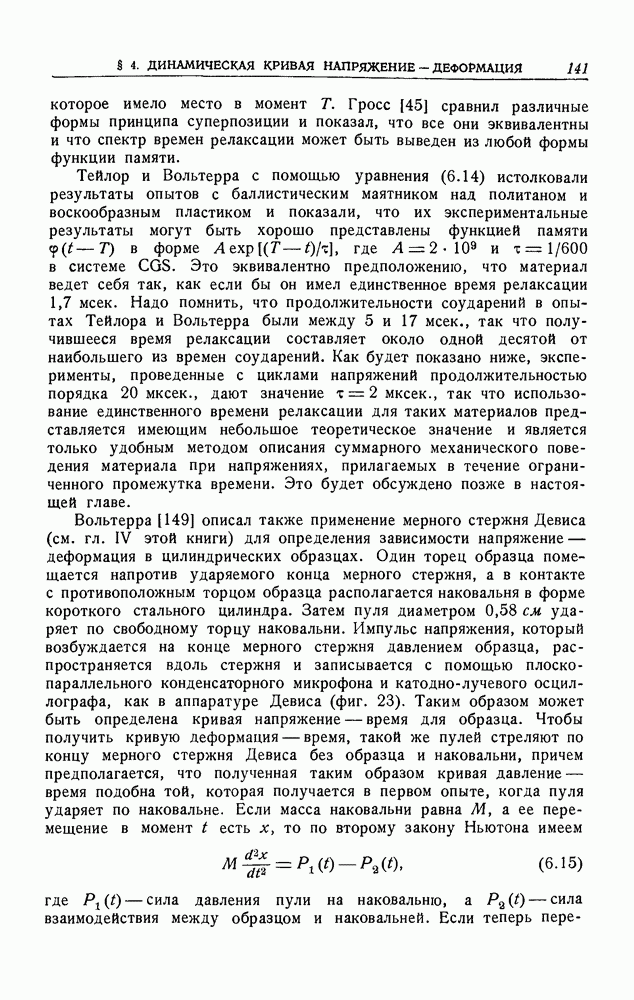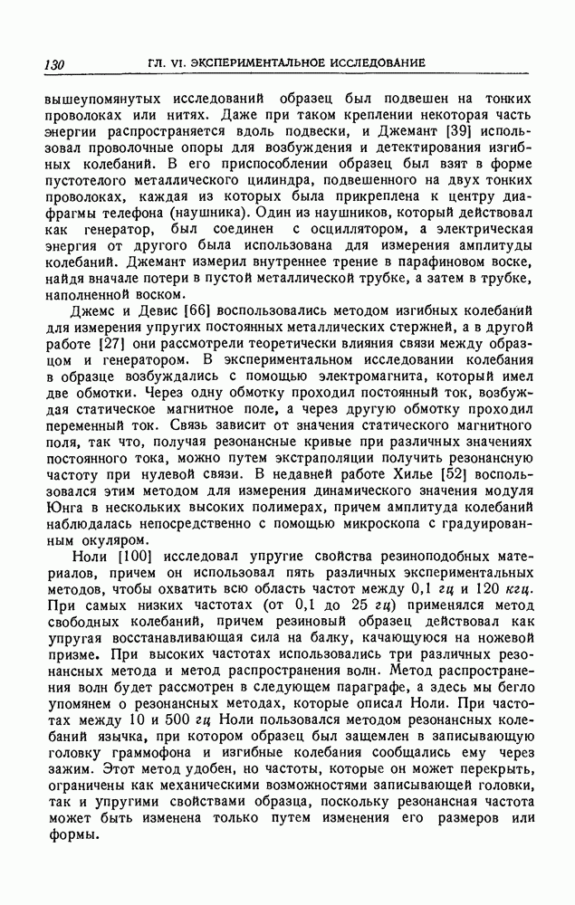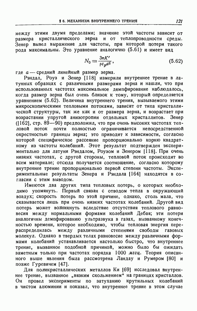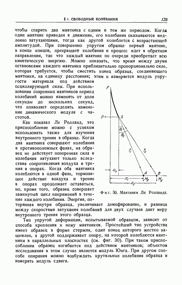 Глава V. ВНУТРЕННЕЕ ТРЕНИЕТеория, описанная в первой части этой монографии, базируется на законе Гука. Уравнения движения твердого тела получаются приравниванием упругим силам произведений масс на ускорения, причем предполагается, что никакие другие силы не играют роли. Поведение многих тел не отличается существенно от вполне упругих при малых деформациях и, как показано в гл. IV, результаты наблюдений часто хорошо согласуются с данными упругой теории. Однако, если материал совершает колебания, часть упругой энергии всегда превращается в тепло вследствие внутреннего трения. Так, когда твердый образец вибрирует, его свободные колебания затухают даже в том случае, когда он изолирован от окружающих предметов. Амплитуда колебания образца при отсутствии внутреннего трения должна была бы безгранично возрастать при воздействии переменной внешней силы, действующей с резонансной частотой образца. Практически амплитуда всегда принимает конечное значение. Для жидкостей и газов диссипативные силы порождаются вязкостью и теплопроводностью, причем эти эффекты могут быть исследованы аналитически. В твердых телах поведение оказывается гораздо более сложным и существенно зависит от природы твердого тела. В настоящее время нет удовлетворительной теории внутреннего трения в твердых телах и требуется накопление экспериментальных данных. § 1. ОпределенияНаиболее прямой метод определения внутреннего трения состоит в вычислении отношения Имеется несколько непрямых методов определения внутреннего трения, причем они связаны с предположением, что восстанавливающие силы пропорциональны амплитуде колебания, тогда как диссипа-тивные силы пропорциональны скорости. Если применить эти условия, то отношение двух последующих амплитуд свободных колебаний будет постоянным, причем натуральный логарифм этого отношения Другой непрямой мерой внутреннего трения служит острота резонансной кривой при вынужденных колебаниях. Если образец нагружается синусоидальной силой заданной амплитуды, частота которой может изменяться, и амплитуда колебаний образца записывается как функция частоты, то график этой зависимости имеет максимум при резонансной частоте Покажем теперь, как получаются соотношения между этими различными определениями внутреннего трения для образца, в котором восстанавливающая упругая сила пропорциональна перемещению, а рассеяние пропорционально скорости. Уравнение движения такого образца можно записать в виде