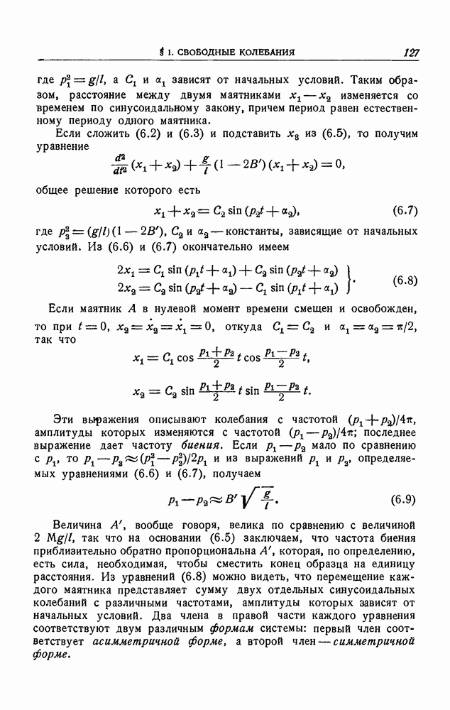 Решение уравнения (5.1) представляется теперь в виде суммы двух членов: частного решения этого уравнения и общего решения уравнения свободных колебаний. Последнее дается формулой (5.3) и соответствует переходному процессу; при возрастании