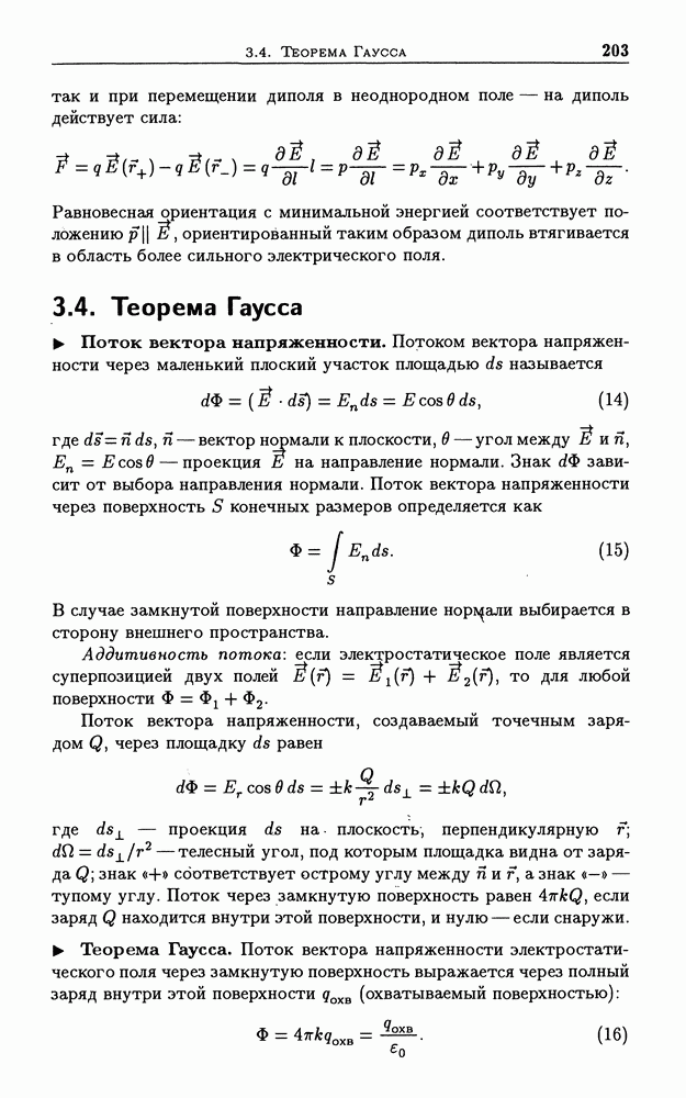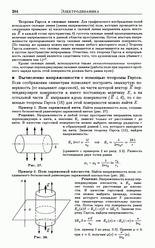 Теорема Гаусса и силовые линии. Для графического изображения полей используют силовые линии (линии напряженности) поля, которые проводятся по следующим правилам: а) касательная к силовой линии направлена вдоль вектора Е в каждой точке пространства; б) густота силовых линий пропорциональна величине напряженности в данной области пространства. Поток вектора напряженности пропорционален числу силовых линий, пронизывающих поверхность. (По такому же правилу можно» ввести линии любого векторного поля.) Теорема Гаусса означает, что силовые линии начинаются и заканчиваются на зарядах, а в пустом пространстве непрерывны. Отметим, что теорема Гаусса и непрерывность силовых линий являются следствием того, что кулоновская сила убывает с расстоянием как