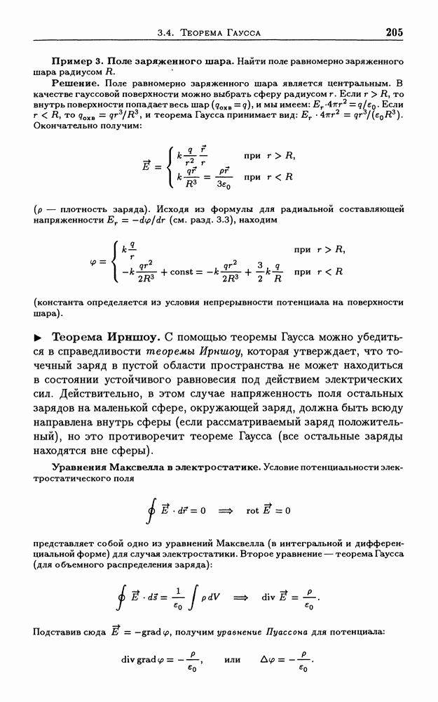 Теорема Ирншоу. С помощью теоремы Гаусса можно убедиться в справедливости теоремы Ирншоу, которая утверждает, что точечный заряд в пустой области пространства не может находиться в состоянии устойчивого равновесия под действием электрических сил. Действительно, в этом случае напряженность поля остальных зарядов на маленькой сфере, окружающей заряд, должна быть всюду направлена внутрь сферы (если рассматриваемый заряд положительный), но это противоречит теореме Гаусса (все остальные заряды находятся вне сферы).
