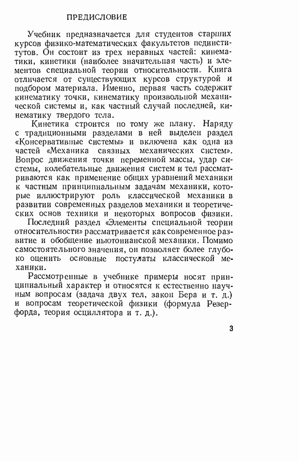 Учебник предназначается для студентов старших курсов физико-математических факультетов пединститутов. Он состоит из трех неравных частей: кинематики, кинетики (наиболее значительная часть) и элементов специальной теории относительности. Книга отличается от существующих курсов структурой и подбором материала. Именно, первая часть содержит кинематику точки, кинематику произвольной механической системы и, как частный случай последней, кинематику твердого тела.