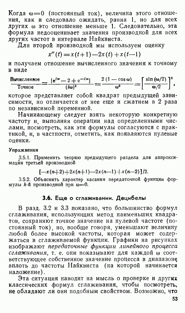 3.6. Еще о сглаживании. ДецибелыВ разд. 3.2 и 3.3 показано, что большинство формул сглаживания, использующих метод наименьших квадратов, сохраняют точное значение на нулевой частоте (постоянный ток), но, вообще говоря, уменьшают величину любой более высокой частоты, которая может содержаться в сглаживаемой функции. Графики на рисунках изображают передаточные функции линейного процесса сглаживания, т. е. они показывают для каждой со соответствующее собственное значение процесса в диапазону вплоть до частоты Найквиста (на которой начинается наложение). Эта ситуация наводит на мысль о проверке и других классических формул сглаживания, чтобы посмотреть, не обладают ли они подобным свойством. Возможно, что более известными из давно применяющихся формул сглаживания являются 15-точечная и 21-точечная формулы сглаживания Спенсера [11, с. 372]
