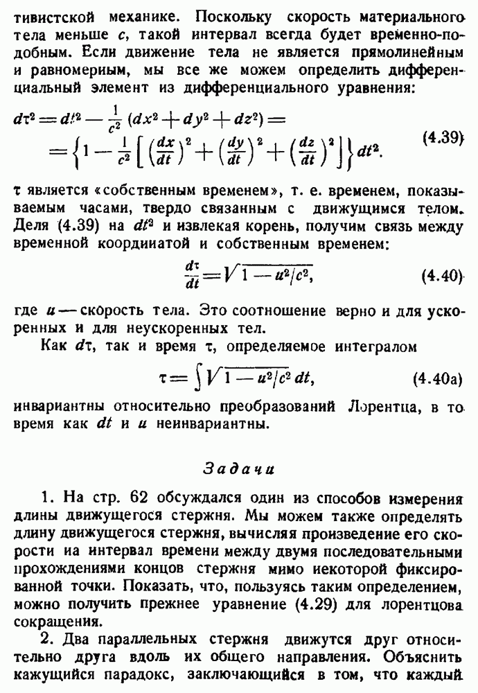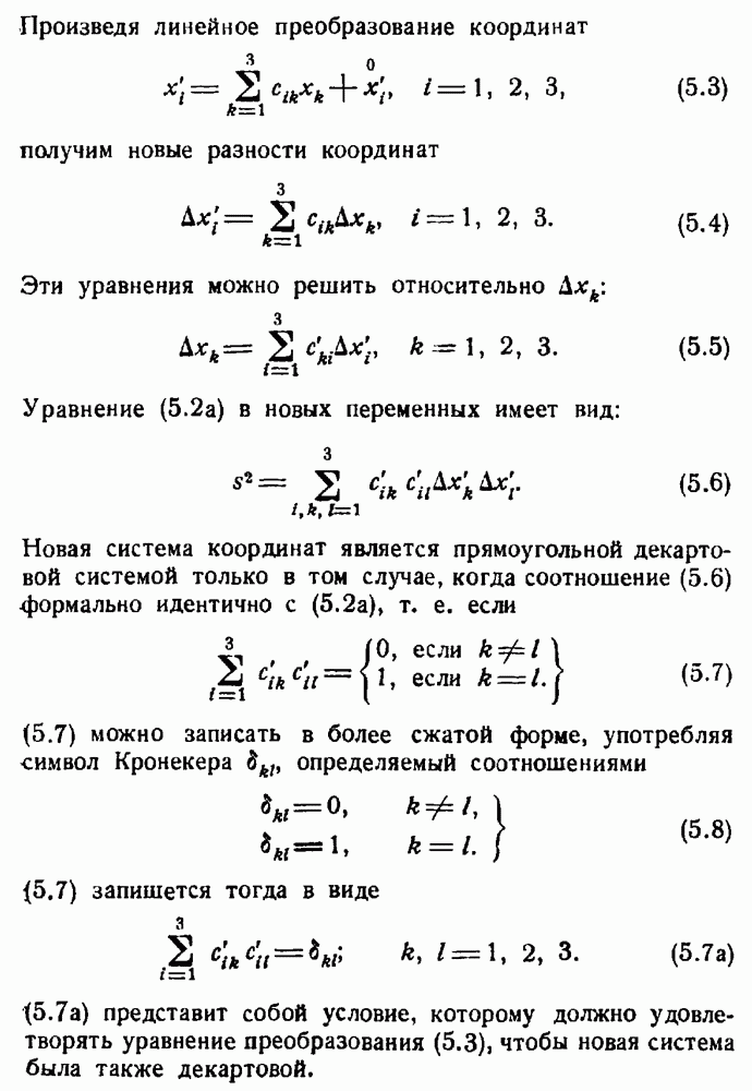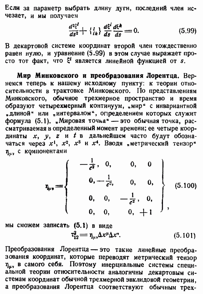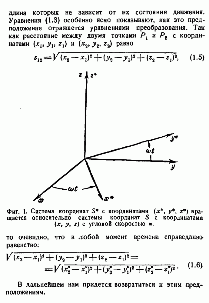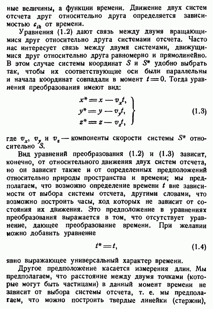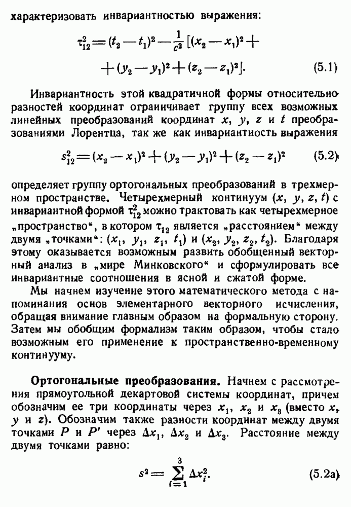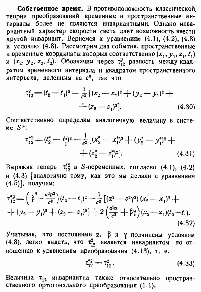 При написании уравнений преобразования мы всегда делали два предположения, на которые, впрочем, не всегда обращали особое внимание: именно, что существует универсальное время t, определенное независимо от системы координат или системы отсчета, и что расстояние между двумя одновременными событиями является инвариантом, значение которого не зависит от выбора системы координат.