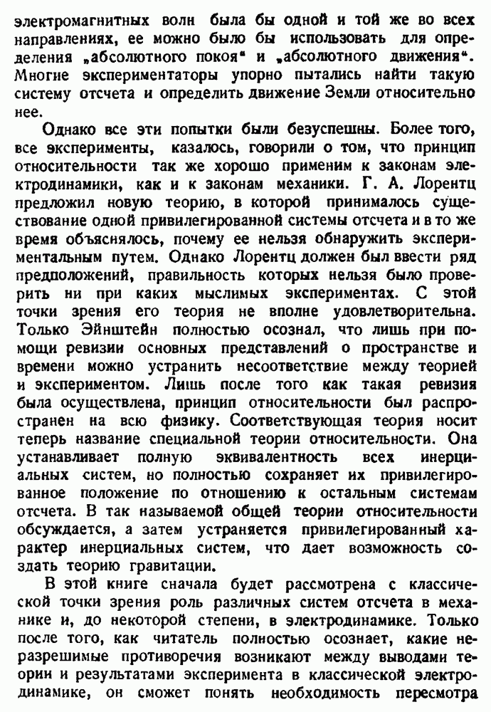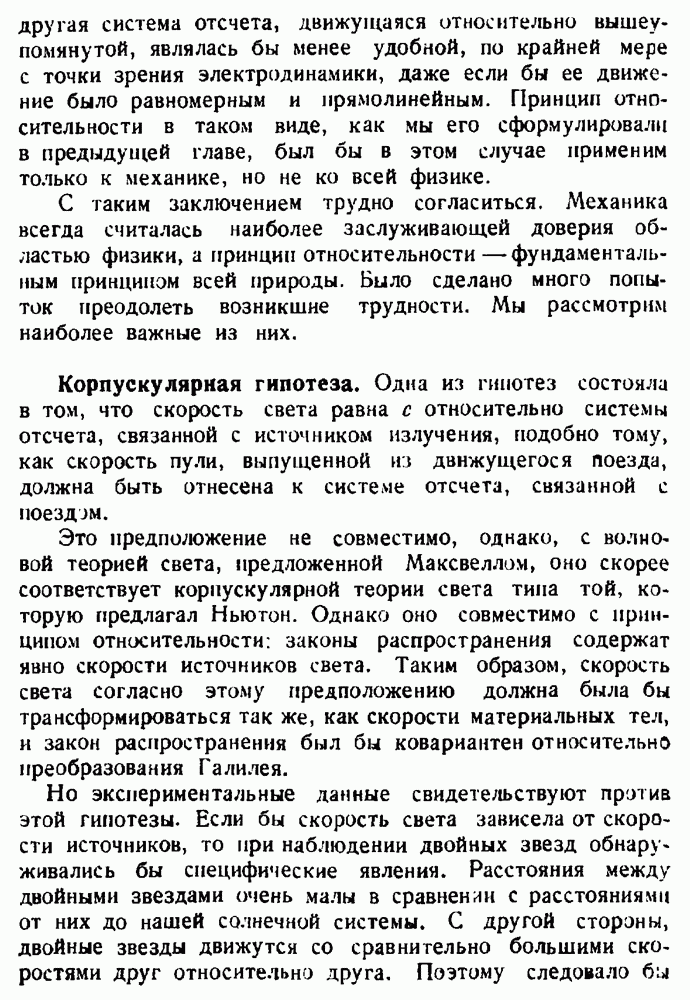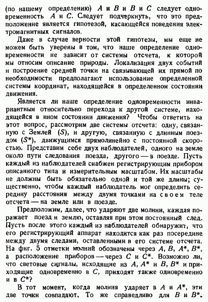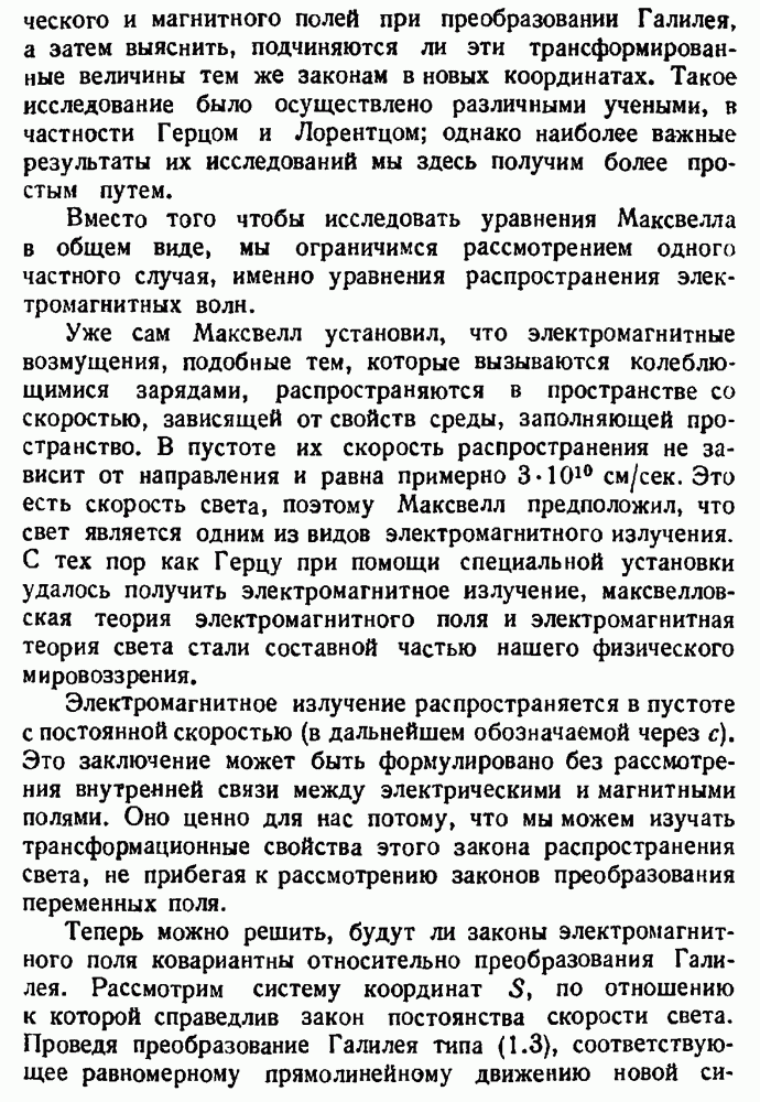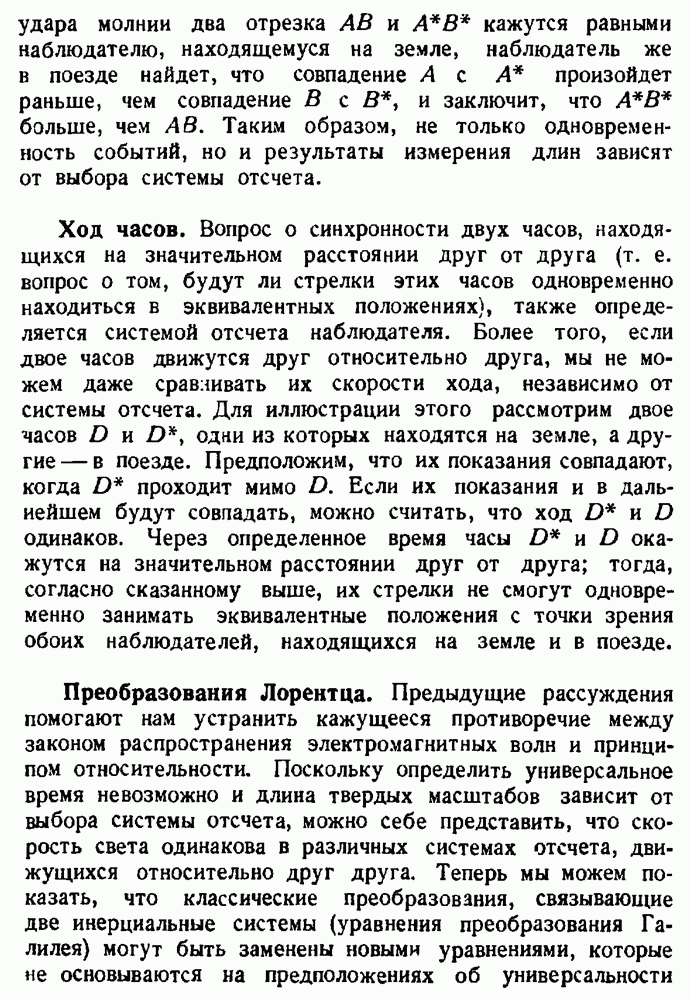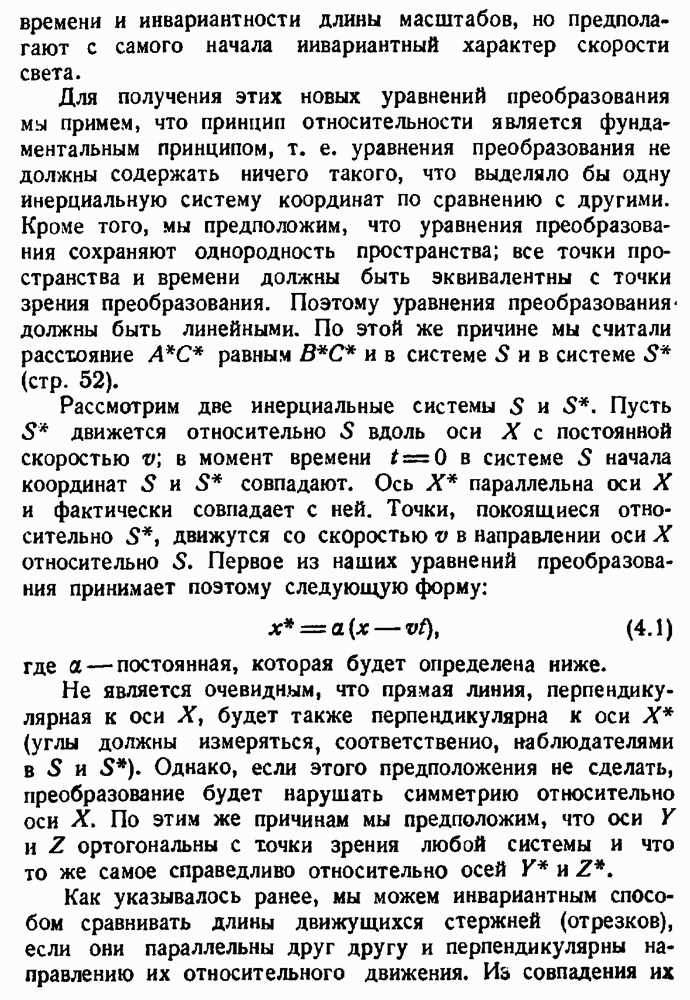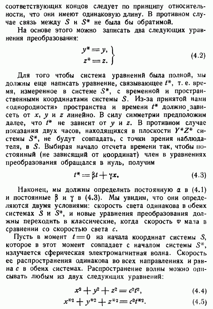 В противоположность этому Эйнштейн истолковал результаты экспериментов как решающее доказательство того, что принцип относительности справедлив в электродинамике так же, как и в механике. Поэтому он подверг анализу уравнения преобразования Галилея и постарался видоизменить их таким образом, чтобы они стали совместимы с принципом относительности в оптике. Мы воспроизведем теперь этот анализ с целью получения новых законов преобразования.