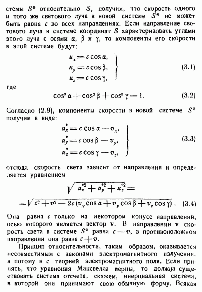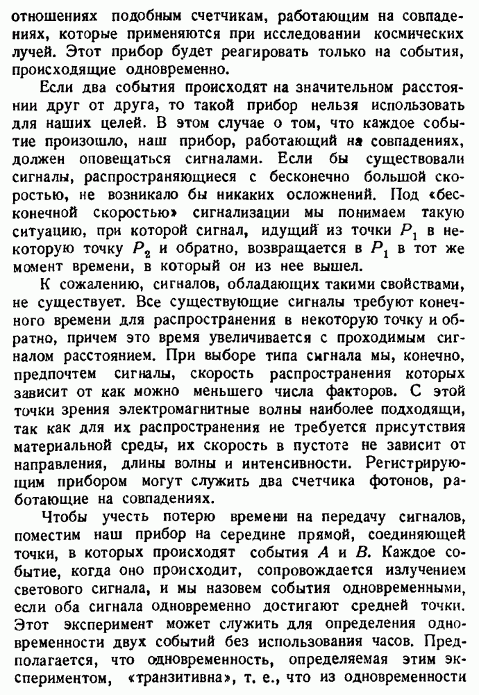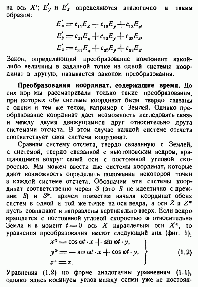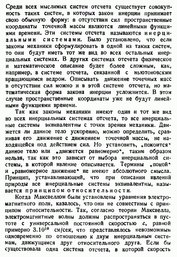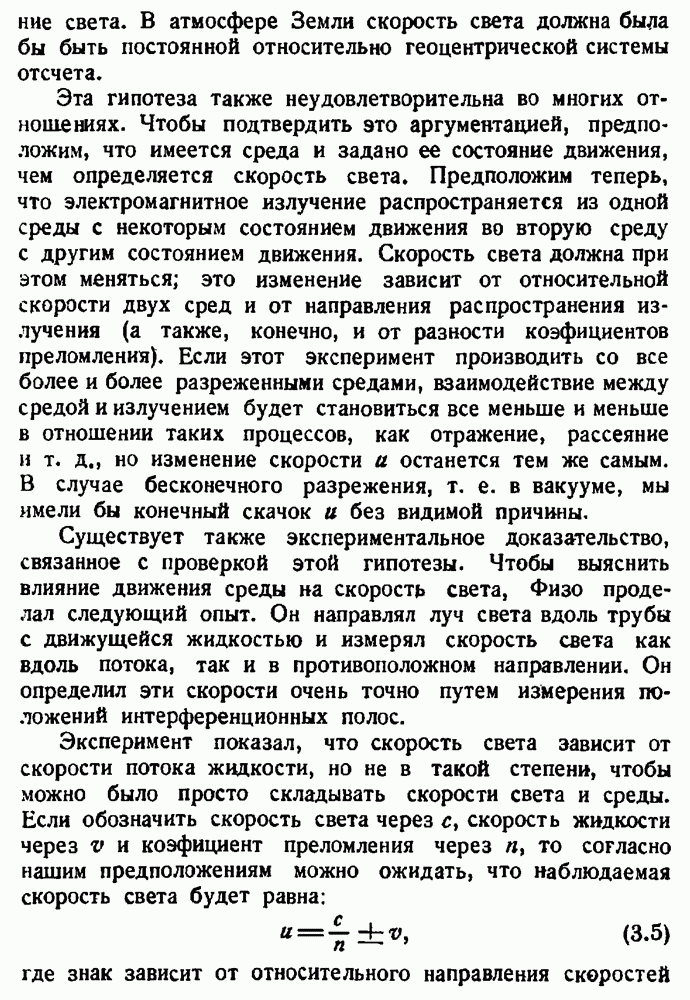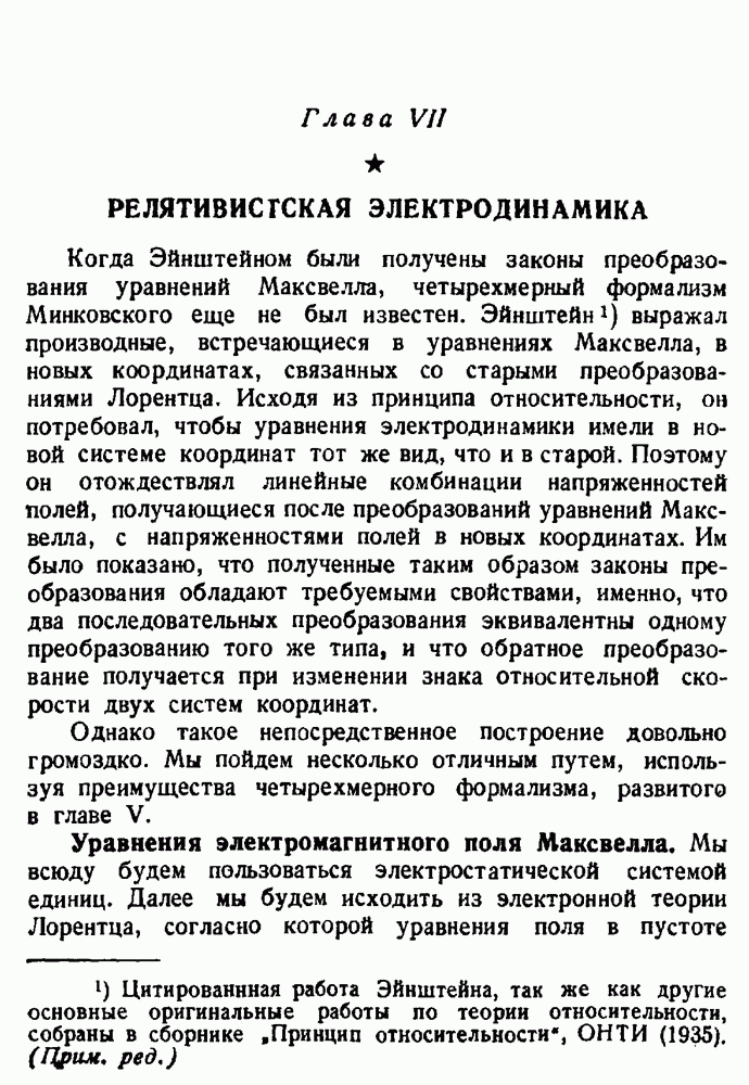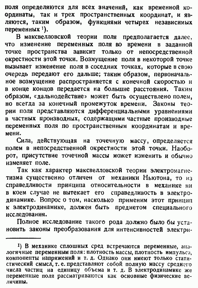 В противоположность этому Эйнштейн истолковал результаты экспериментов как решающее доказательство того, что принцип относительности справедлив в электродинамике так же, как и в механике. Поэтому он подверг анализу уравнения преобразования Галилея и постарался видоизменить их таким образом, чтобы они стали совместимы с принципом относительности в оптике. Мы воспроизведем теперь этот анализ с целью получения новых законов преобразования.