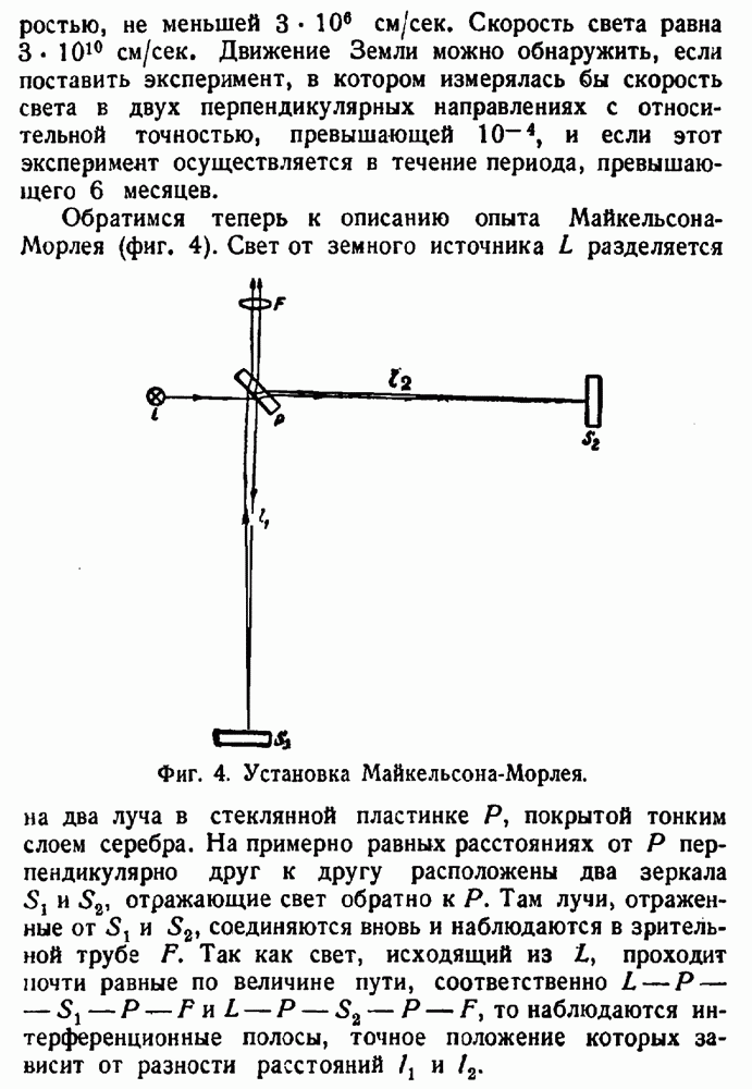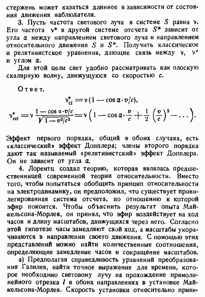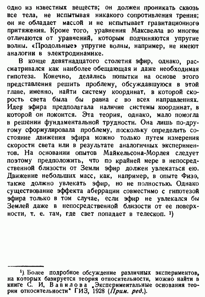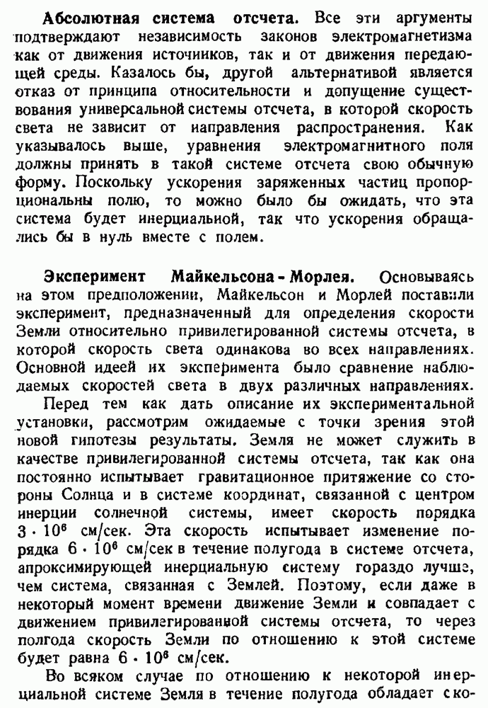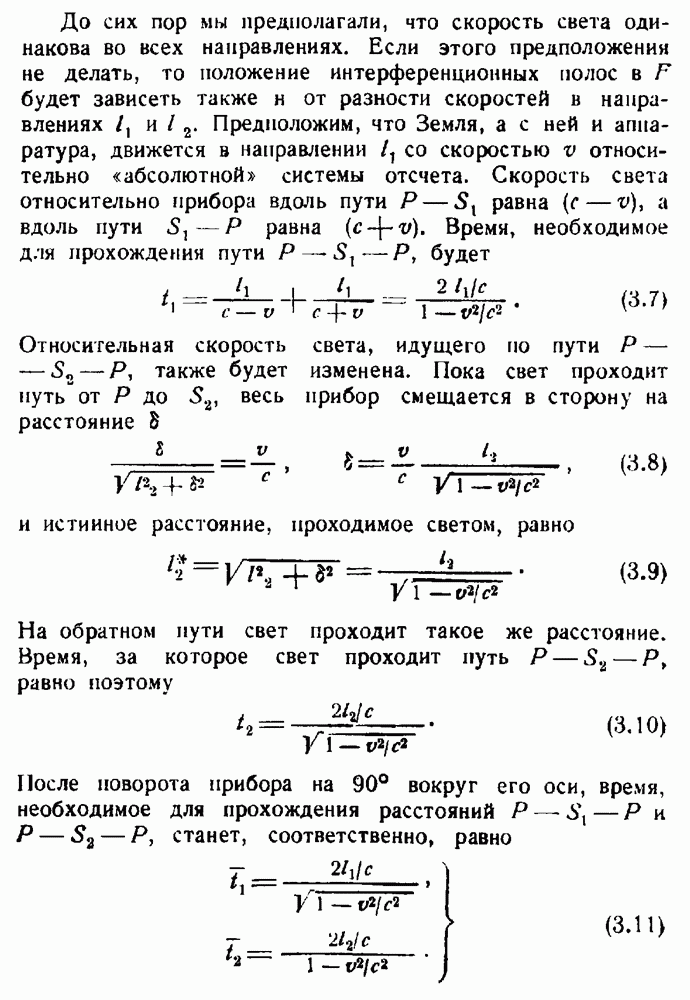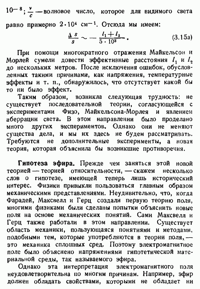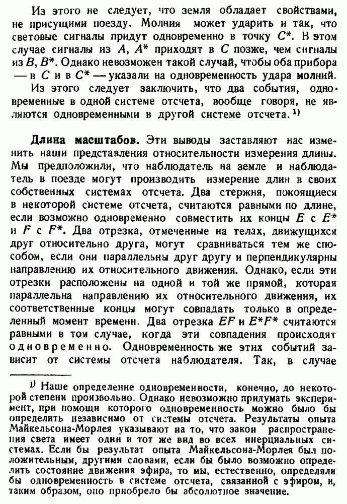 Один из этих ожидаемых эффектов второго порядка заключается в том, что в системе, движущейся относительно эфира, световой луч будет проходить некоторое расстояние в оба конца (т. е. туда и обратно), в направлении, параллельном движению системы, за большее время, чем то же расстояние в перпендикулярном направлении. Опыт Майкельсона-Морлея предназначался для измерения этого эффекта. Чтобы объяснить отрицательный результат эксперимента, Фицжеральд и Лорентц предположили, что масштабы и другие «твердые» тела, движущиеся сквозь эфир, сокращаются в направлении движения как раз в таком отношении, чтобы скомпенсировать изменения времени распространения света. Эта гипотеза полностью сохраняет привилегированный характер определенной системы отсчета (эфира). Отрицательный результат опыта Майкельсона-Морлея приписывается при этом не существованию оптического принципа относительности, а неблагоприятному сочетанию