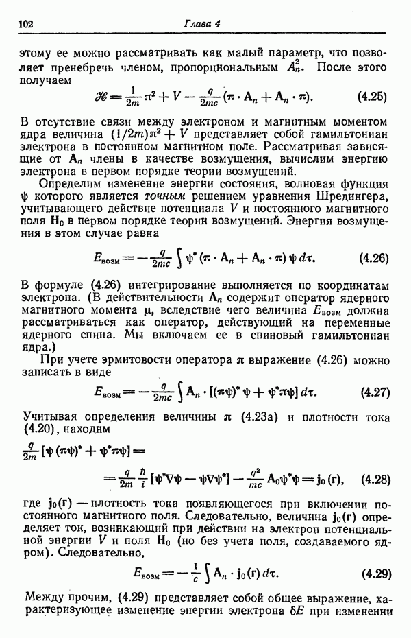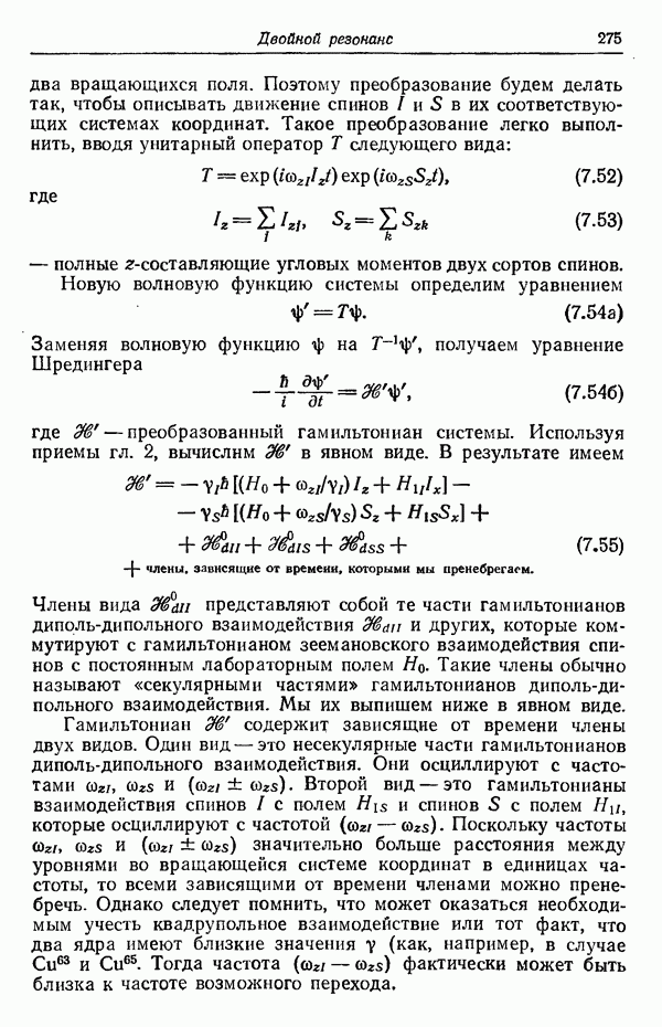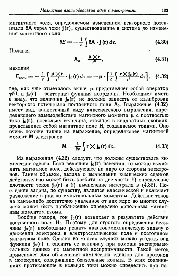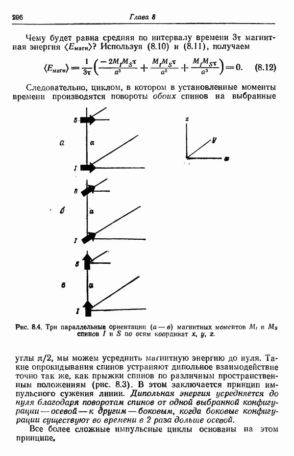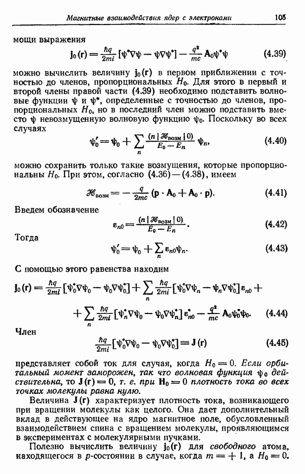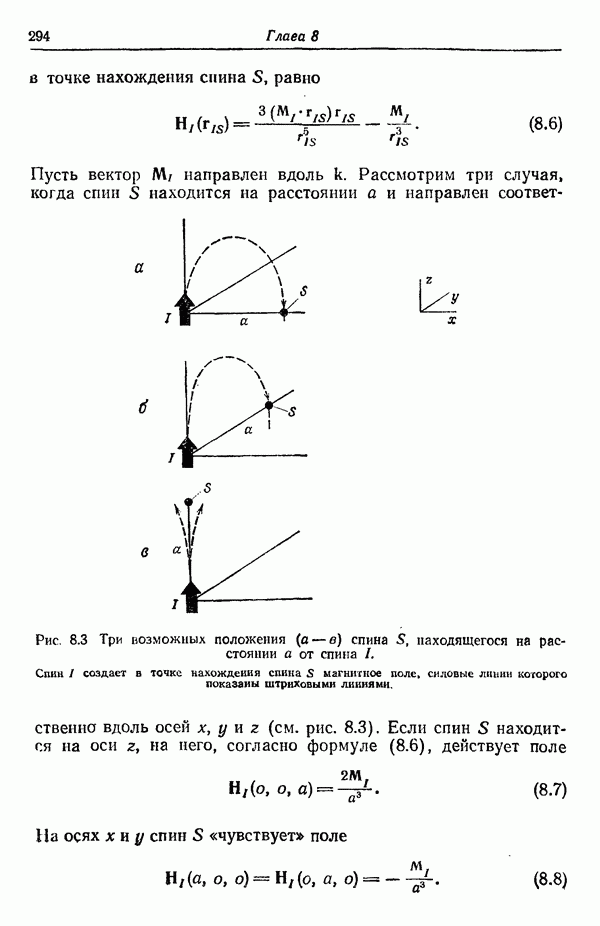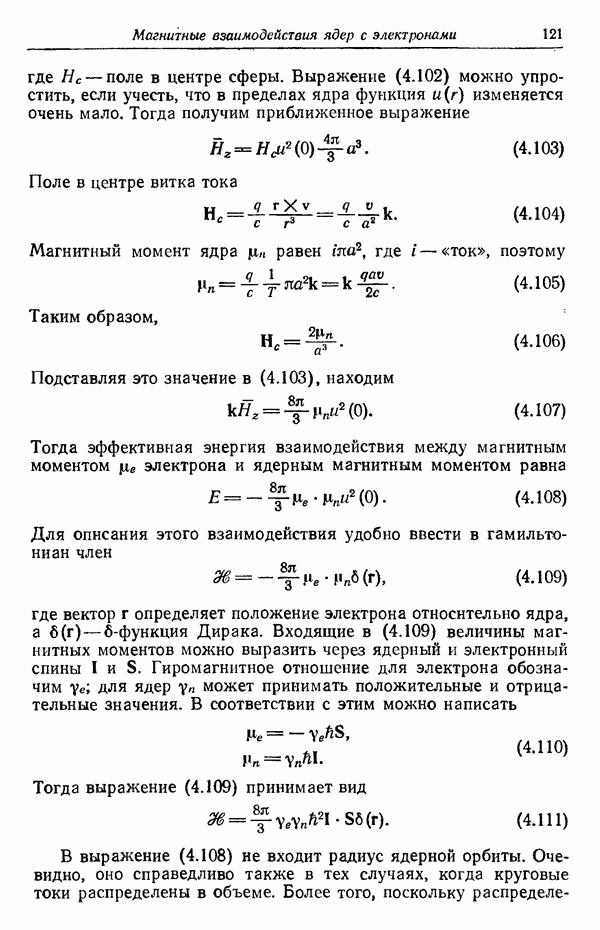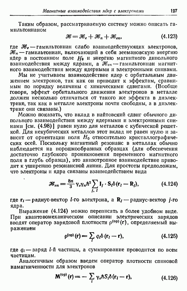 Это взаимодействие обращается в нуль при усреднении по ориентациям молекулы, так как обусловленная спинами намагниченность сама зависит от ориентации молекулы относительно ядерного спина. Взаимодействие (4.212) зависит от спинов так же, как обычное прямое диполь-дипольное взаимодействие. Чтобы подчеркнуть это сходство, такое взаимодействие часто называют «псевдодипольным». С другой стороны, взаимодействие