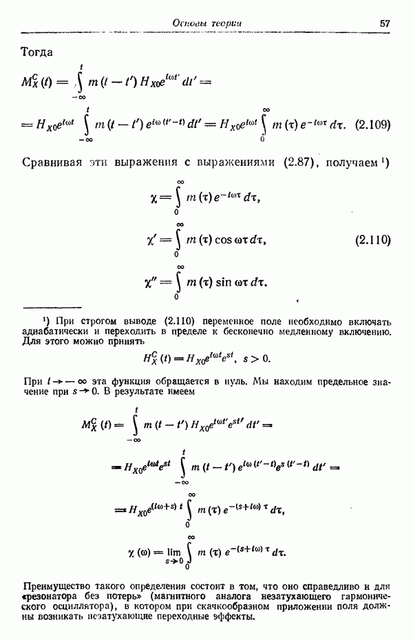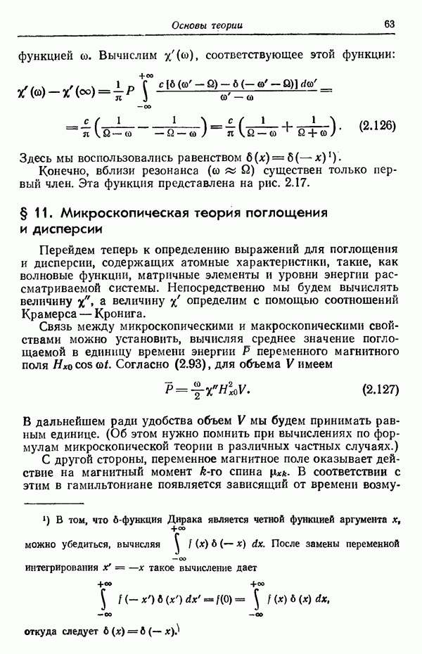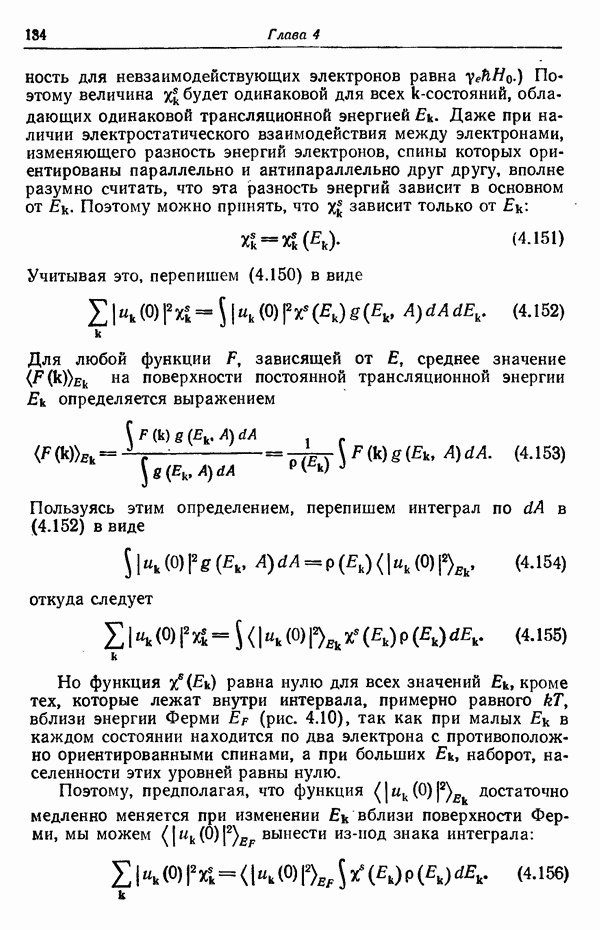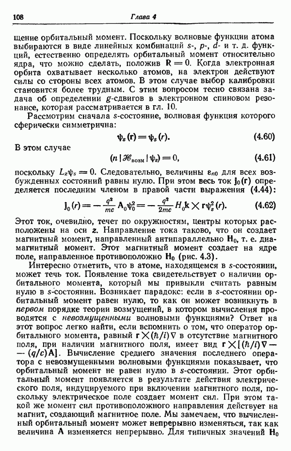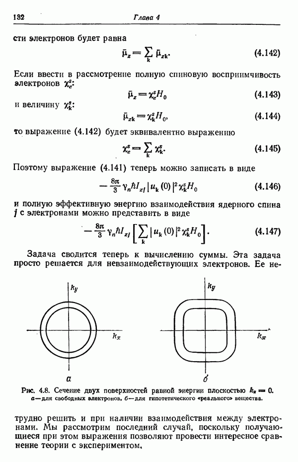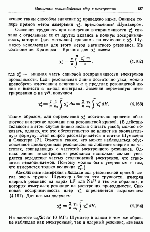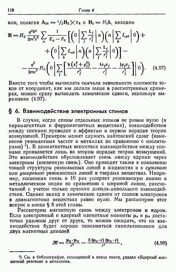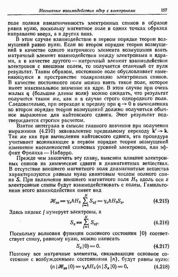 Поскольку при вычислениях во втором порядке теории возмущений основное и возбужденное состояния должны быть различными, из соотношения (4.124) мы видим, что компоненты с Найтовские сдвиги можно вычислить двумя различными способами. В первом способе предполагается, что постоянное магнитное поле однородно и вычисляется энергия взаимодействия поляризованного электрона в первом порядке теории возмущений. Второй способ более сложный. При вычислениях по второму способу предполагается, что постоянное магнитное поле осциллирует в пространстве с волновым вектором поле полная намагниченность электронных спинов в образце равна нулю, поскольку магнитное поле в одних точках образца направлено вверх, а в других вниз. В этом случае взаимодействие в первом порядке теории возмущений равно нулю. Если во втором порядке теории возмущений в качестве одного матричного элемента возмущения взять матричный элемент взаимодействия между электронами и ядрами, а в качестве другого — матричный элемент взаимодействия электронов с внешним полем, то получается отличный от нуля результат. Таким образом, постоянное поле обусловливает изменяющуюся в пространстве поляризацию электронных спинов. В качестве постоянного поля можно взять такое поле, которое имеет максимальное значение на ядре. В этом случае при очень малых Взятие интеграла в смысле главного значения при получении выражения (4.210) эквивалентно предельному переходу Прежде чем закончить эту главу, выясним влияние электронных спинов на химические сдвиги в диамагнитных веществах. В отсутствие внешнего магнитного поля диамагнитные вещества характеризуются равным нулю квантовым числом полного спина