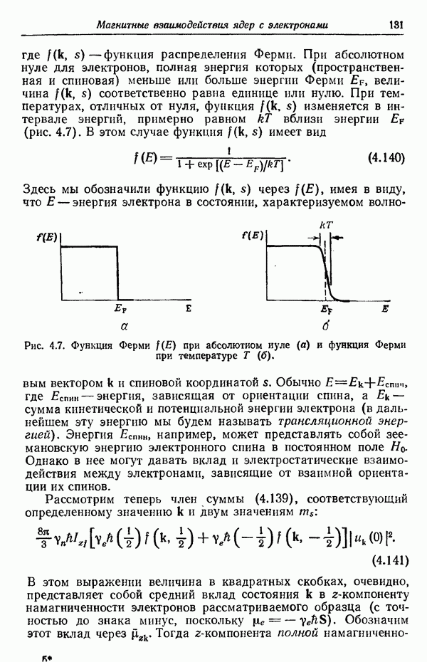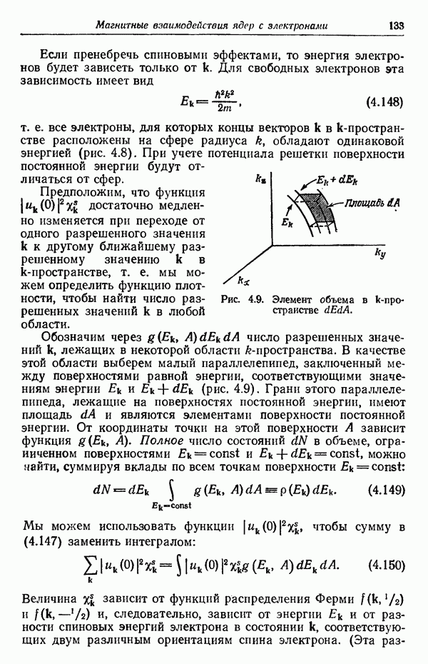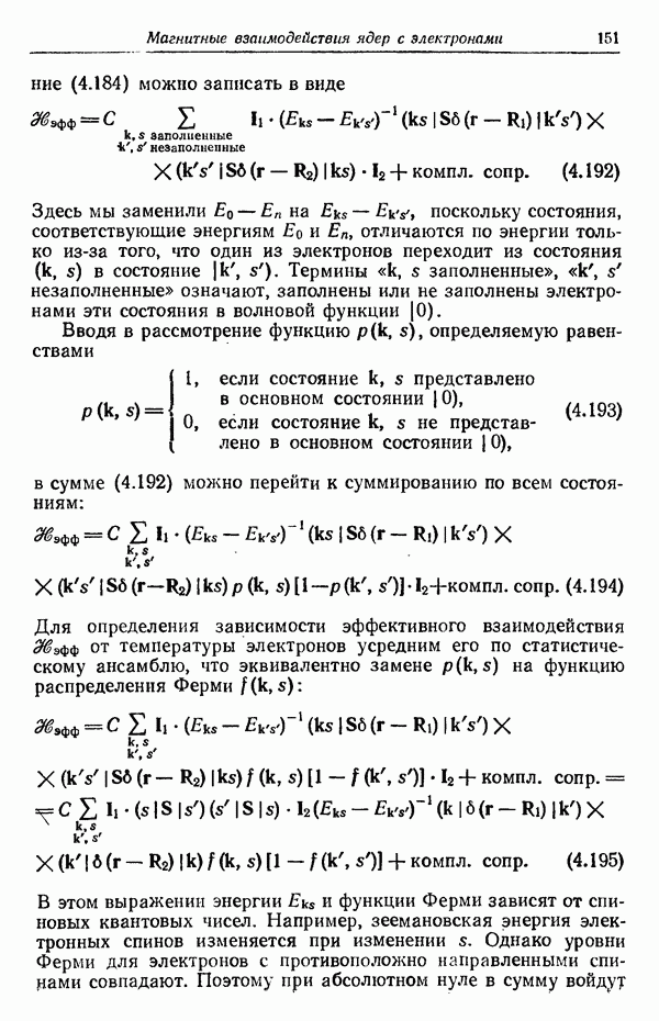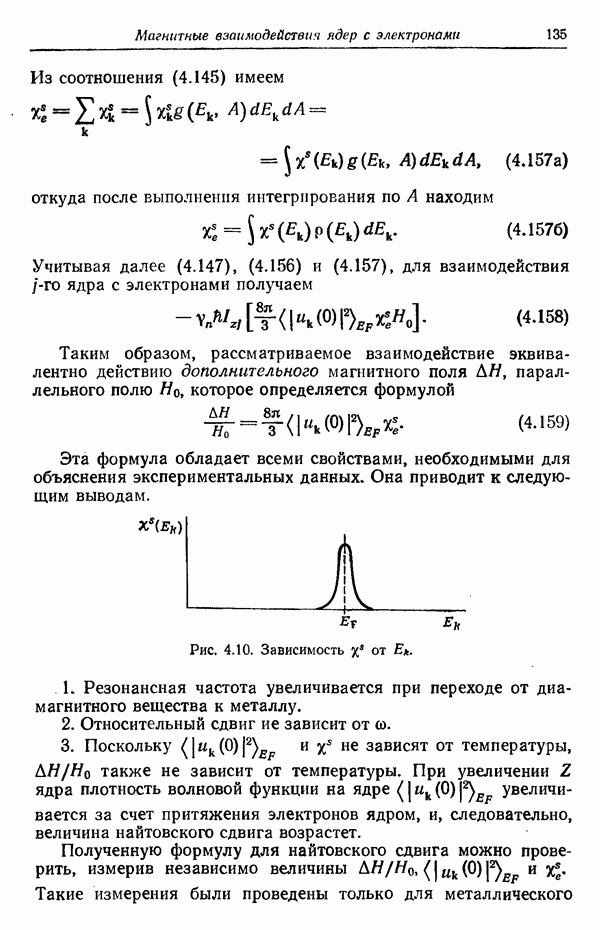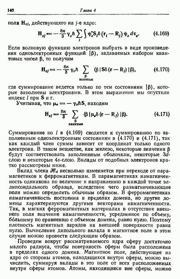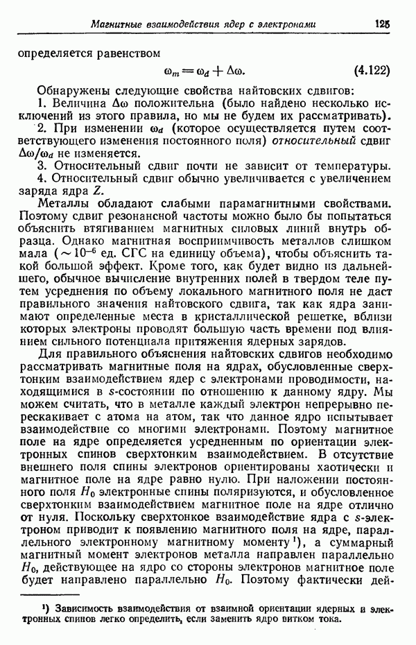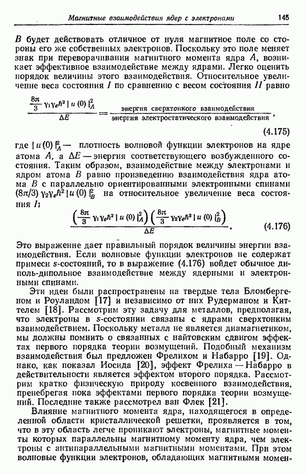 Это выражение дает правильный порядок величины энергии взаимодействия. Если волновые функции электронов не содержат примеси Эти идеи были распространены на твердые тела Бломбергеном и Роуландом [17] и независимо от них Рудерманом и Киттелем [18]. Рассмотрим эту задачу для металлов, предполагая, что электроны в Влияние магнитного момента ядра, находящегося в определенной области кристаллической решетки, проявляется в том, что в эту область легче проникают электроны, магнитные моменты которых параллельны магнитному моменту ядра, чем электроны с антипараллельными магнитными моментами. При этом волновые функции электронов, обладающих магнитными моментами, параллельными магнитному моменту ядра, искажаются и увеличиваются вблизи ядра. Это искажение осуществляется за счет примешивания к