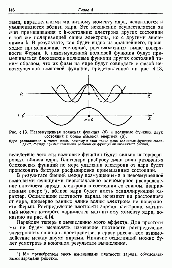 Рис. 4.13. Невозмущенная волновая функция Благодаря разбросу длин волн различных блоховских функций по мере удаления электрона от ядра будет происходить быстрая расфазировка примешанных состояний. В результате биений между возмущенными и невозмущенной волновыми функциями первоначально равномерное распределение плотности заряда электрона в состоянии со спином, направленным вверх, вблизи ядра будет иметь осциллирующий характер. Осцилляции плотности заряда исчезают на расстояниях от ядра, примерно равных длине волны электрона на поверхности Ферми. Распределение плотности заряда электрона, магнитный момент которого параллелен магнитному моменту ядра, показано на рис. 4.14. Перейдем теперь к вычислению этого эффекта. Для простоты мы не будем вычислять изменение плотности распределения электронных спинов в пространстве, а сразу рассчитаем взаимодействие между двумя ядрами. Наличие осцилляций можно будет усмотреть в конечном результате вычисления. Рассмотрим электронно-ядерное взаимодействие Зйеп