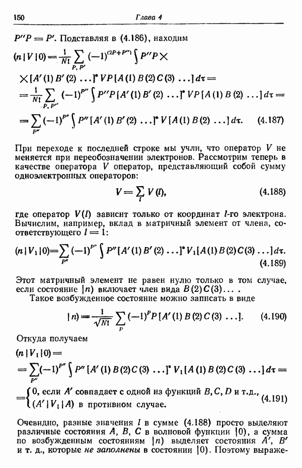 Очевидно, оператор перестановок будет обращать в нуль любую функцию вида (4.185), у которой А и В тождественно равны. Рассмотрим матричные элементы симметричного относительно перестановок координат электронов оператора возмущения V: