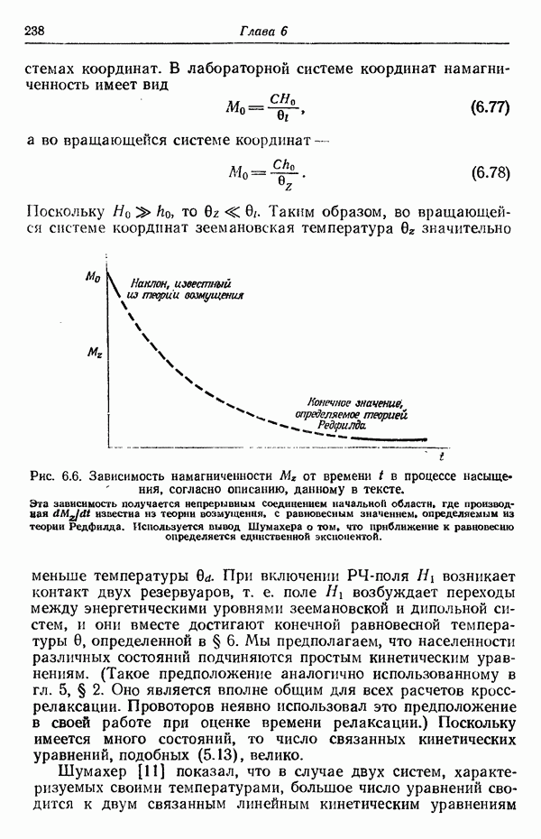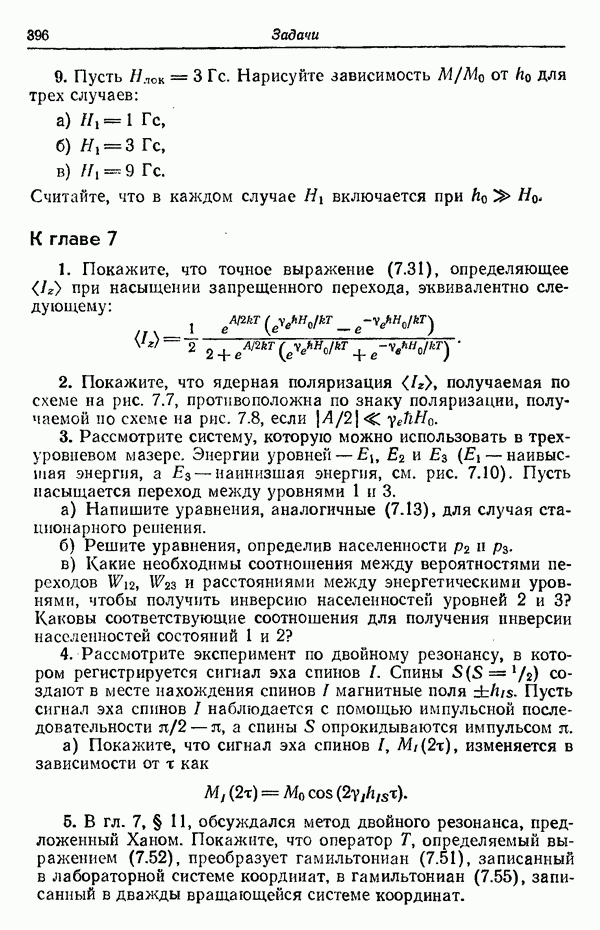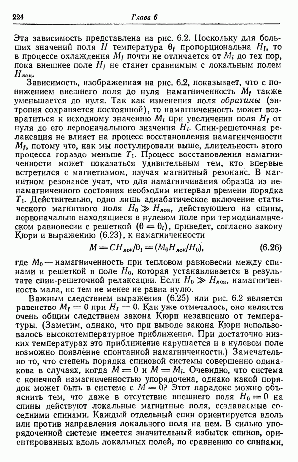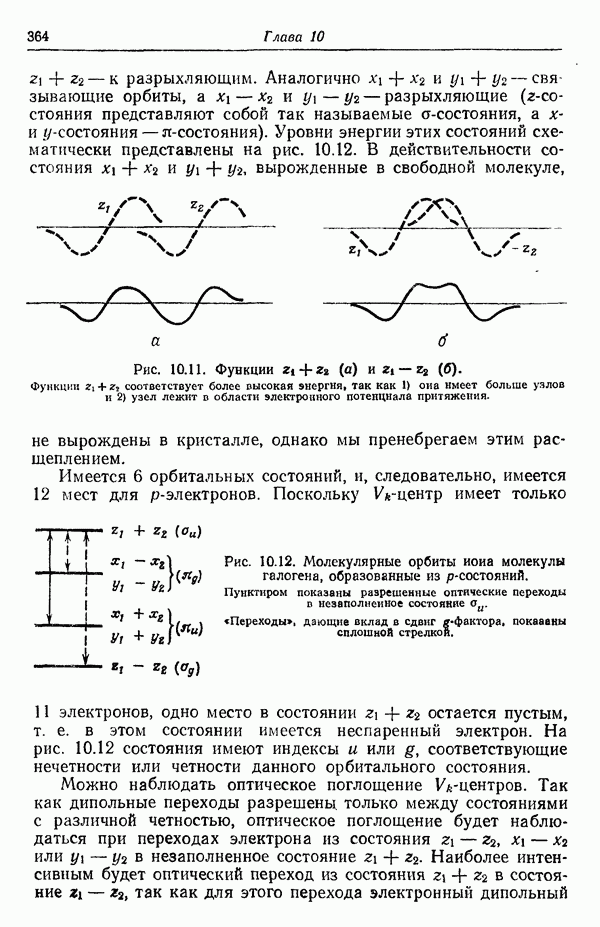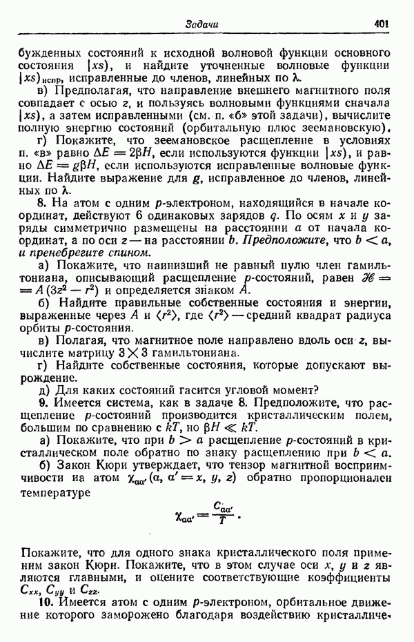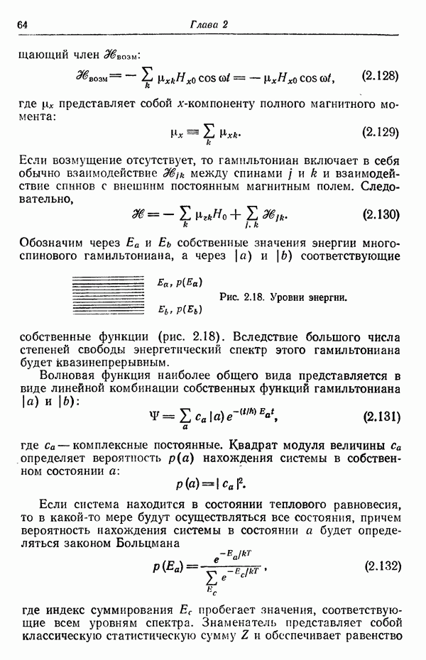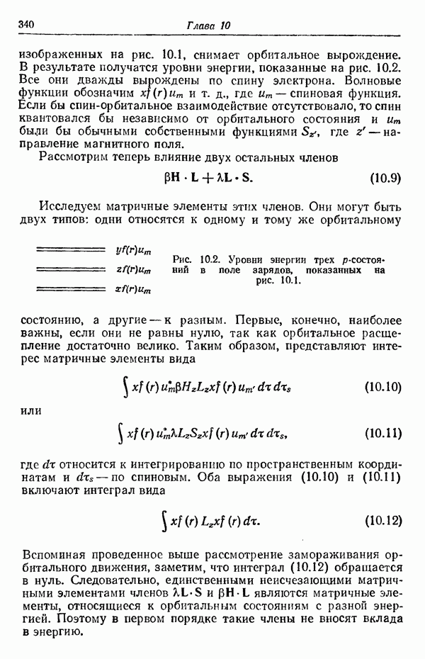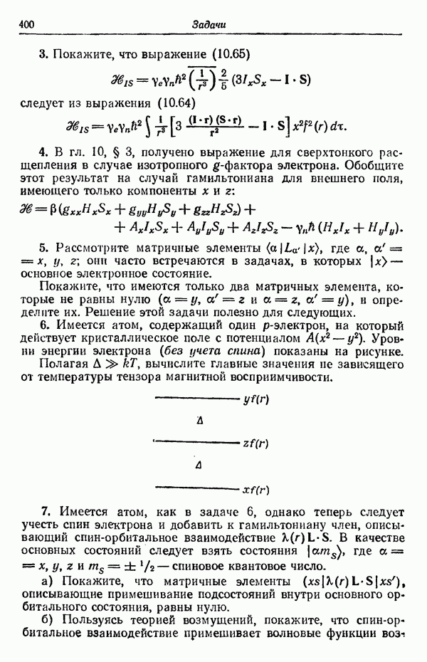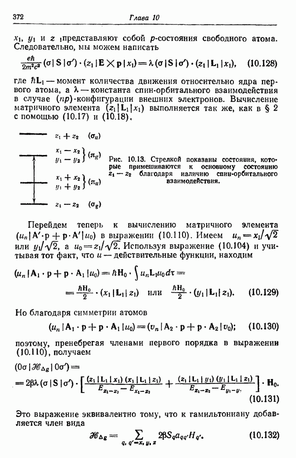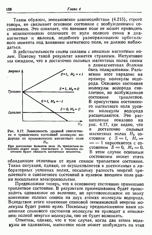 Рис. 4.17. Зависимость уровней сииглетного и триплетного состояний молекулы водорода от приложенного магнитного поля Н. При достаточно большом поле Предположим теперь, что к основному состоянию примешано триплетное состояние. В результате примешивания будет происходить одинаковое по величине, но противоположное по знаку изменение полных спинов на двух атомах молекулы водорода. Вследствие этого изменение спиновой зеемановской энергии молекулы будет равно нулю. Поскольку предположенное нами изменение спинового состояния молекулы не приводит к понижению полной энергии молекулы, оно не будет возникать. Отметим, однако, что в том случае, когда два атома молекулы не одинаковы, магнитное поле может возбуждать на этих атомах различные орбитальные моменты, которые вследствие спин-орбитального взаимодействия индуцируют спиновую поляризацию. Так, в молекуле ЛИТЕРАТУРА(см. скан)